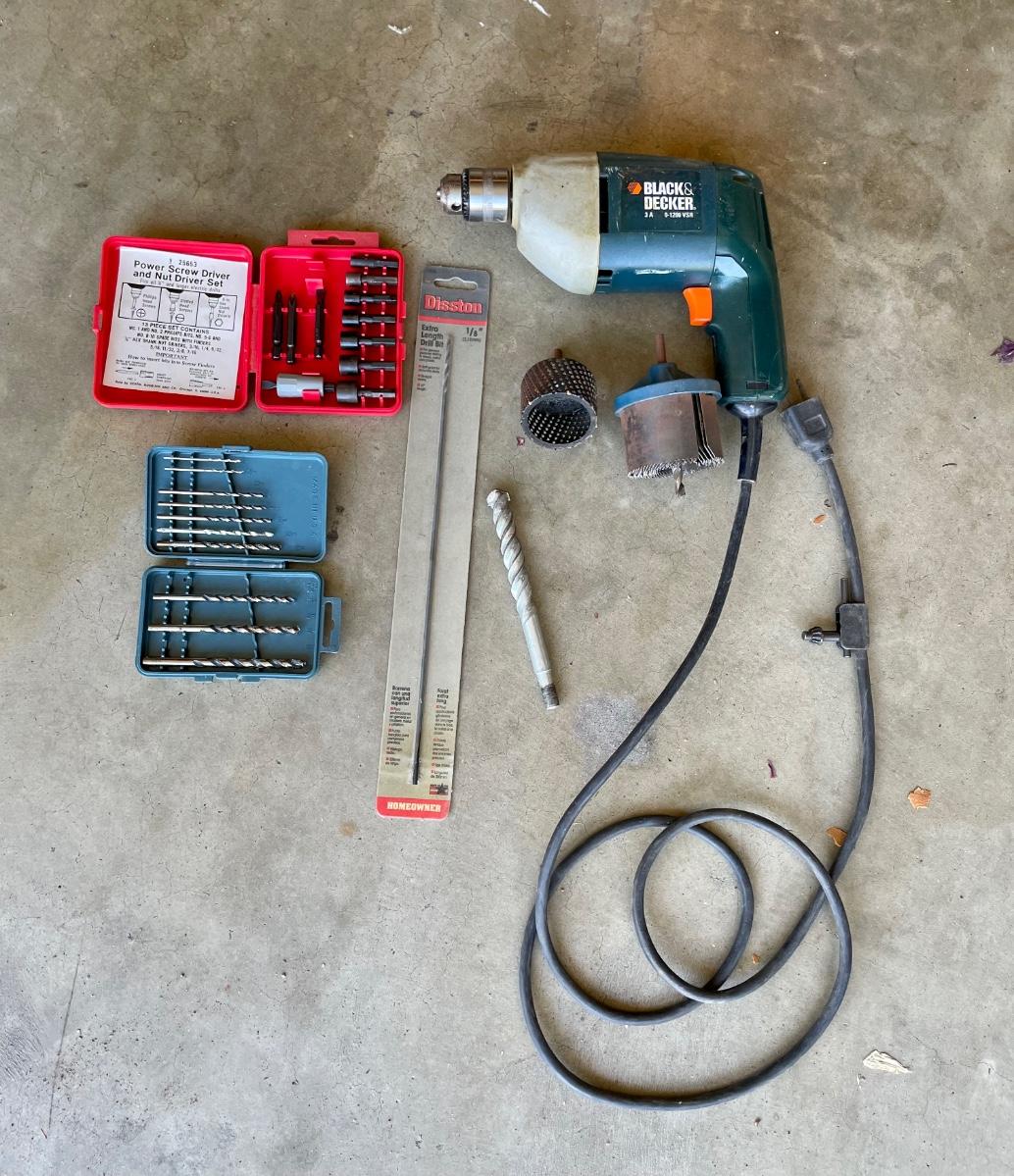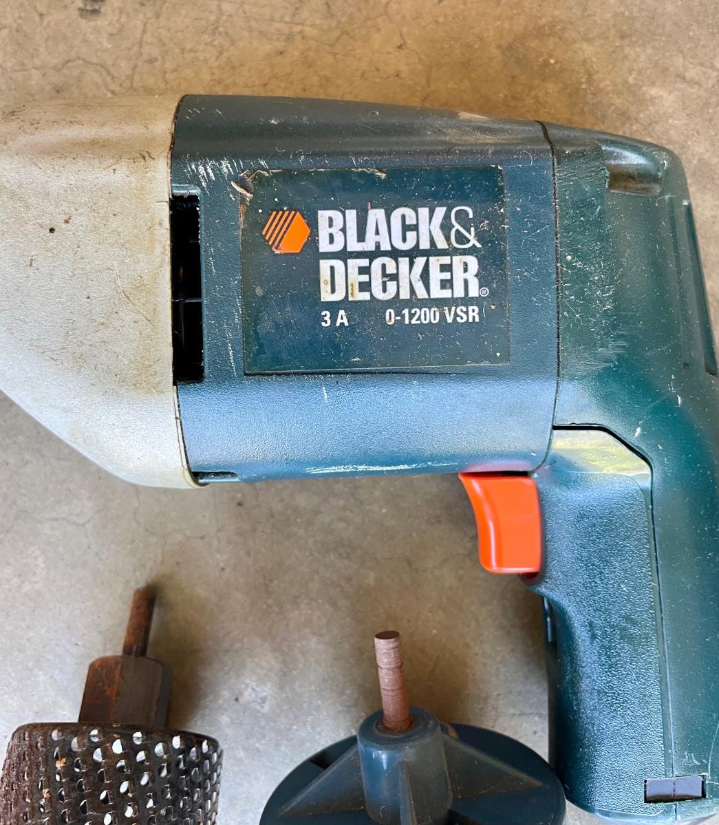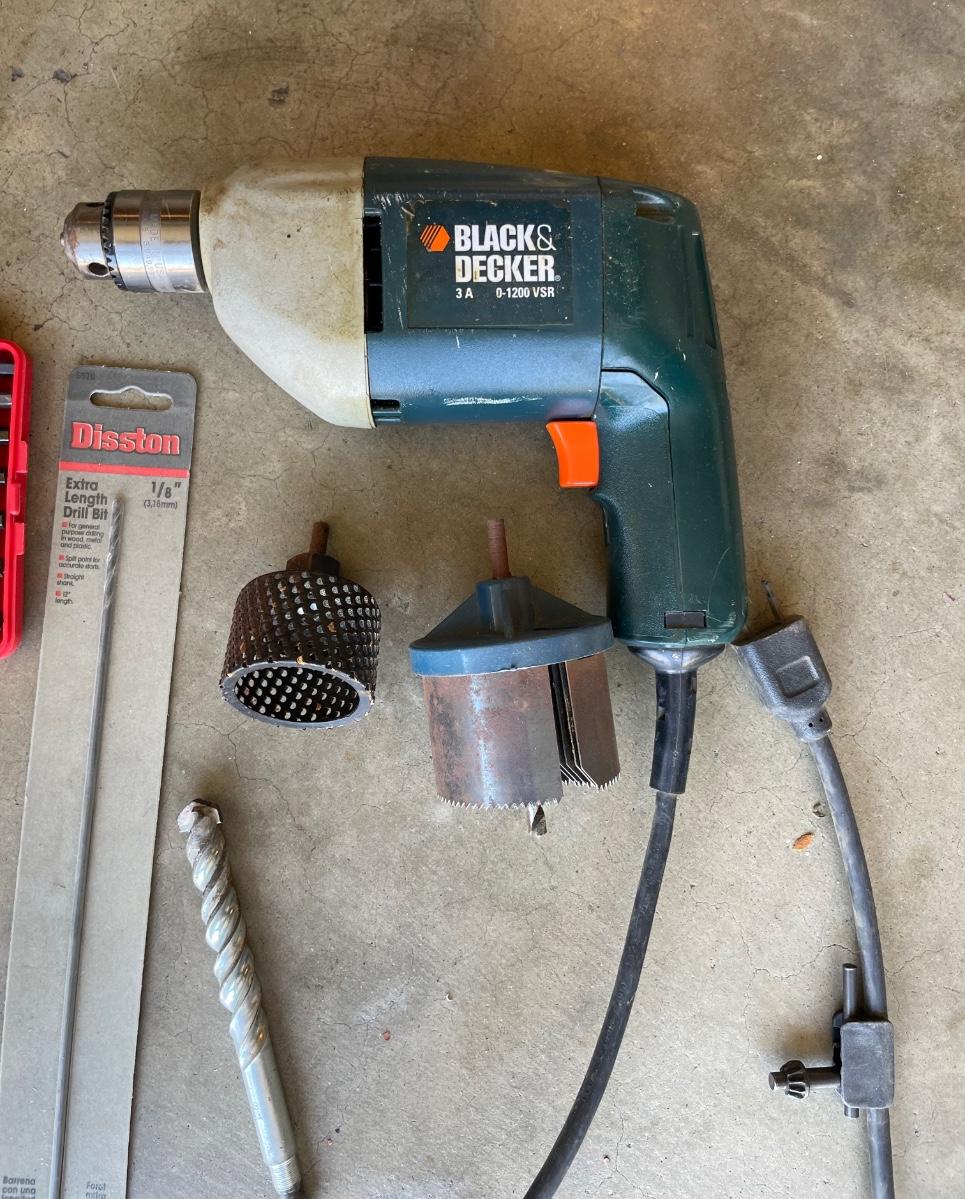 Black and Decker variable speed reversible 3/8” drill. Large lot of accessories.
