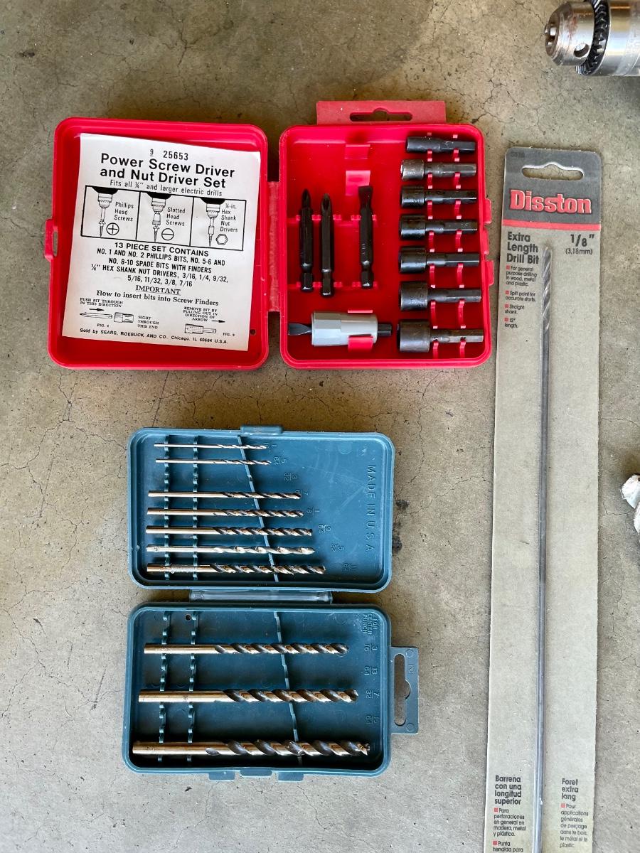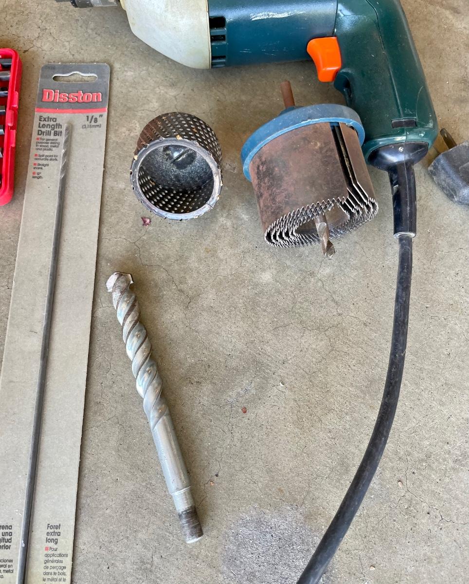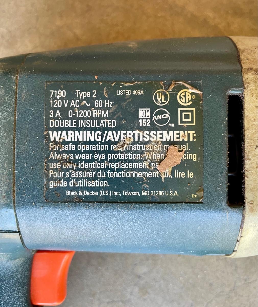 Black and Decker variable speed reversible 3/8” drill. Large lot of accessories.