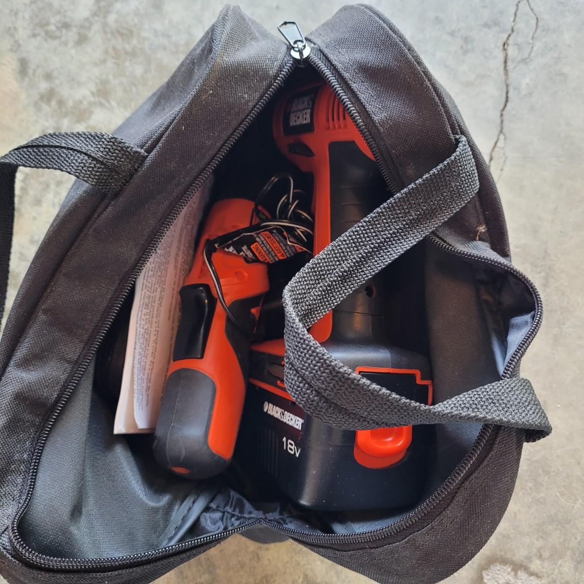 This lot includes a Back and Decker brand drill, pivot driver, and accessories. The drill includes one battery pack. The pivot driver is rechargeable. Both items power on when plugged in. Also included is a drill bit set, charging cords, carrying bag, and original paperwork.
