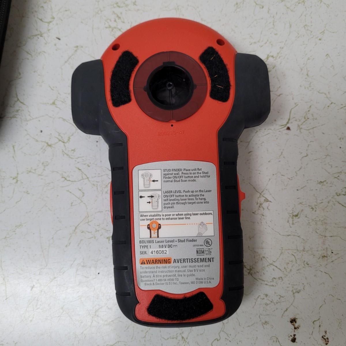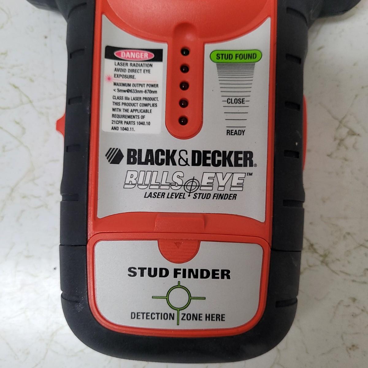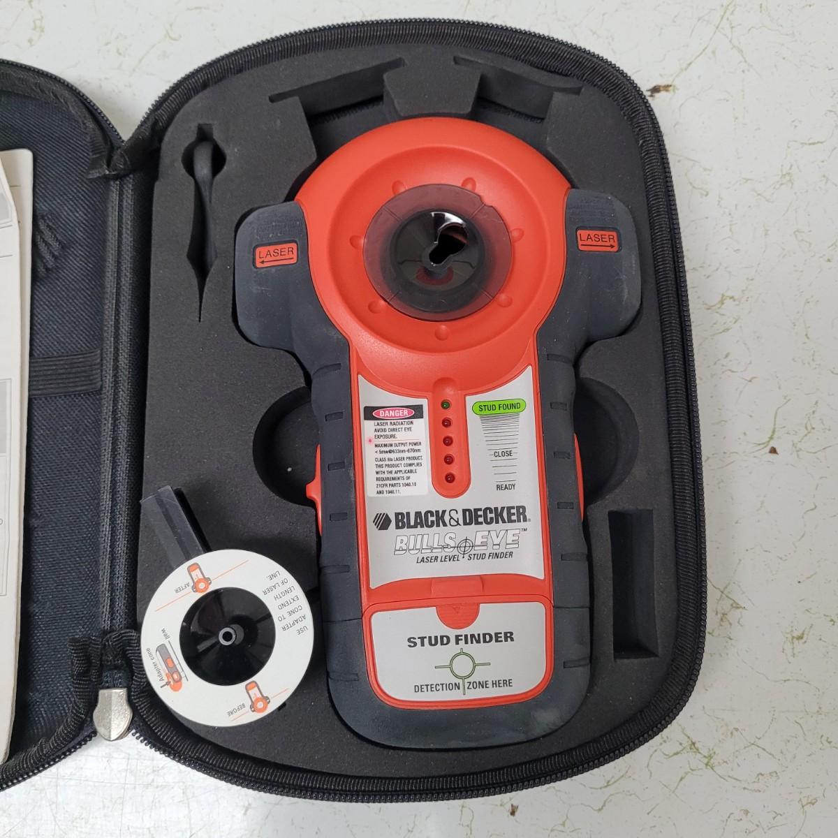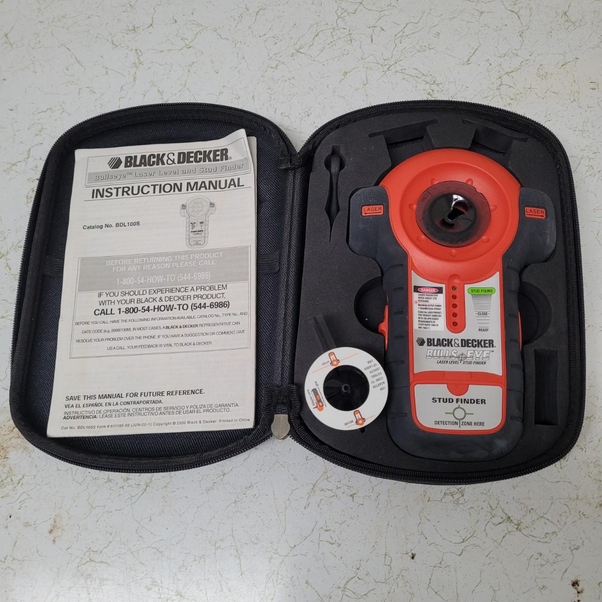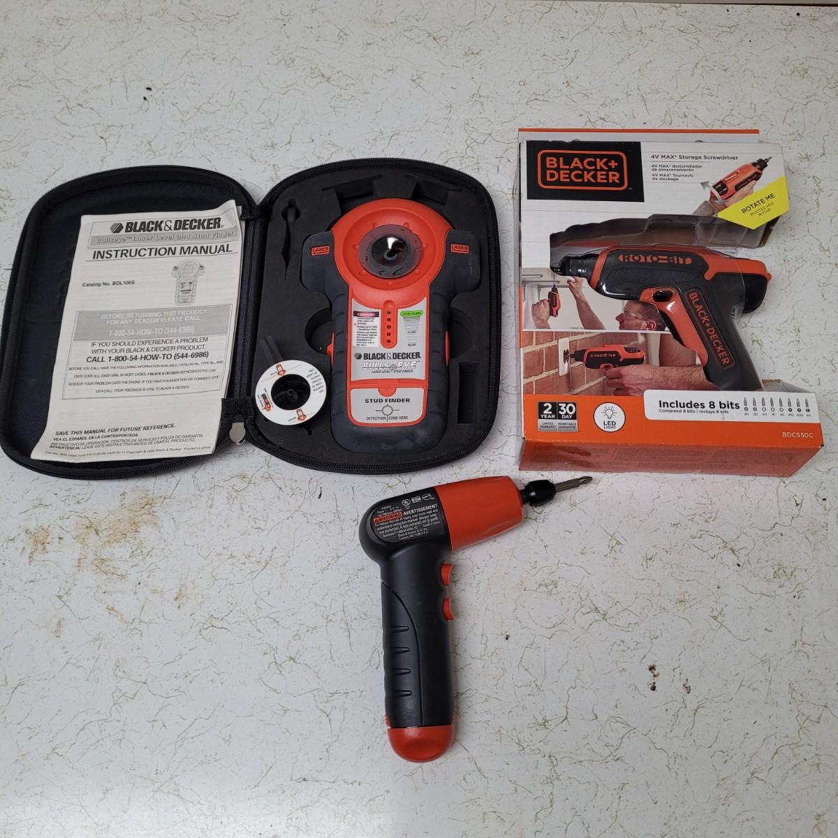 This lot includes three different Black and Decker brand hand tools. The first item is a 4V storage screwdriver including eight bits. It is cordless and appears to be new in its box. The second item is a Bullseye laser level and stud finder. It was not tested as it requires a 9V battery. It comes with a carrying case and instruction manual. The last item is a cordless handheld drill. It is cordless and runs off of AA batteries. It powered on when tested.