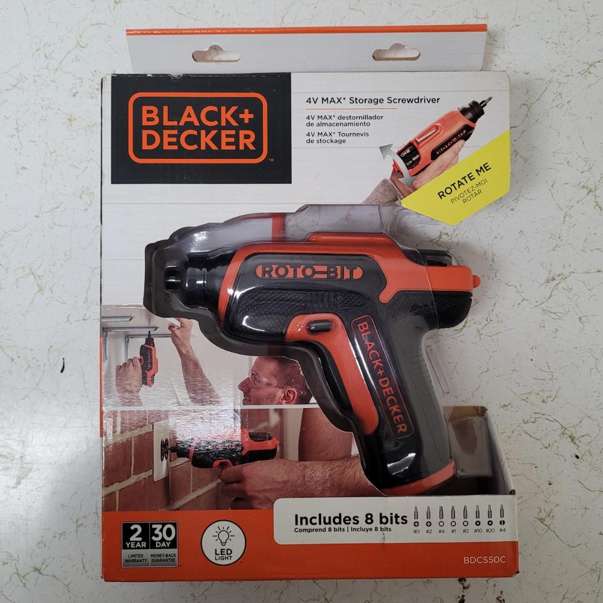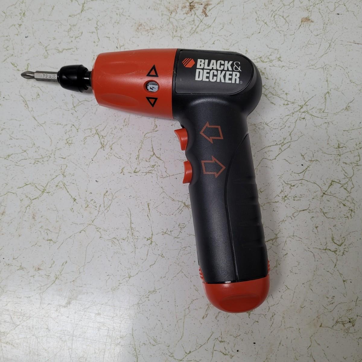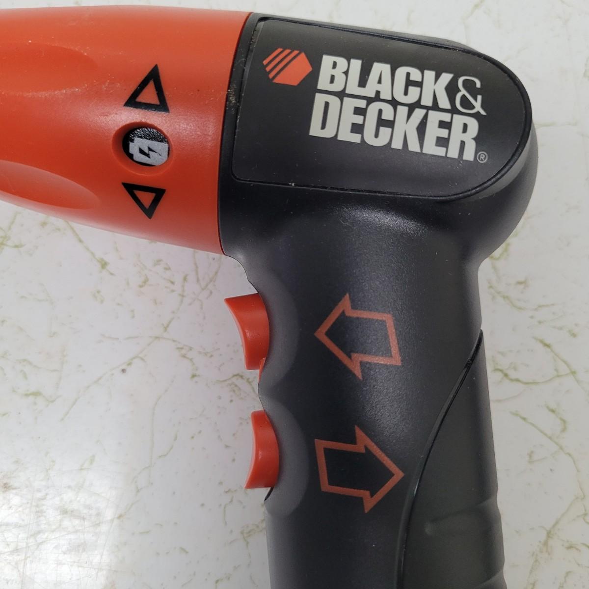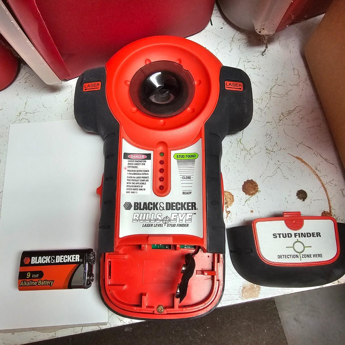 This lot includes three different Black and Decker brand hand tools. The first item is a 4V storage screwdriver including eight bits. It is cordless and appears to be new in its box. The second item is a Bullseye laser level and stud finder. It was not tested as it requires a 9V battery. It comes with a carrying case and instruction manual. The last item is a cordless handheld drill. It is cordless and runs off of AA batteries. It powered on when tested.