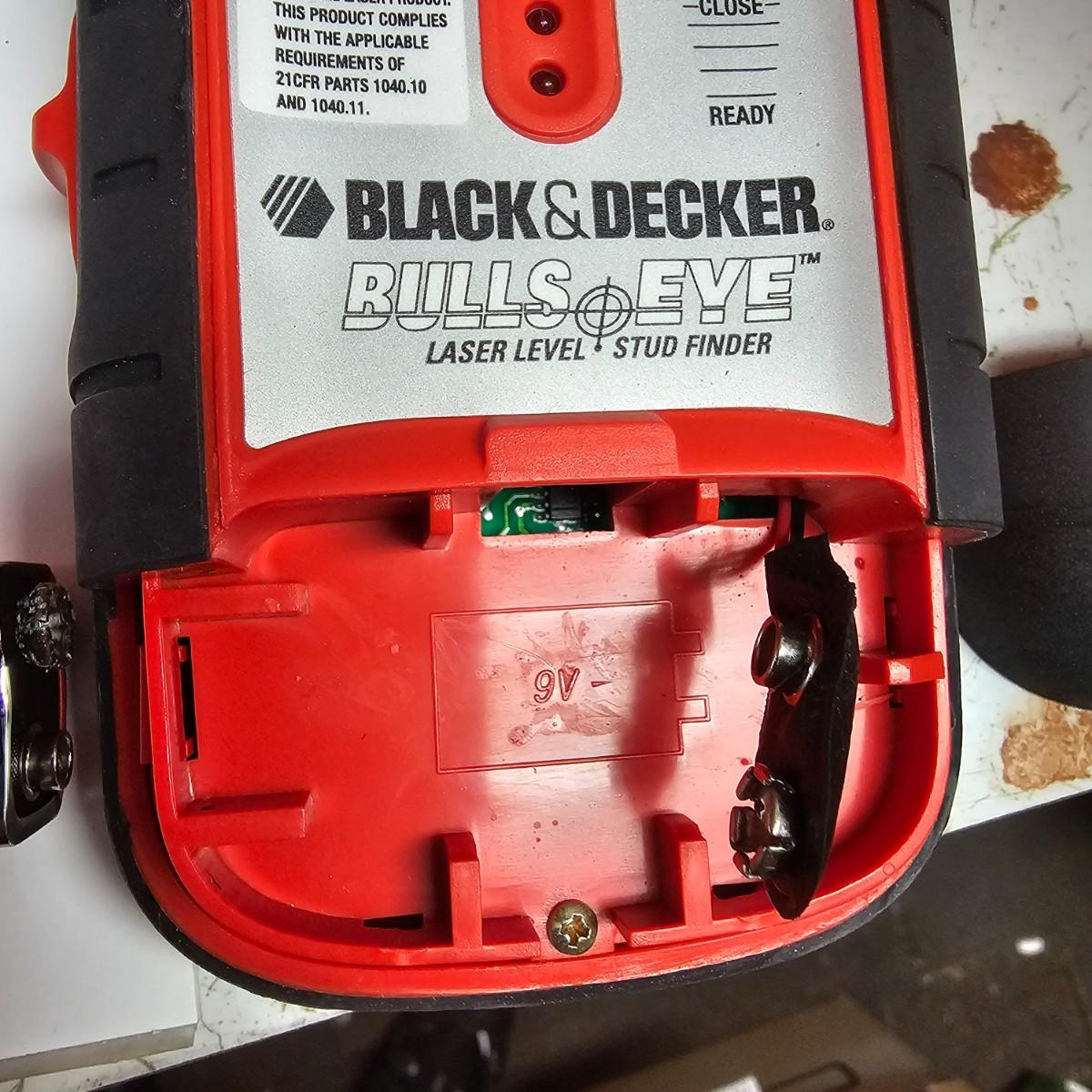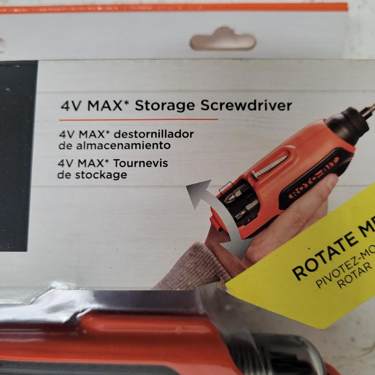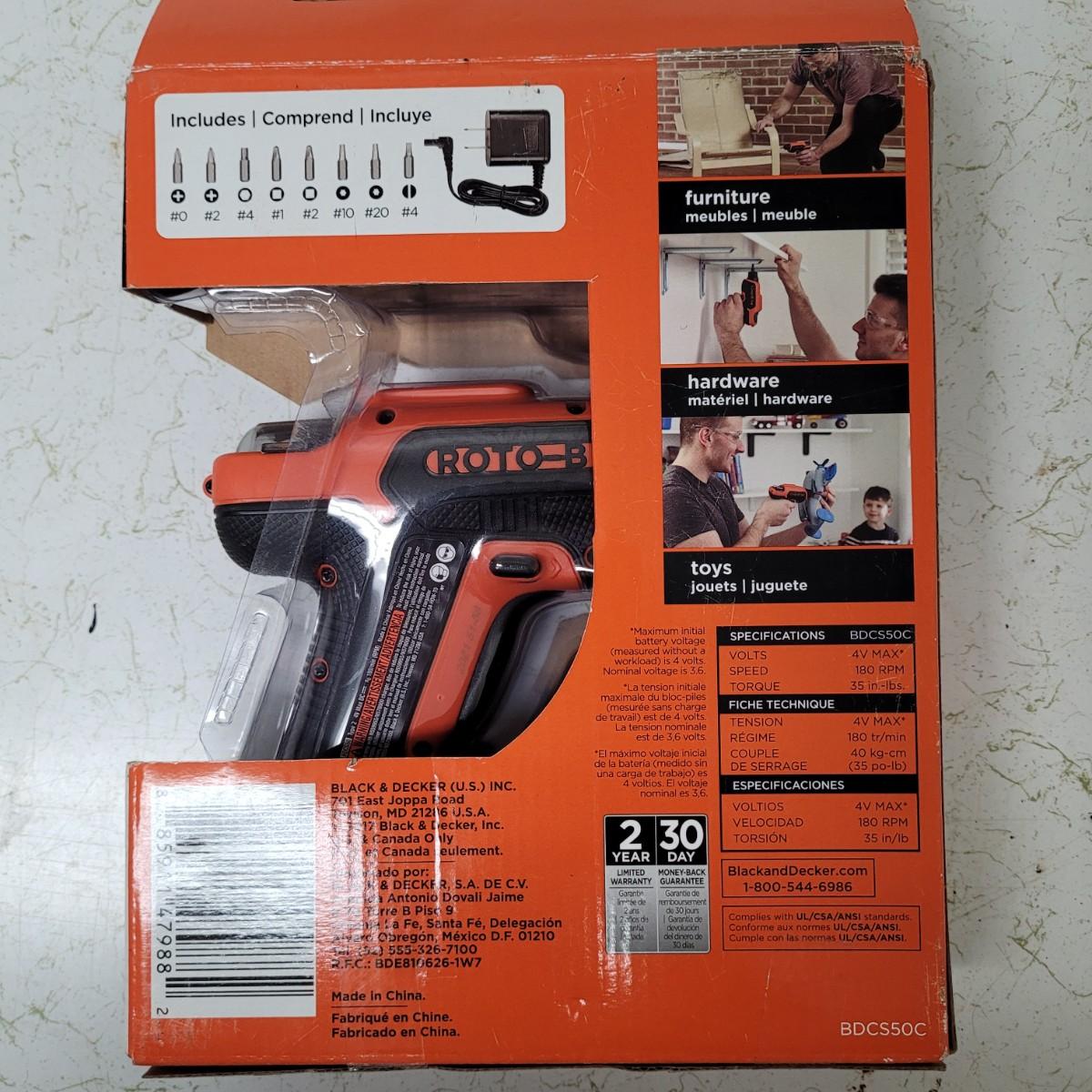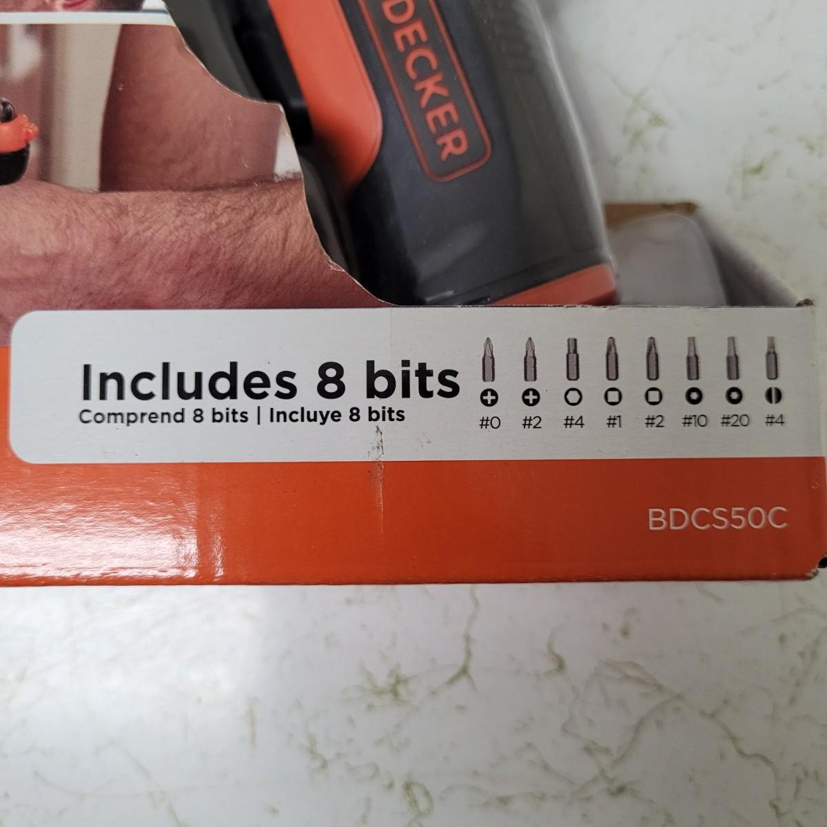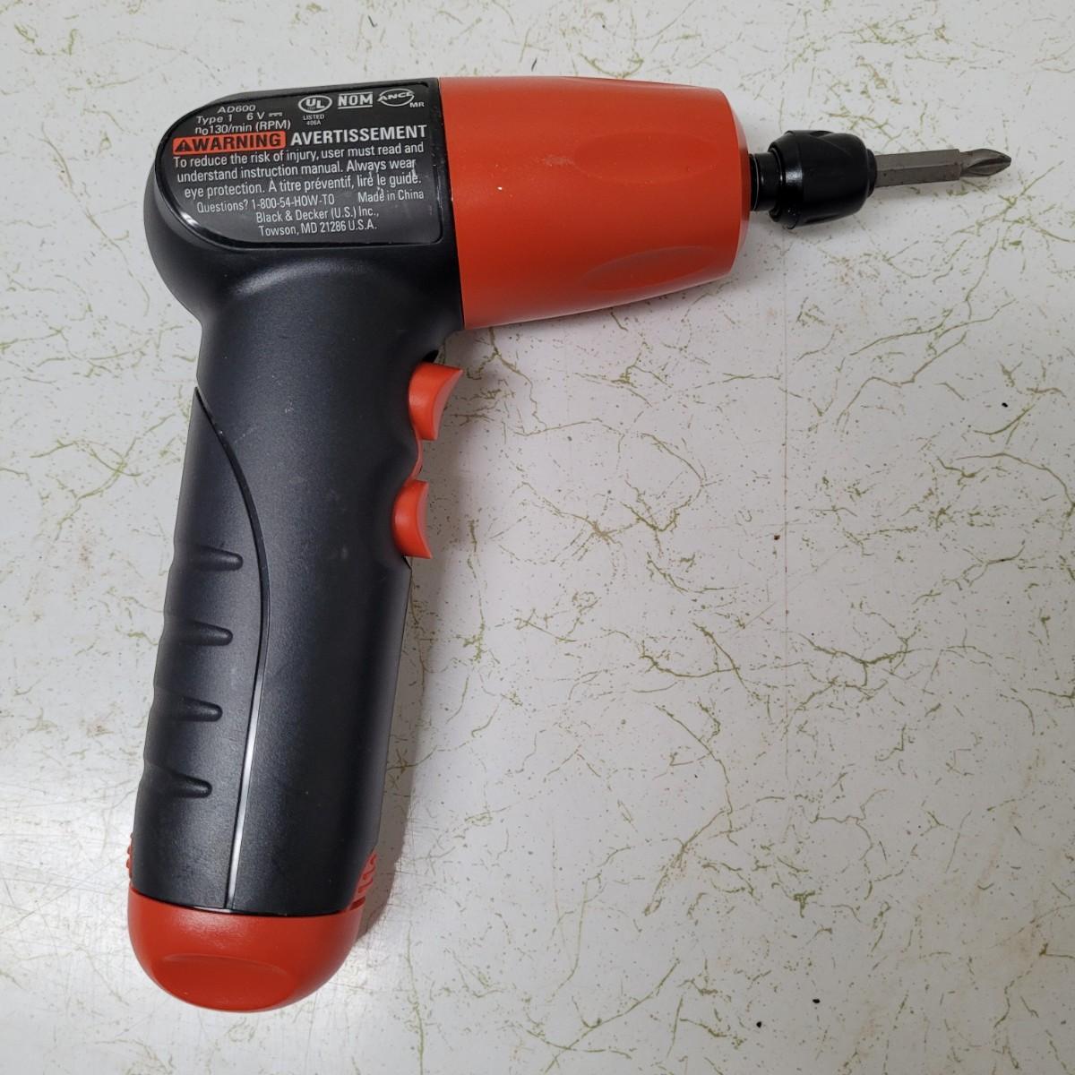 This lot includes three different Black and Decker brand hand tools. The first item is a 4V storage screwdriver including eight bits. It is cordless and appears to be new in its box. The second item is a Bullseye laser level and stud finder. It was not tested as it requires a 9V battery. It comes with a carrying case and instruction manual. The last item is a cordless handheld drill. It is cordless and runs off of AA batteries. It powered on when tested.