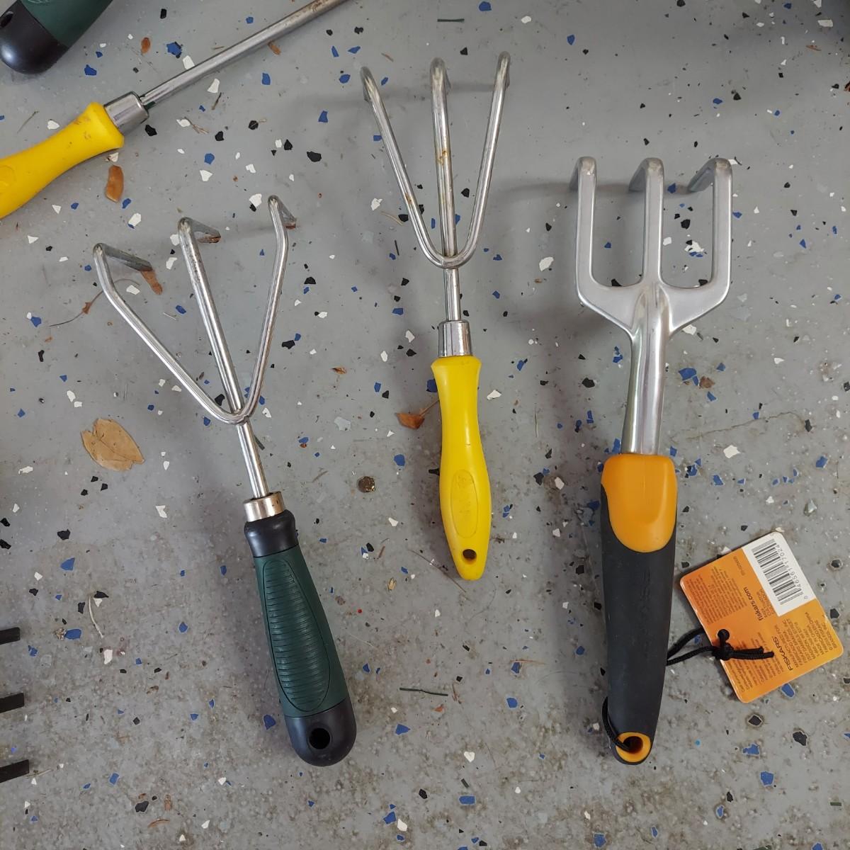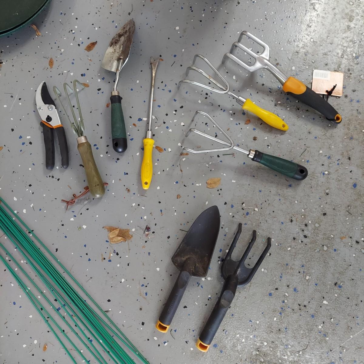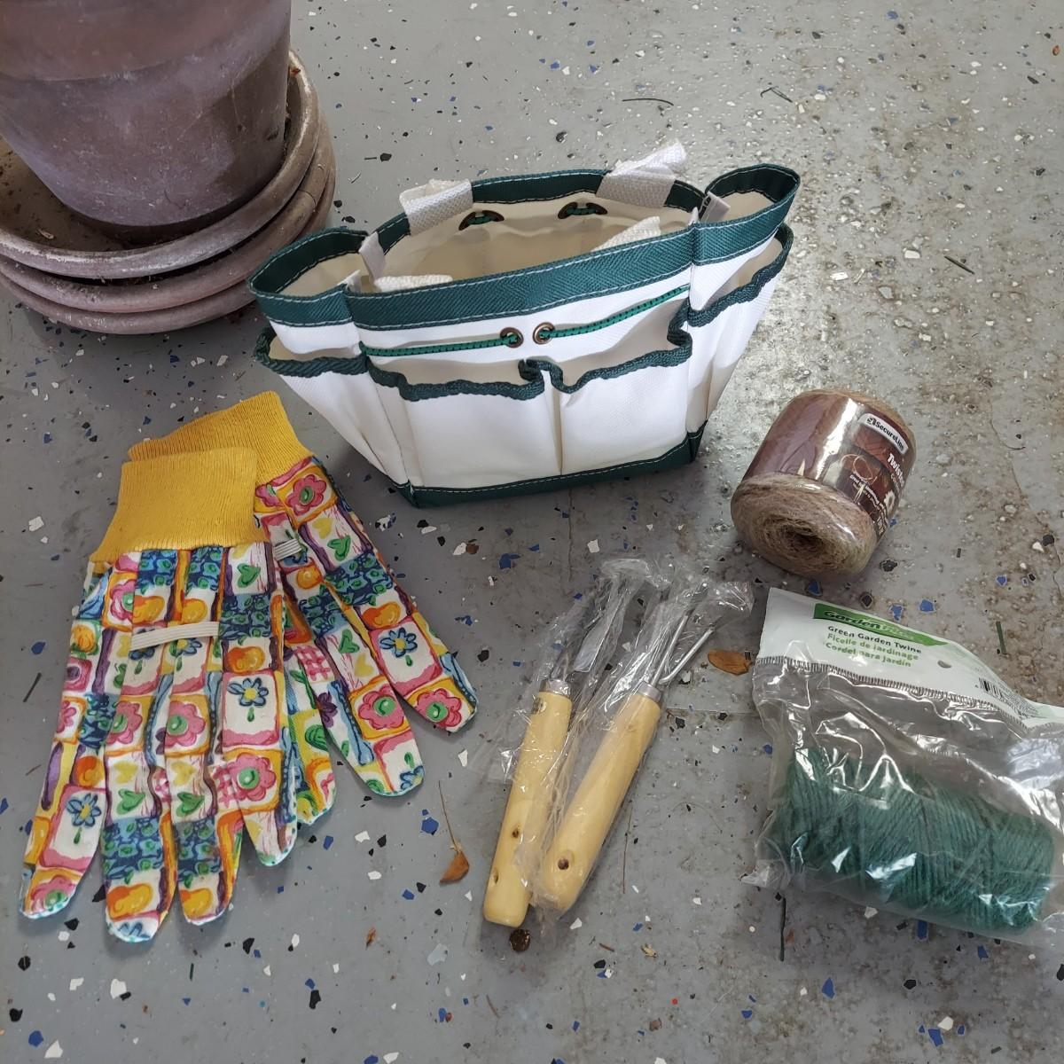 Lot includes a Black and Decker leaf blower with other yard tools and gardening supplies including pots, hand tools, yard stakes and more. The yard stakes are 44"H. The terracotta pots are 8"D across. Leaf blower powers on when plugged in. Please see photos for details. Local Pickup Only