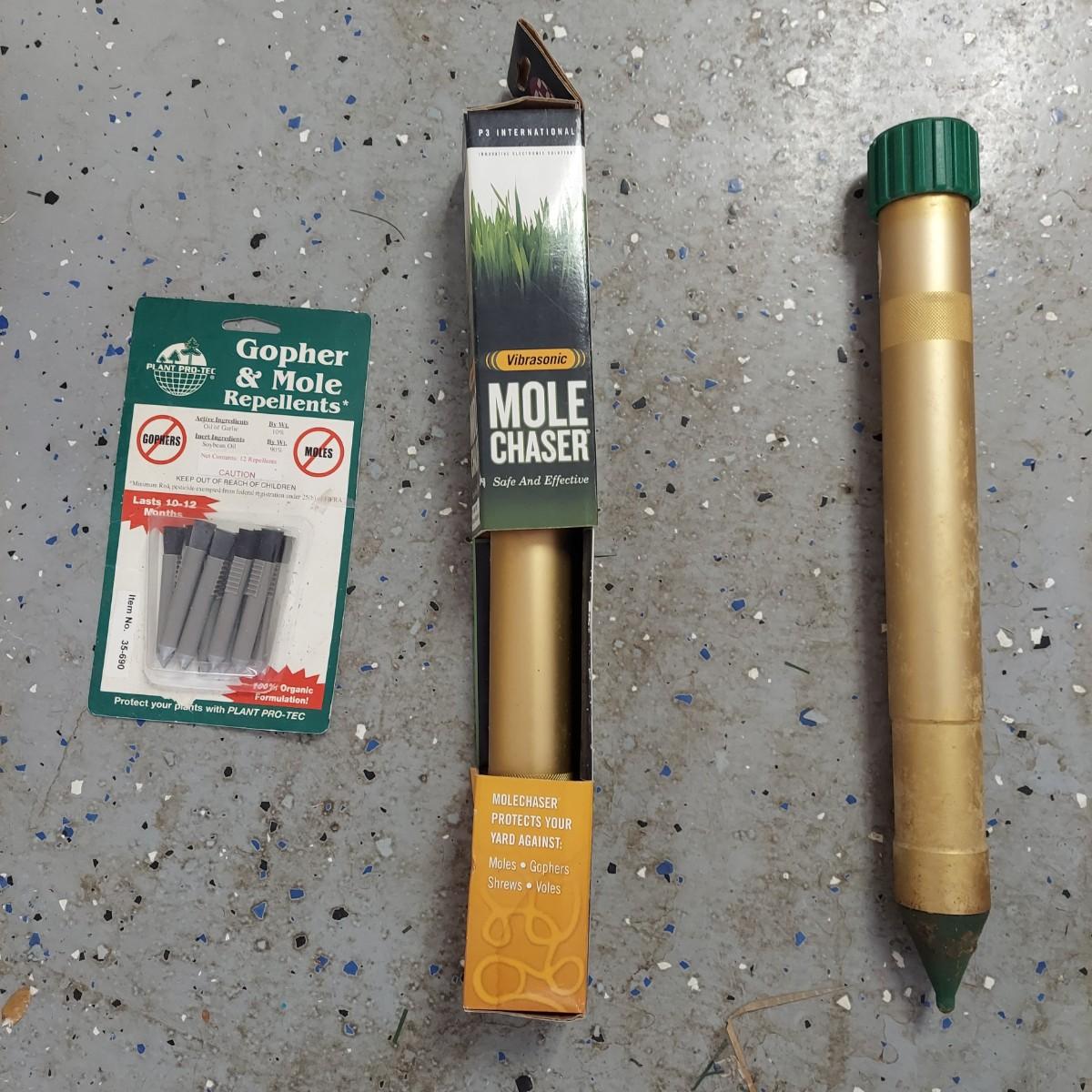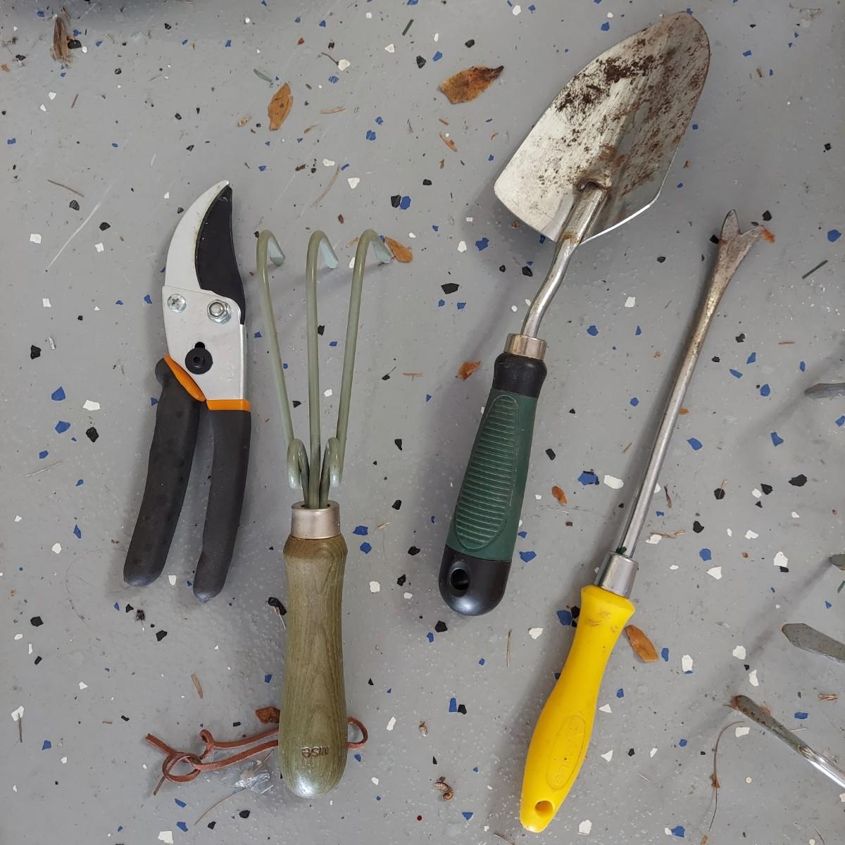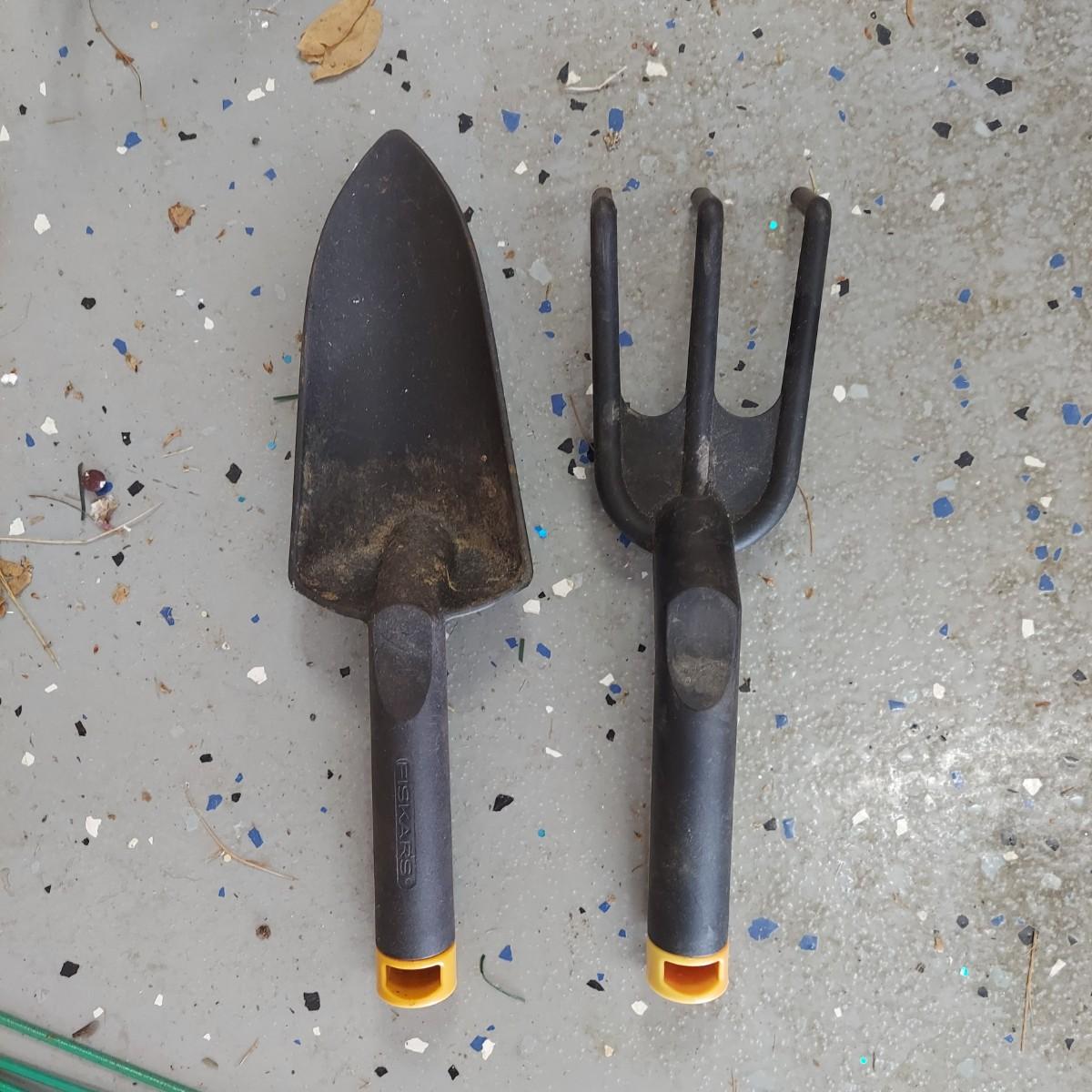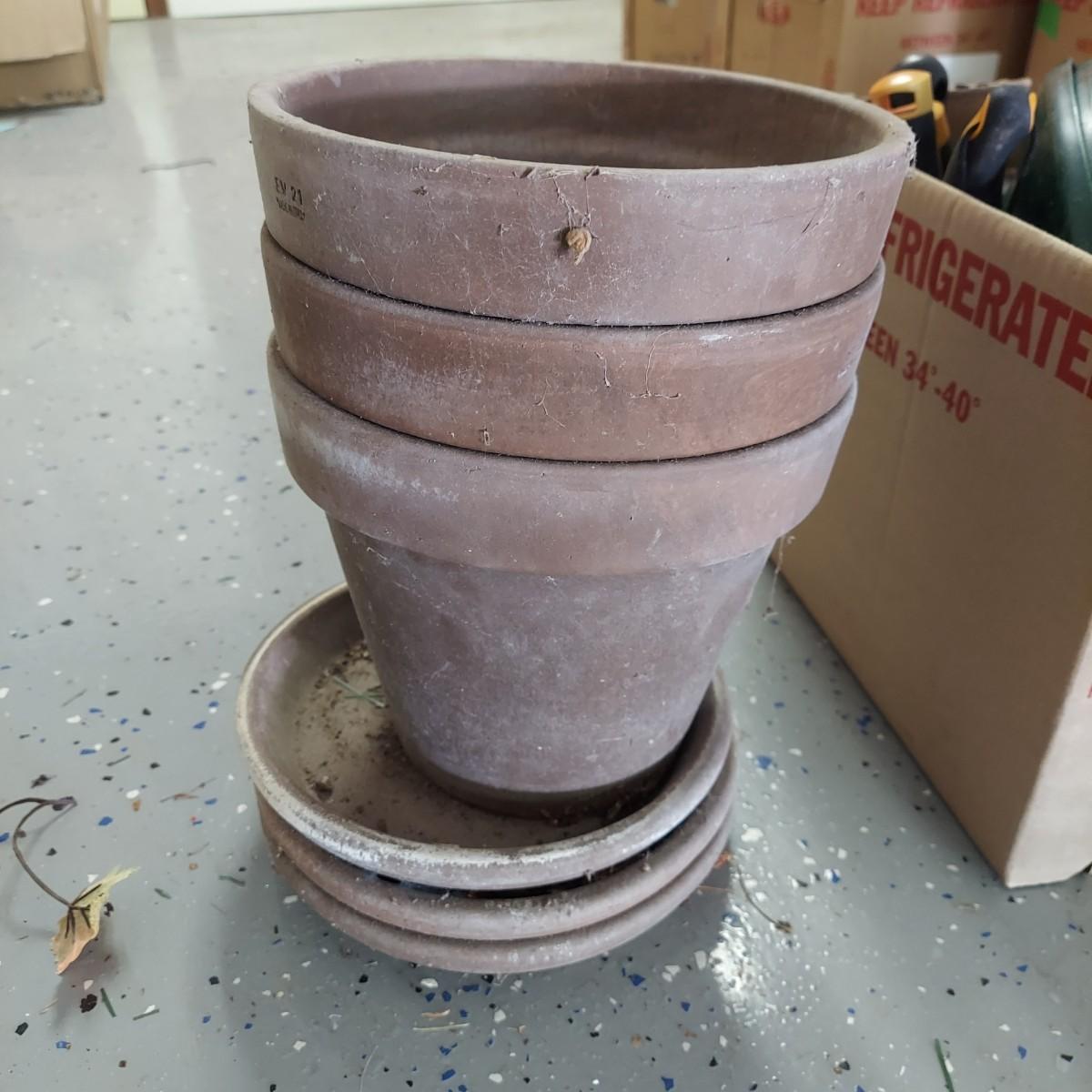 Lot includes a Black and Decker leaf blower with other yard tools and gardening supplies including pots, hand tools, yard stakes and more. The yard stakes are 44"H. The terracotta pots are 8"D across. Leaf blower powers on when plugged in. Please see photos for details. Local Pickup Only
