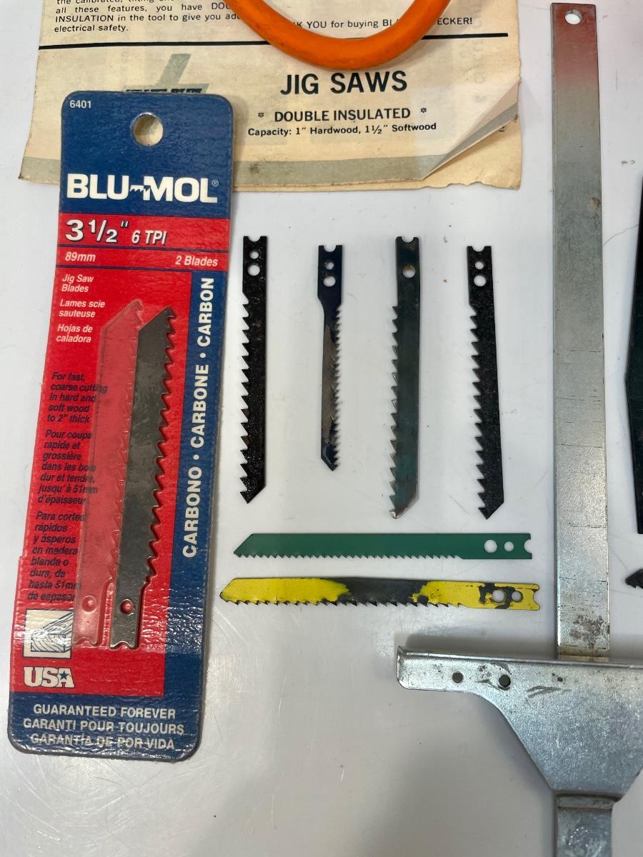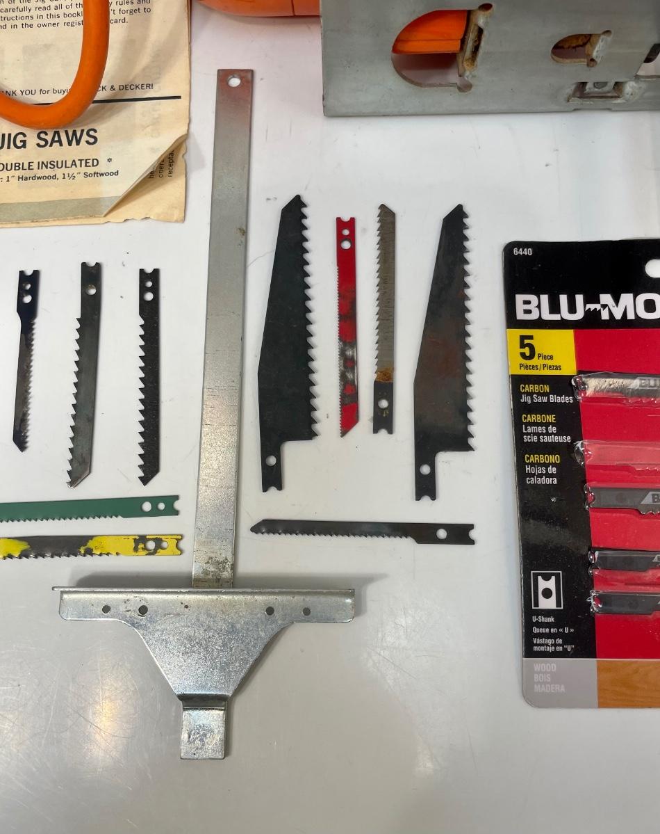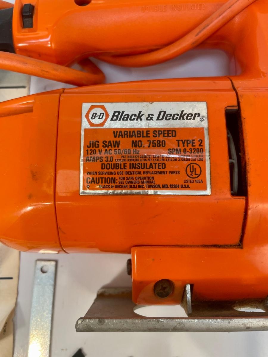 Black and Decker Variable Speed Jig Saw. Includes extra blades and a cutting guide.
