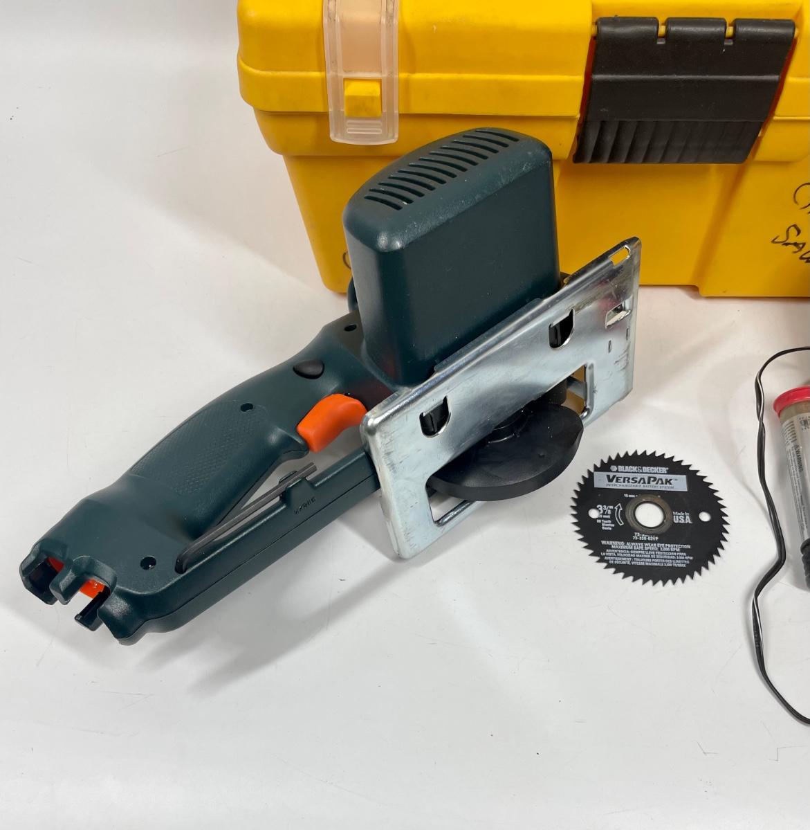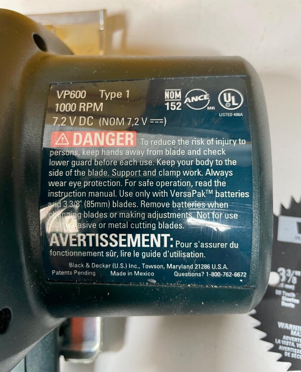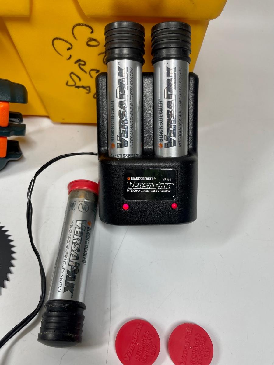 Black and Decker VersaPak 3 3/8” Cordless Rechargeable Circular Saw. Model VP600. Includes 3 VersaPak batteries, battery charger, saw, 2 circular blades, and a yellow plastic toolbox/storage case. Original instructions and manual included. Tested, works great.