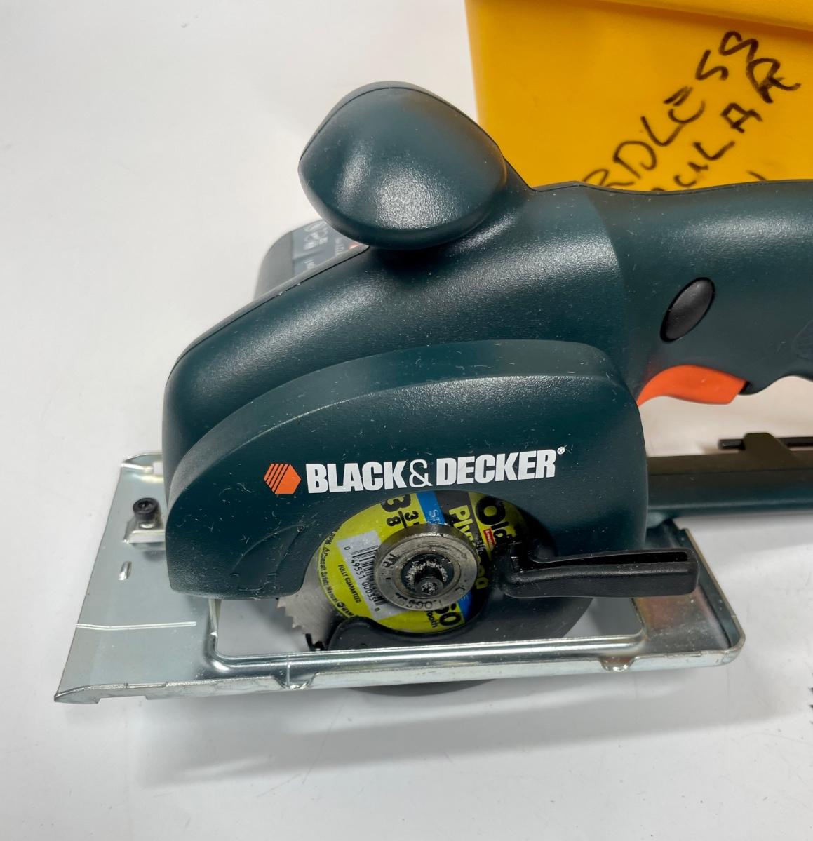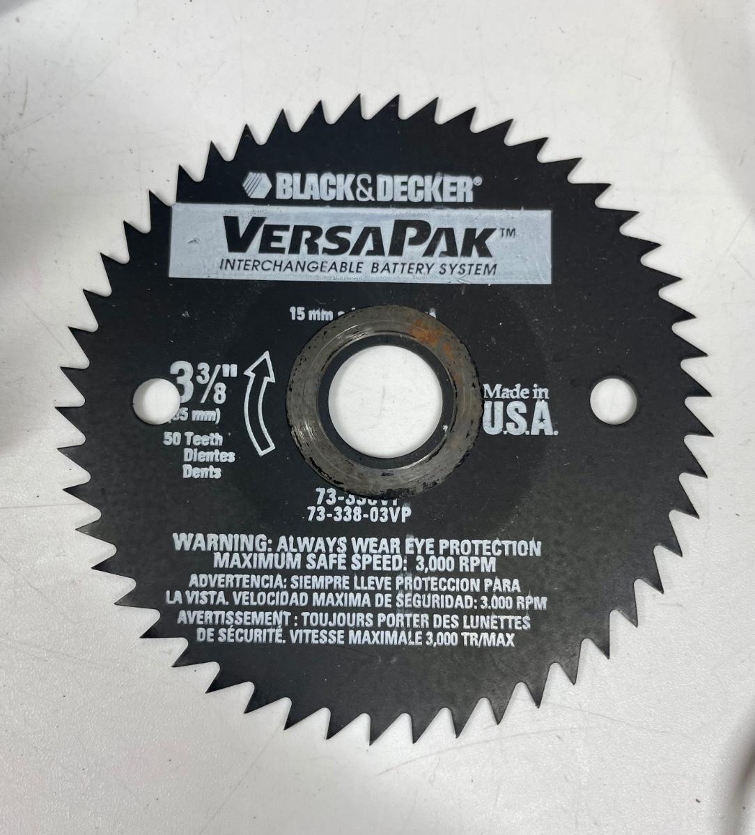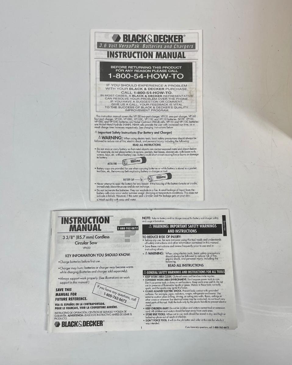 Black and Decker VersaPak 3 3/8” Cordless Rechargeable Circular Saw. Model VP600. Includes 3 VersaPak batteries, battery charger, saw, 2 circular blades, and a yellow plastic toolbox/storage case. Original instructions and manual included. Tested, works great.
