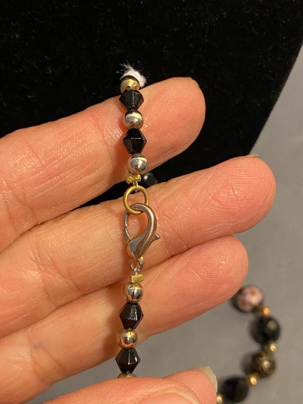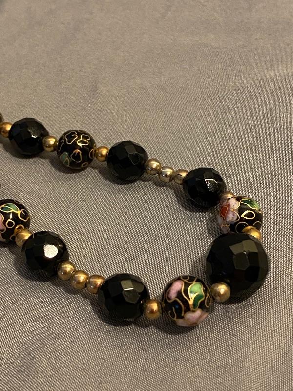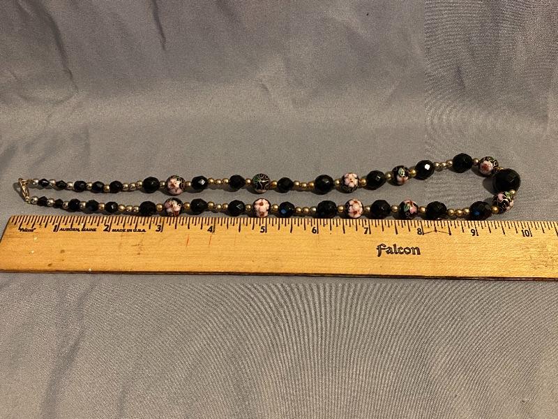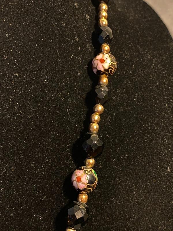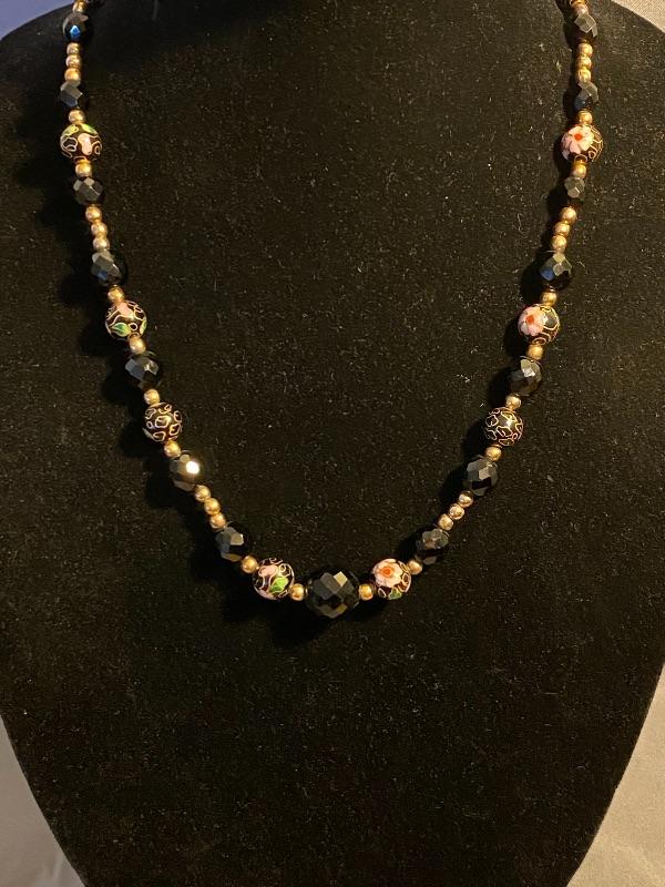 Black and gold cloisonne necklace. Black glass beads separated by small gold tone beads. Some of the black beads are faceted while the others are decorated with a pink flower cloisonne. Graduate in size to center bead. Lobster claw clasp. Measures about 10".