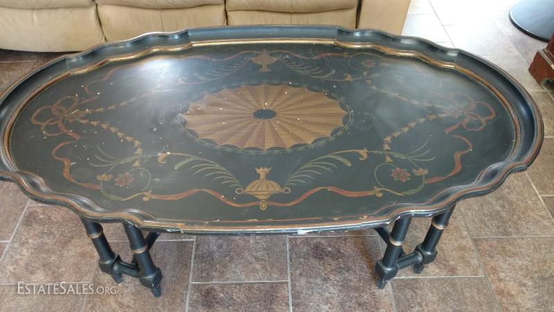 Black and gold painted coffee table, small repair to side edge. Needs TLC.