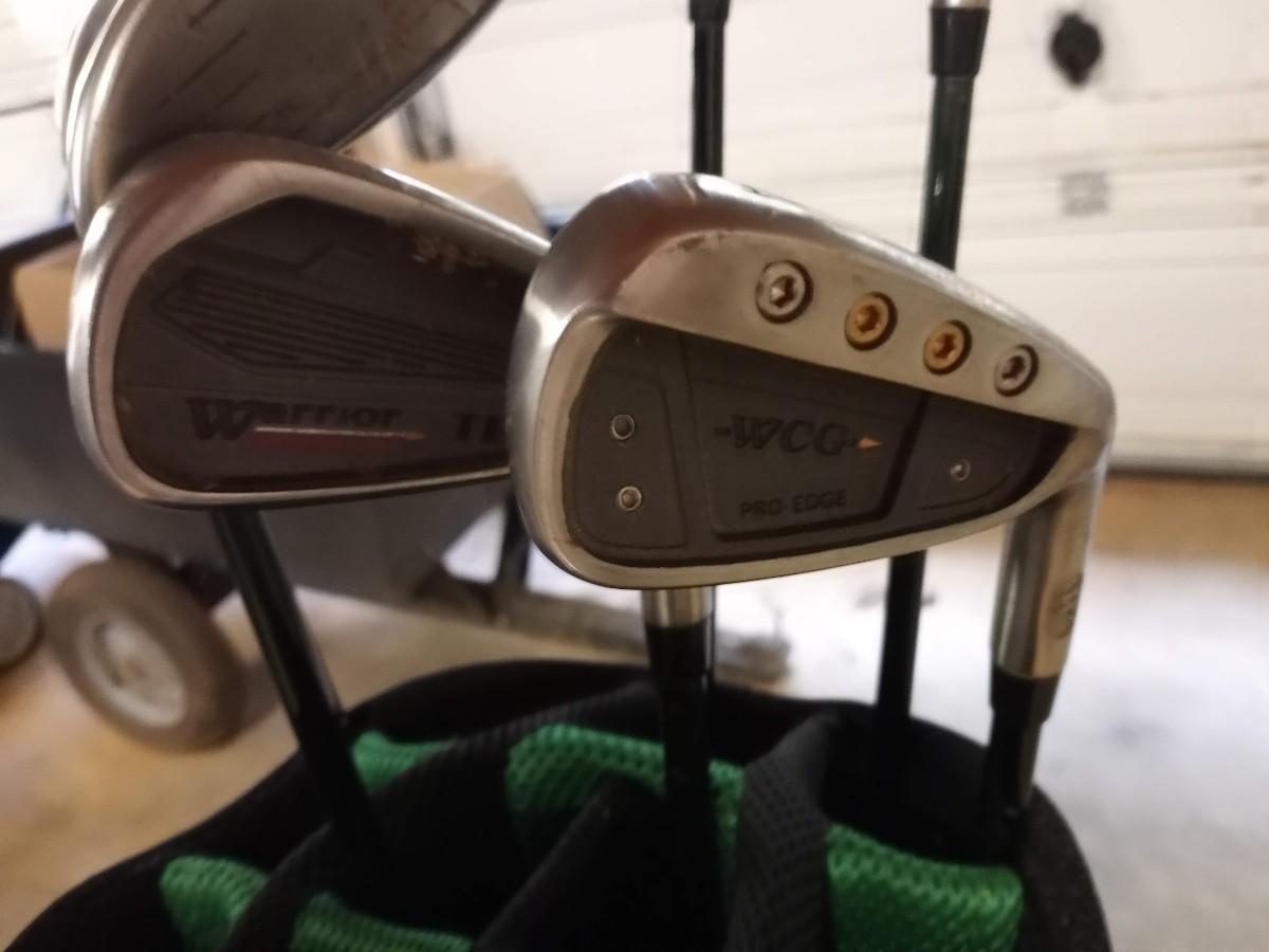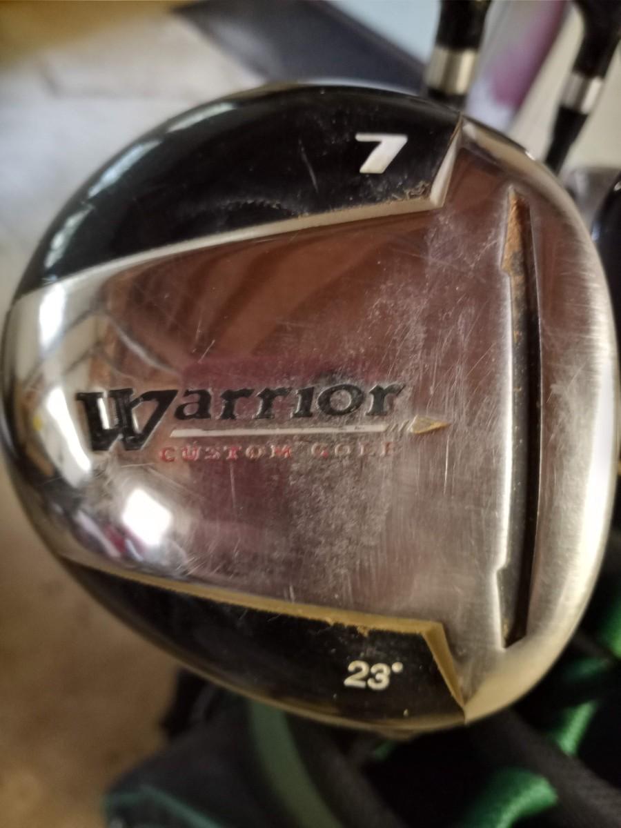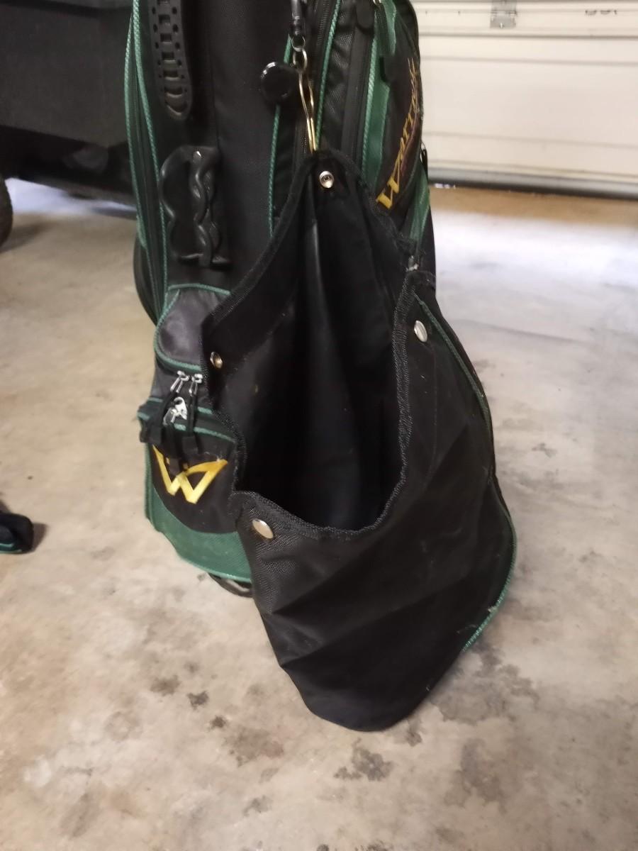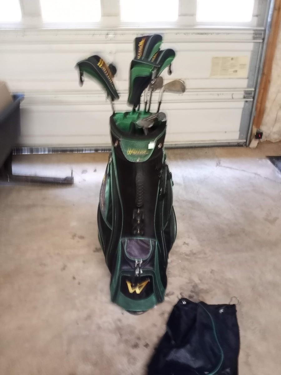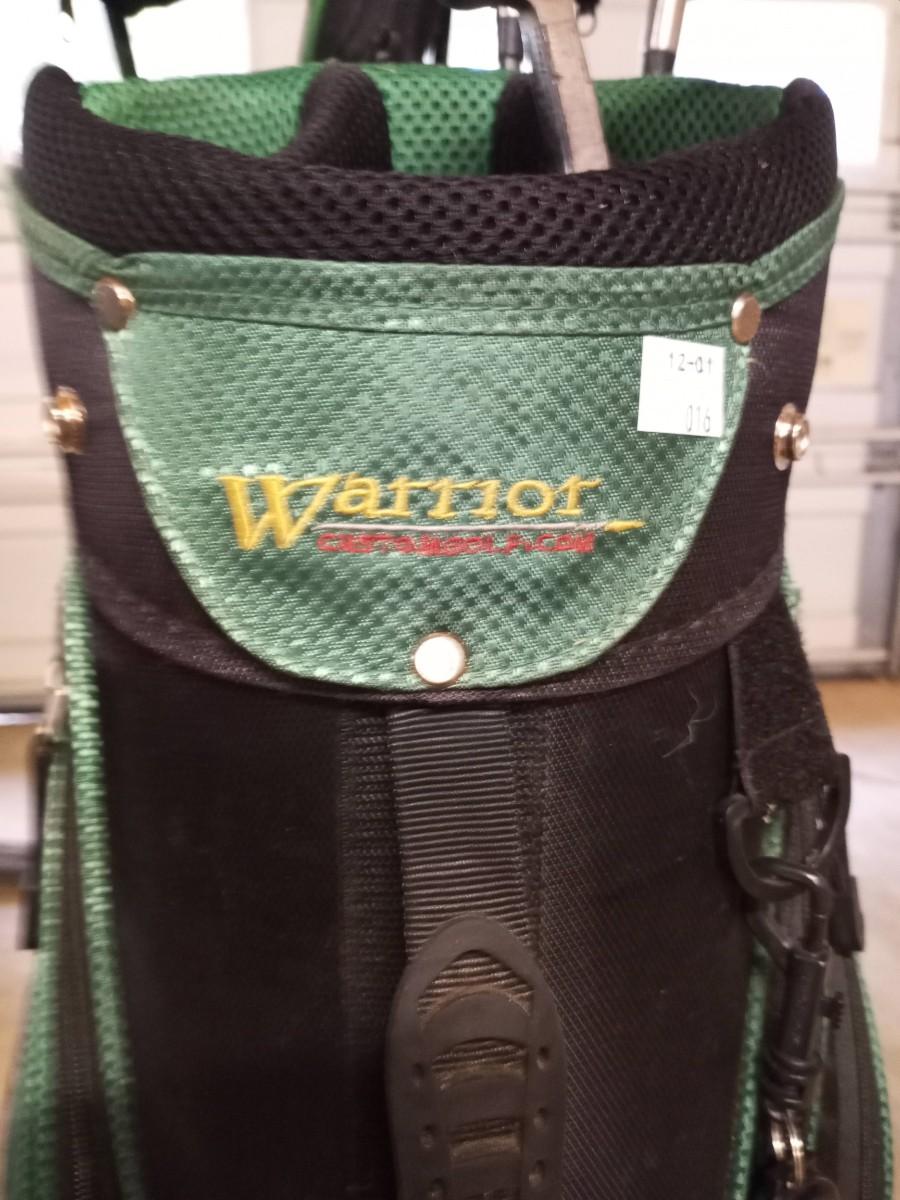 Black and green Warrior golf bag with 6 clubs and specialty tool and bag