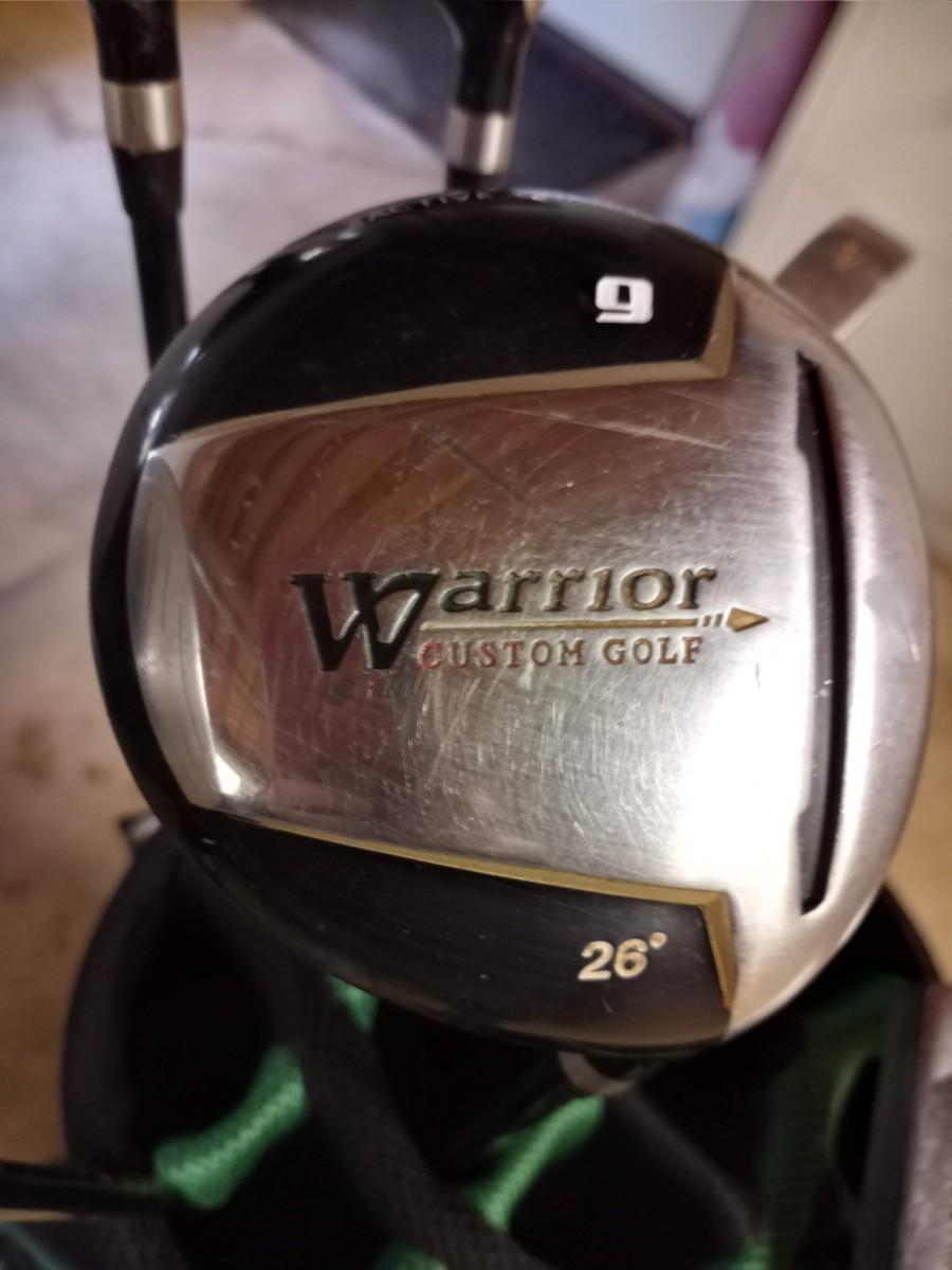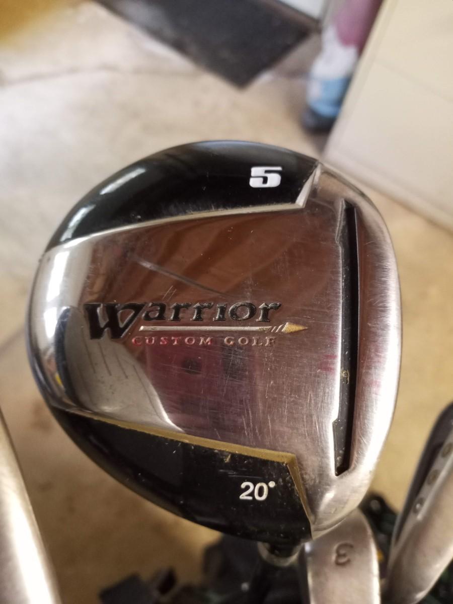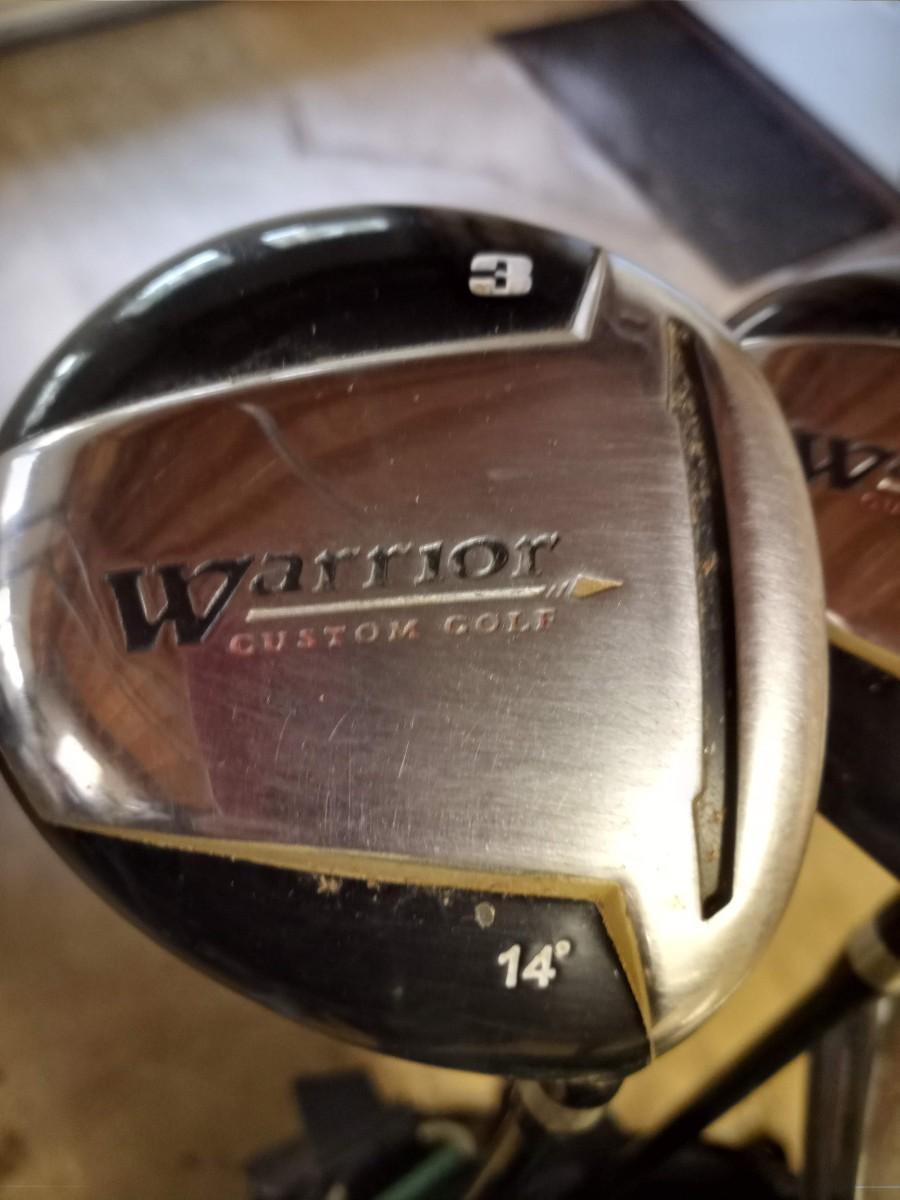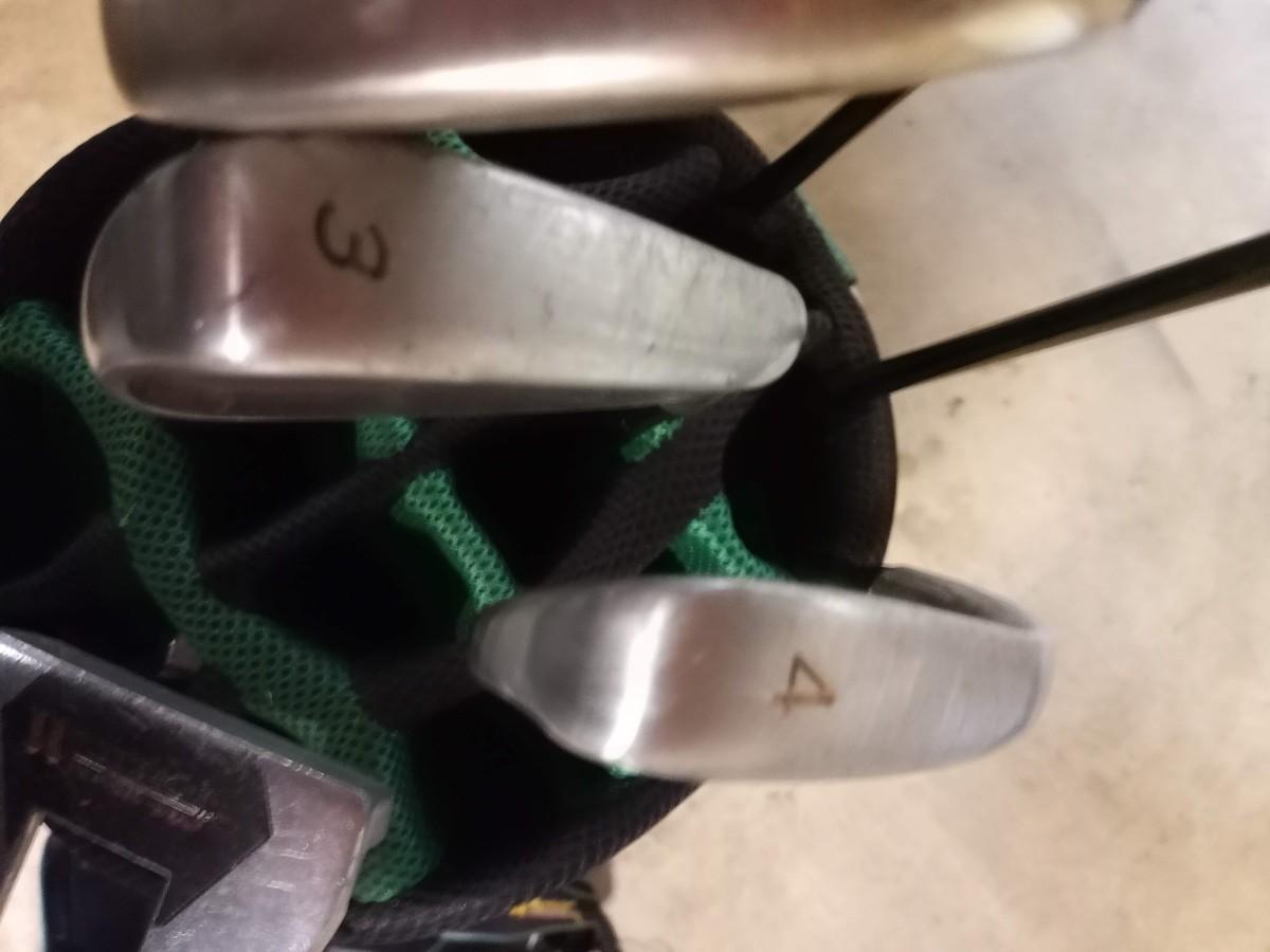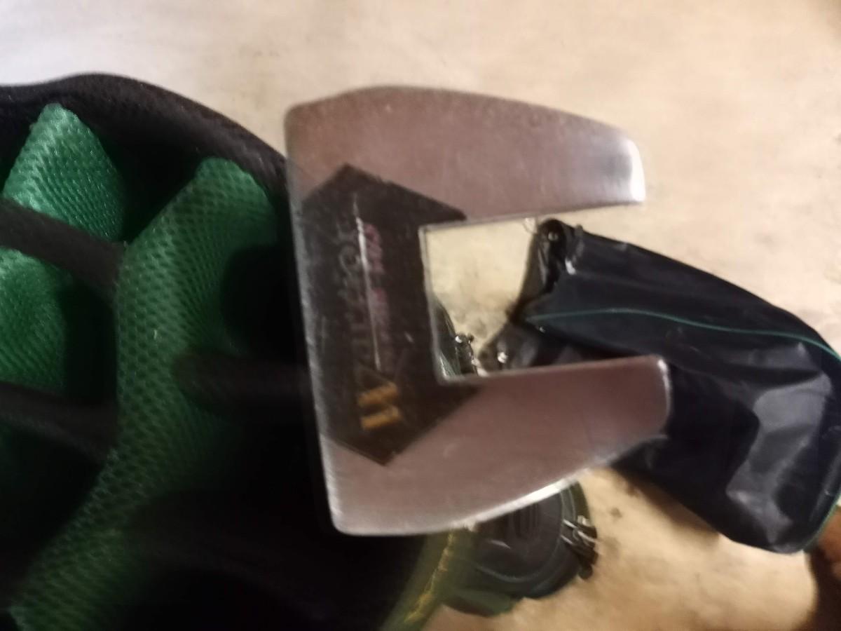 Black and green Warrior golf bag with 6 clubs and specialty tool and bag