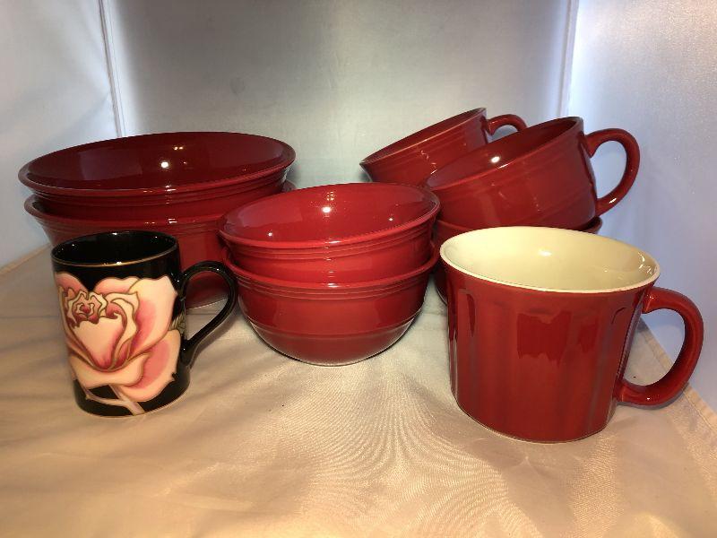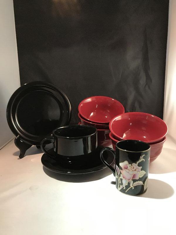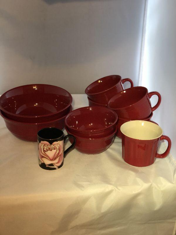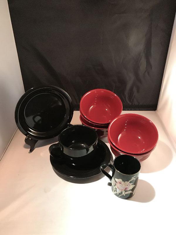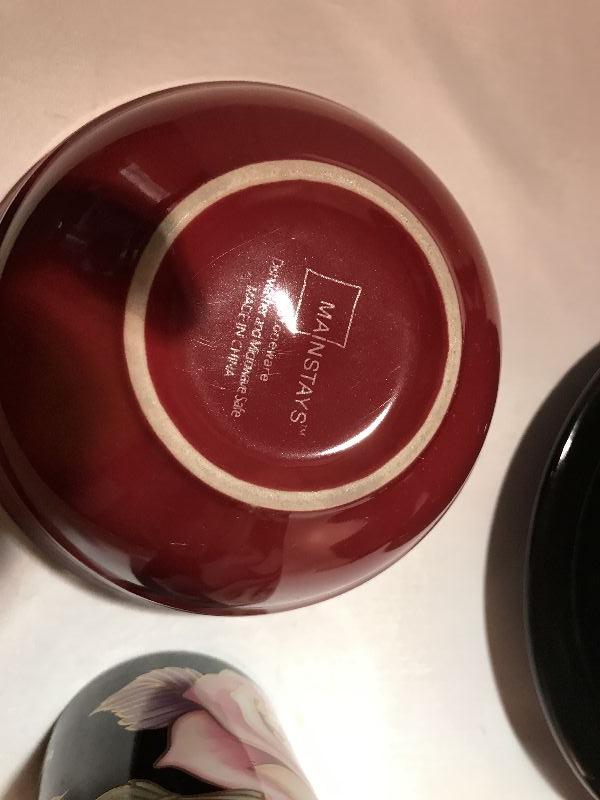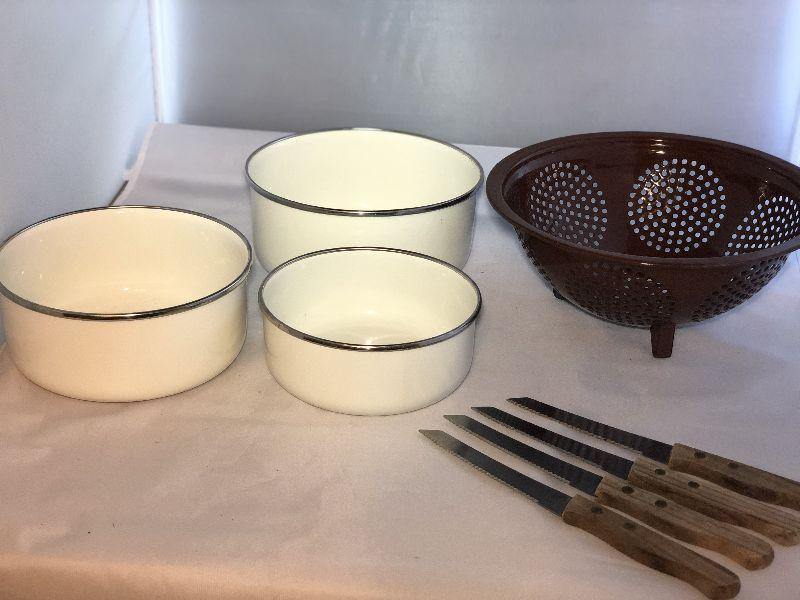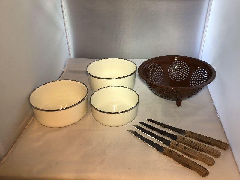 This lot consist of Mainstay Dishes adding Fritz and Floyd Mugs, plus Steak Knives and Enamel Collinear and Pots.