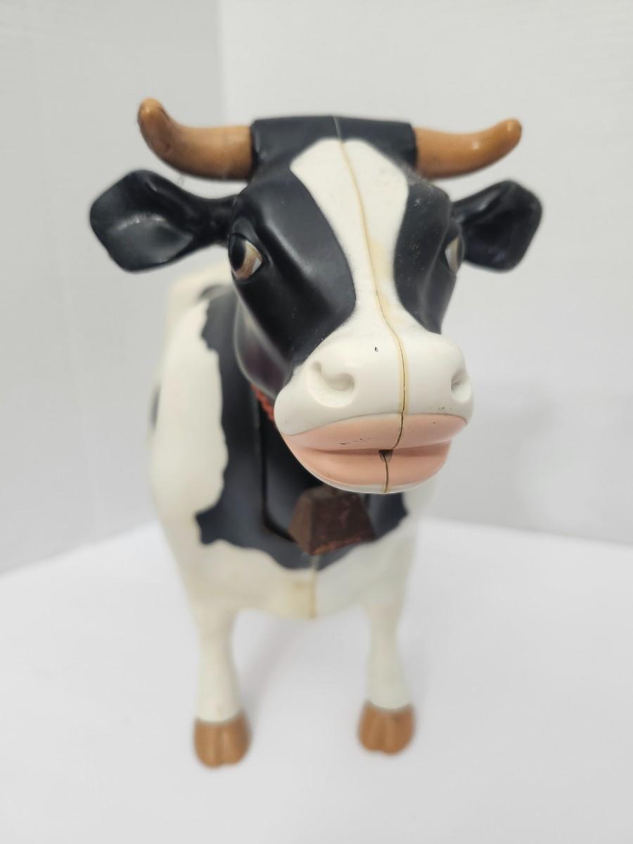 Farm style black and white cow figurine with molded details and a small bell hanging from a rope style collar. Standing cow form with painted markings, tan hooves, and expressive face. Decorative farm animal figure suitable for shelf display, rustic decor, or collection. No maker marks observed. Item shown exactly as photographed.