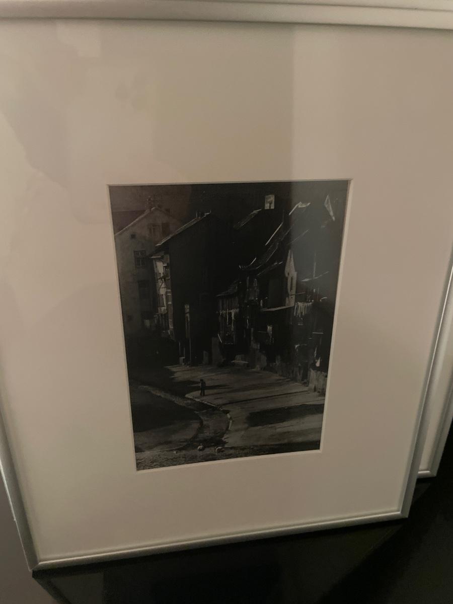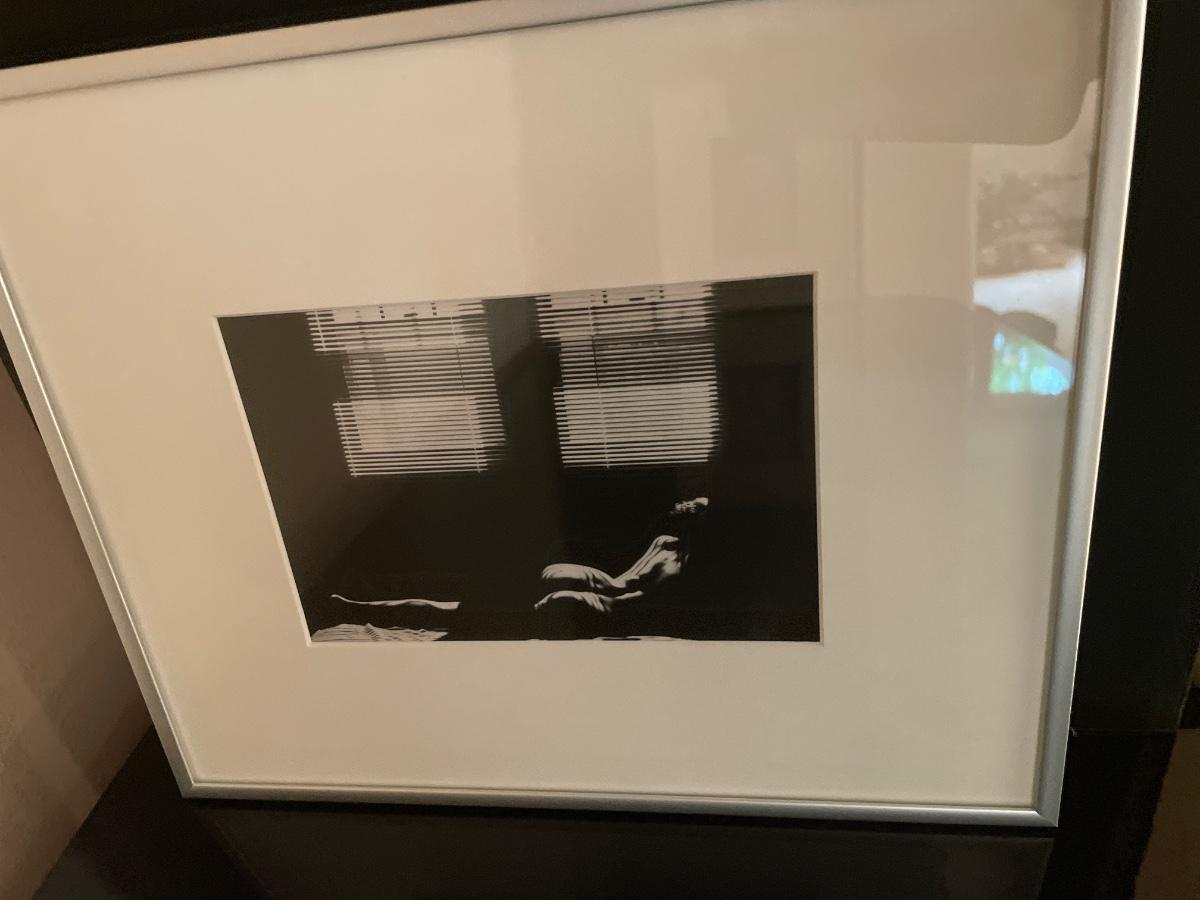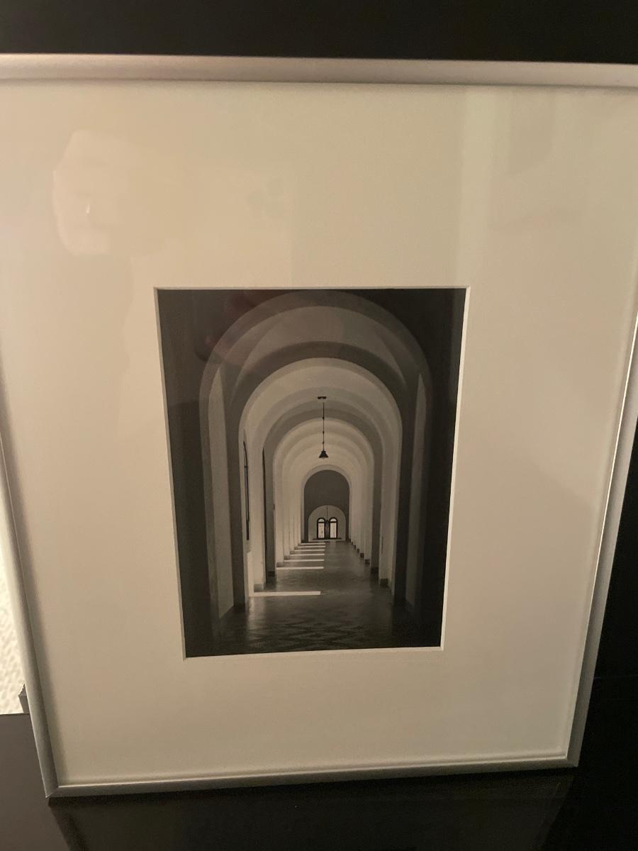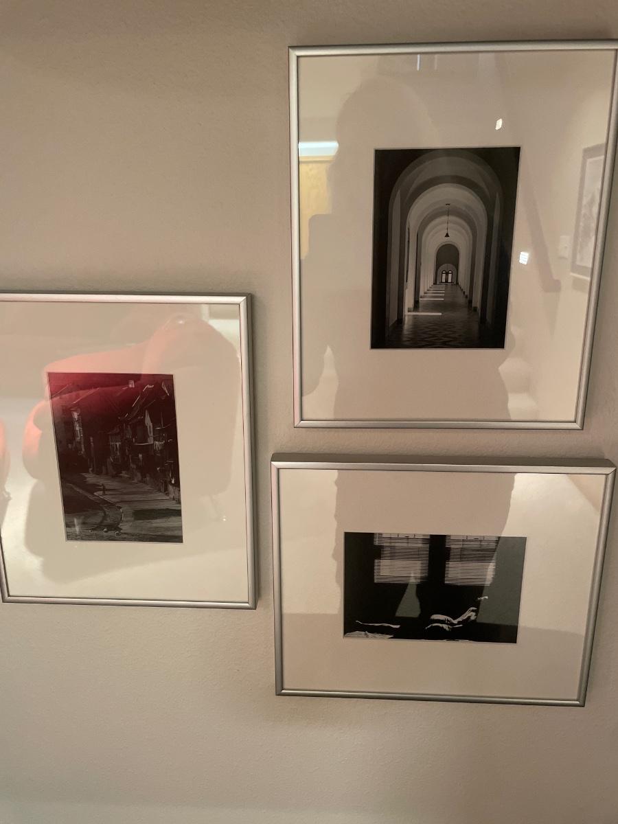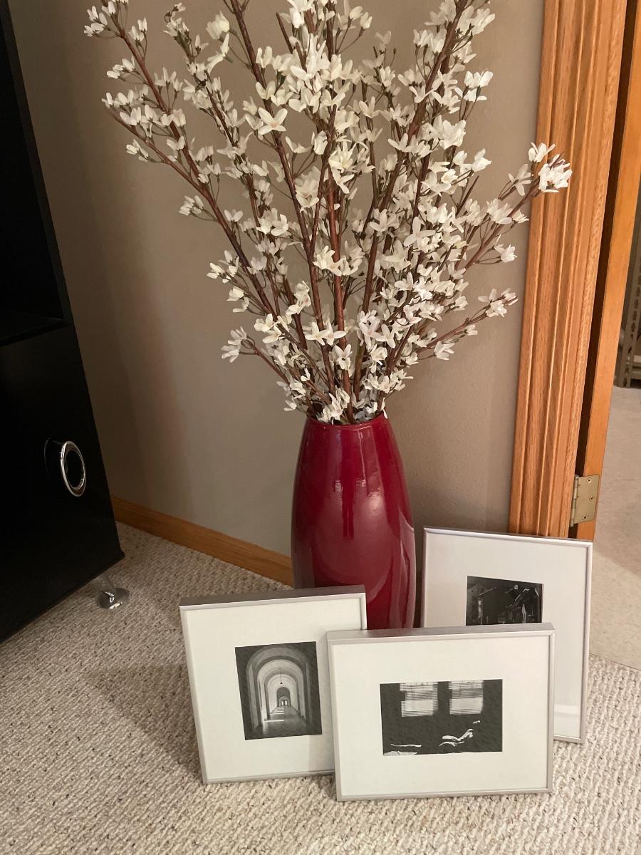 Black and white framed decor with red vas
