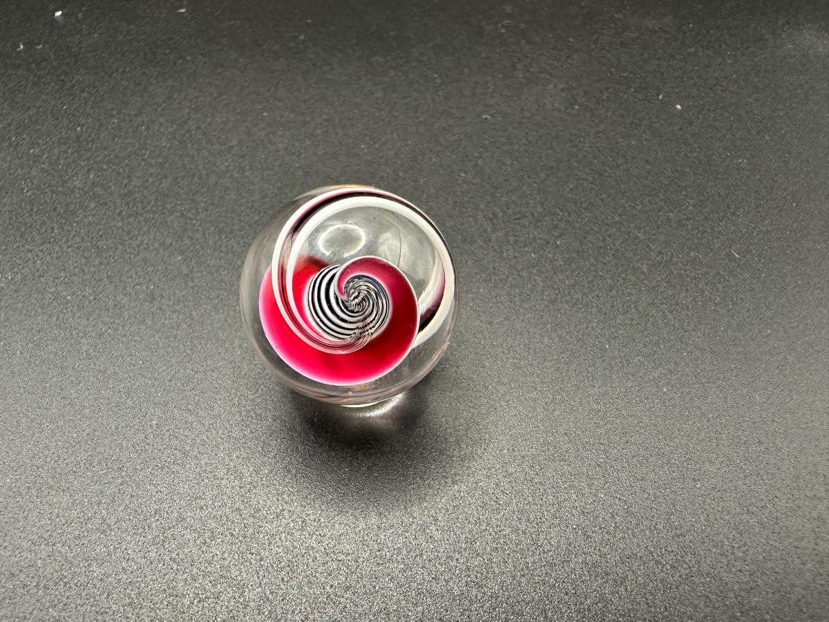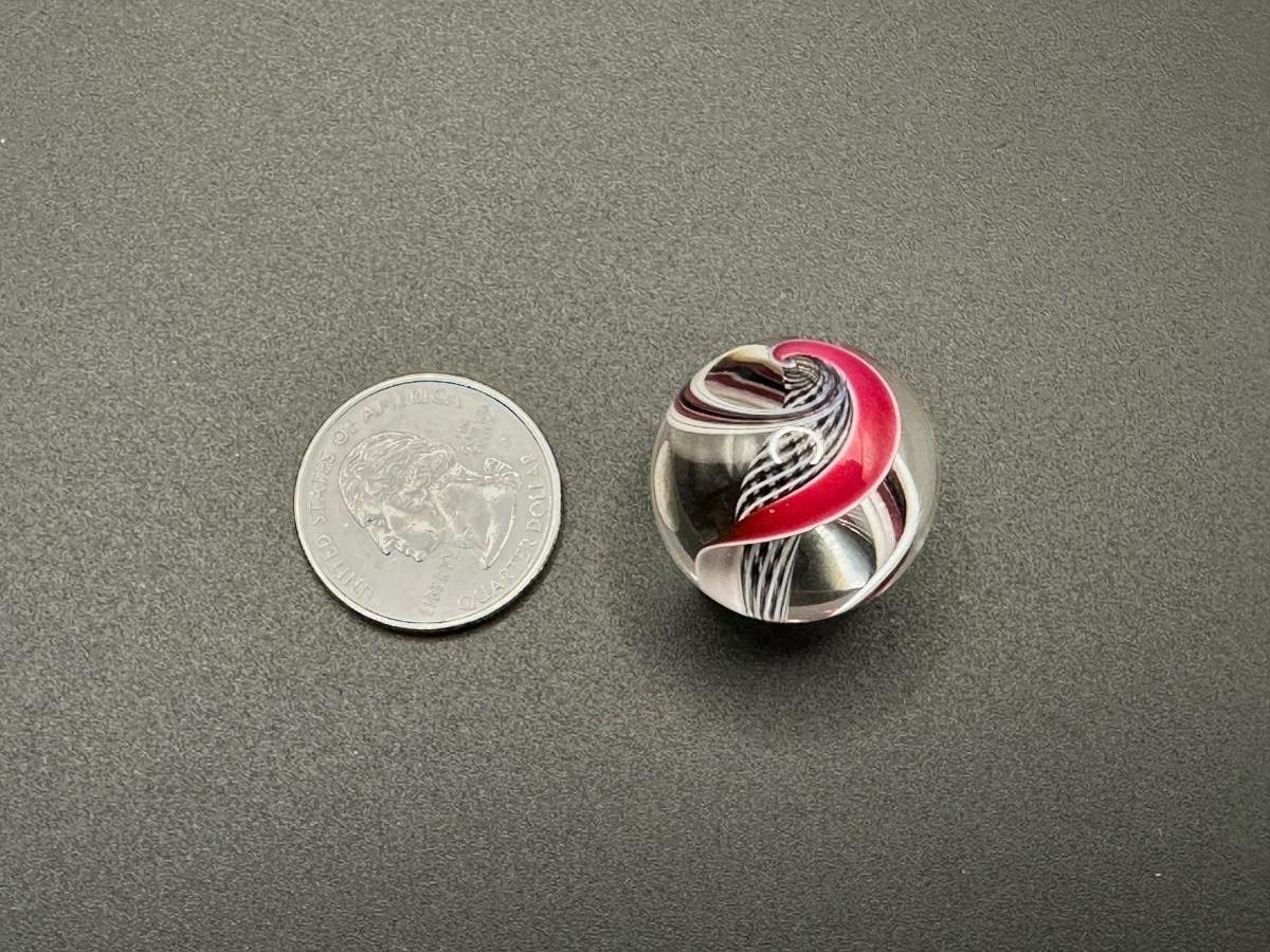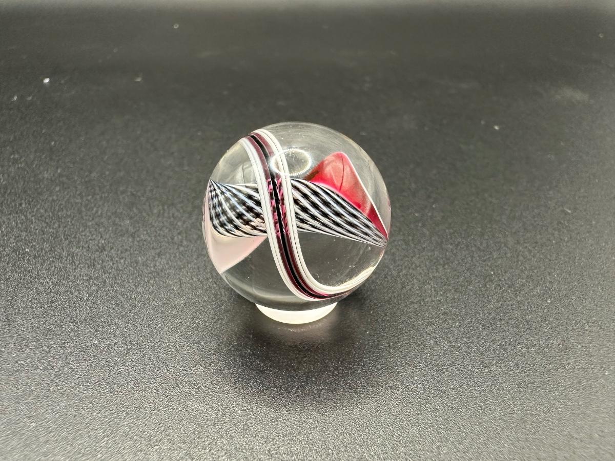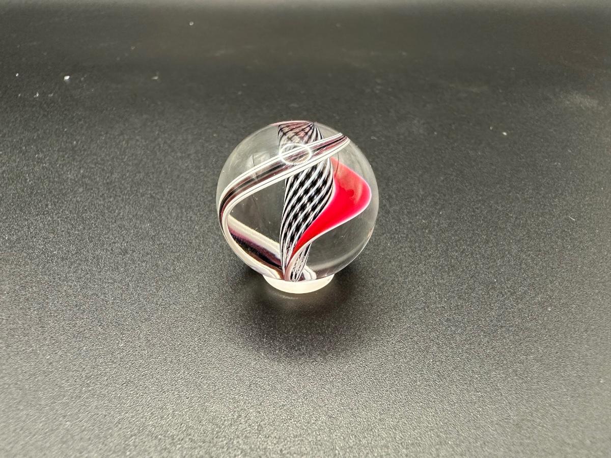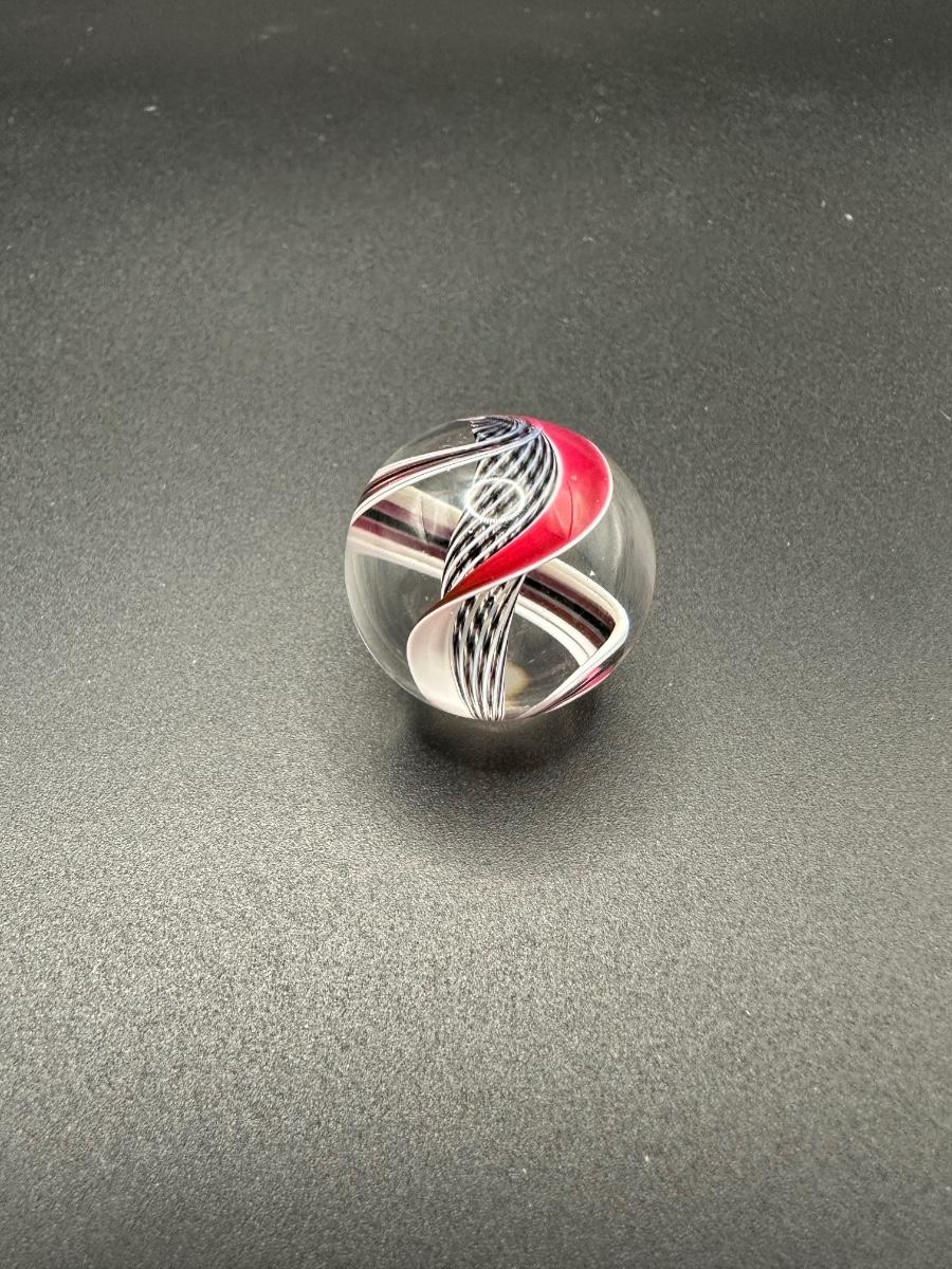 BLACK AND WHITE LATTICINIO CORE MARBLE WITH WHITE, RED, BLACK RIBBONS