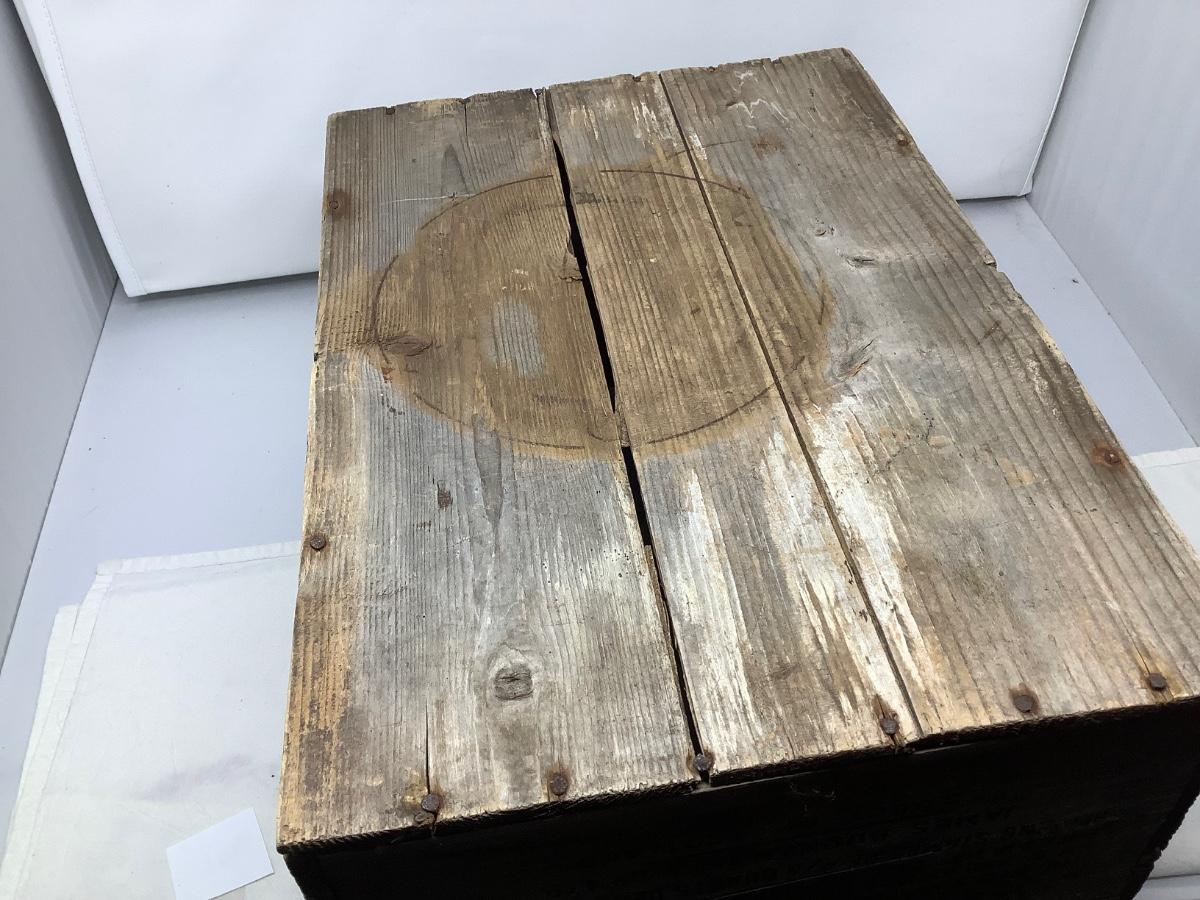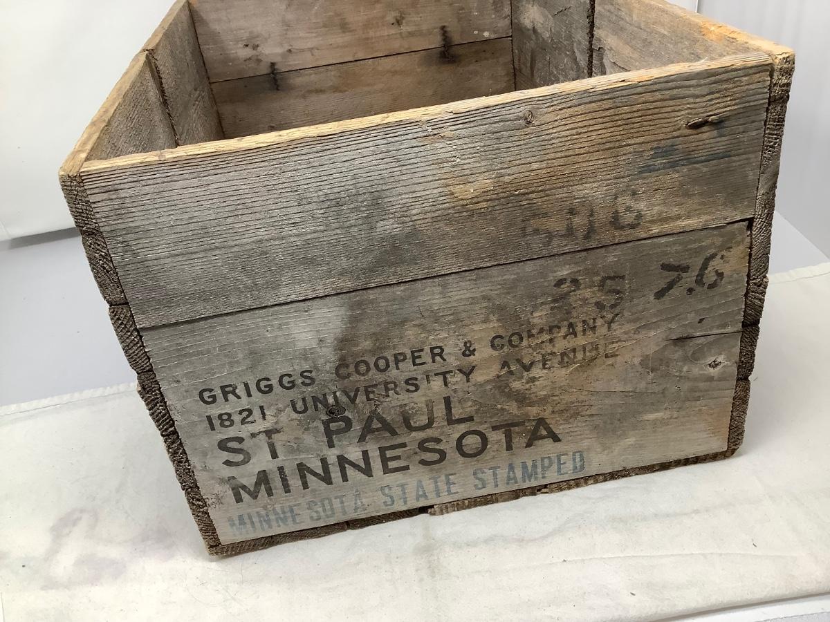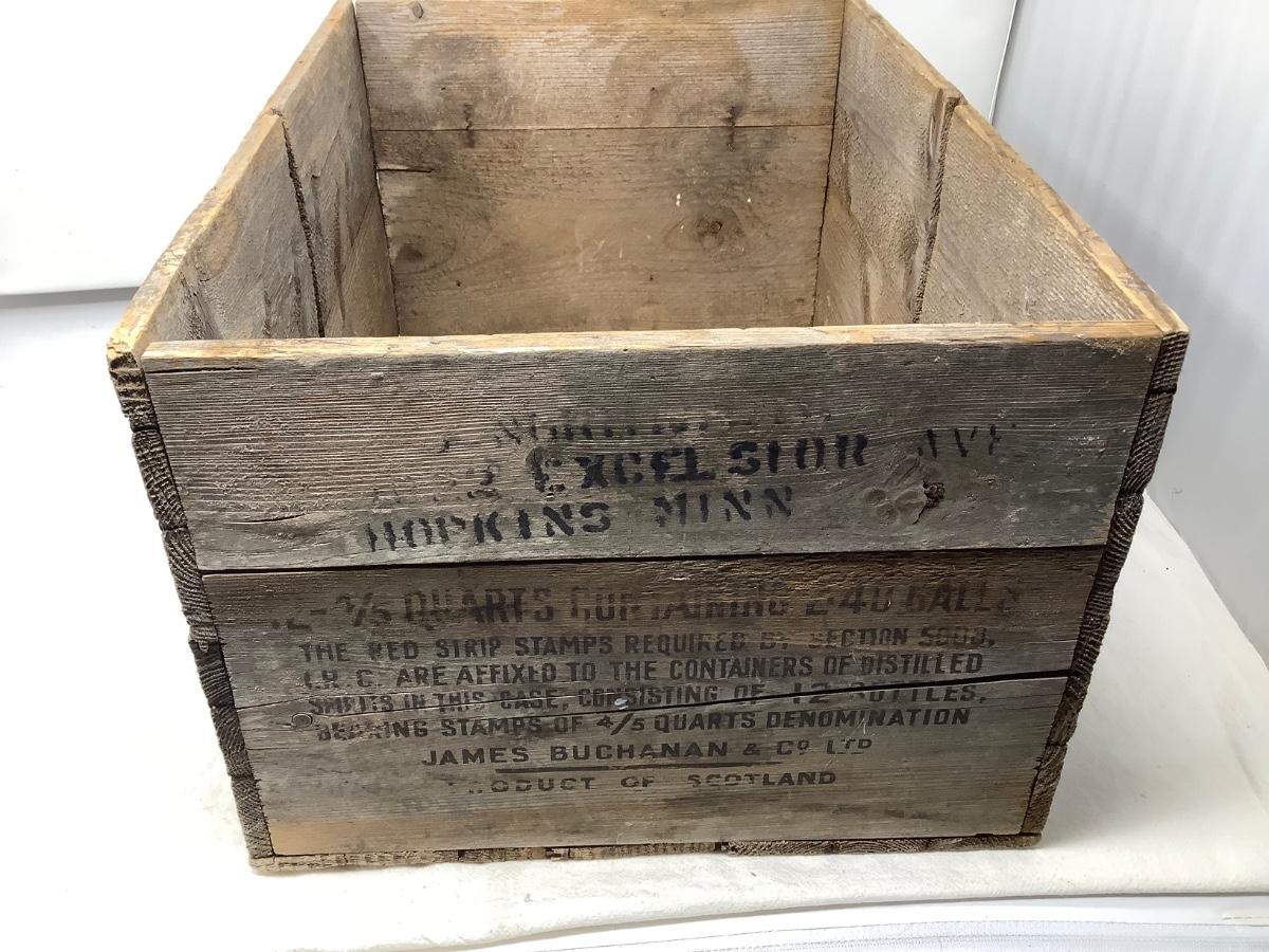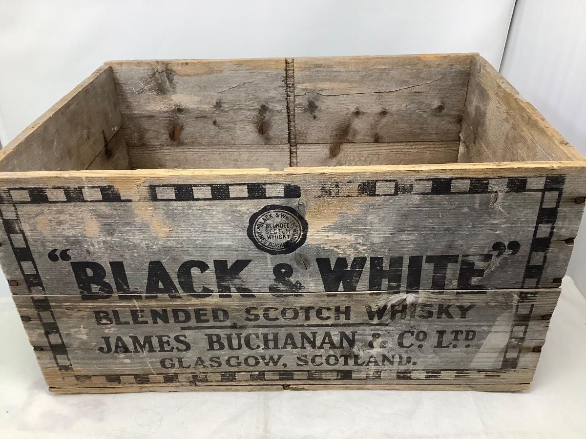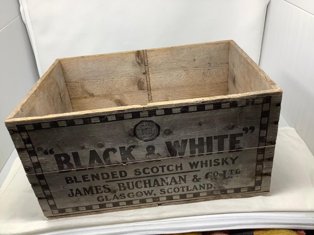 You get this vintage wood Black and White scotch whisky from St Paul / Minneapolis. faded wood but graphics are good.