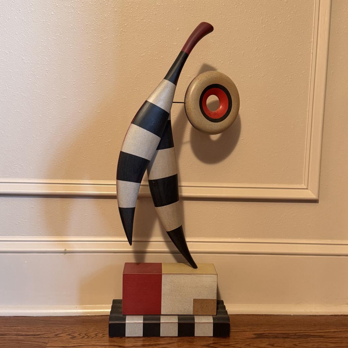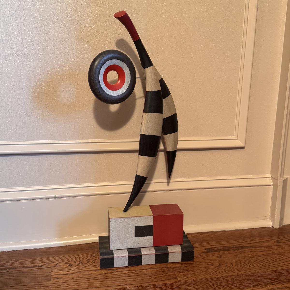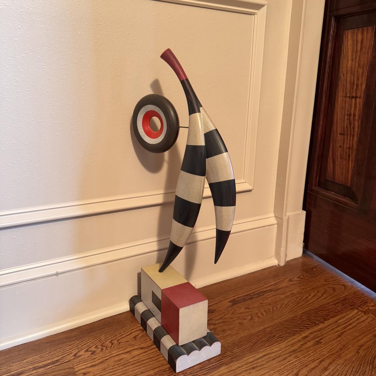This lot includes one black and white striped, multi-shaped sculpture by Sean O’Meallie. The sculpture is all one piece and is made of wood. It appears to be signed and dated with 4.04 on the bottom. The sculpture measures 11” x 4.5” x 26”H. Shipping available. Shipping can be costly. We suggest contacting our preferred local shipping provider, Postage Express, with dimensions and getting an estimate before bidding: (828) 255-9250 or shipping@postageexpressnc.com.