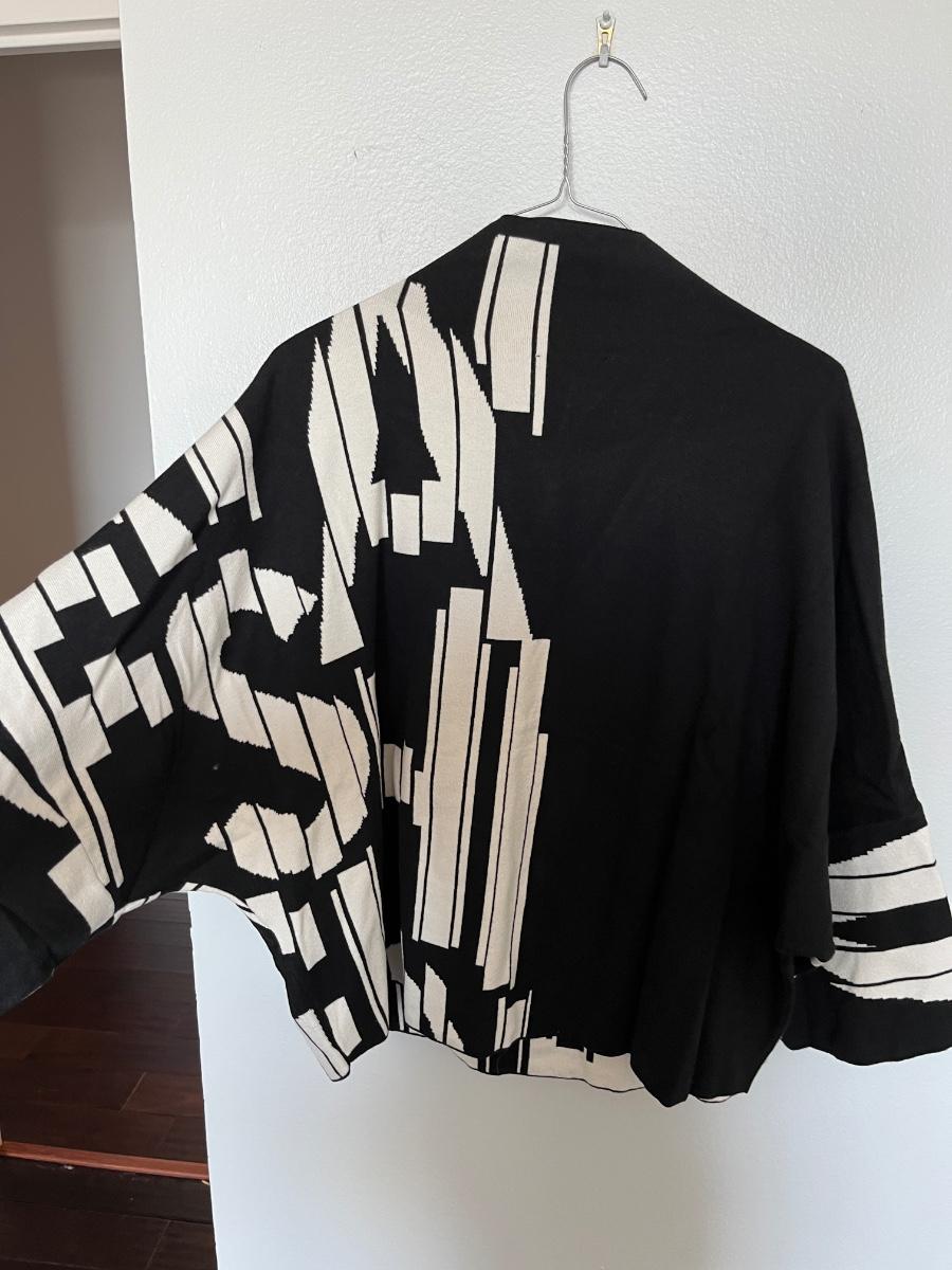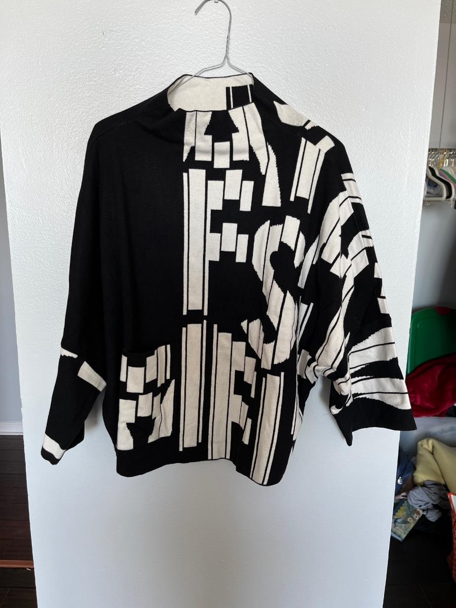 A very cool black and white sweater by Joseph Ribkoff with a bold graphic design of letters in white on the black, loose fitting with dolman sleeves and a high collar.