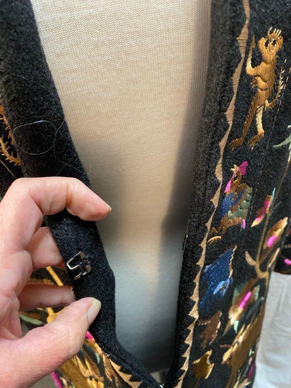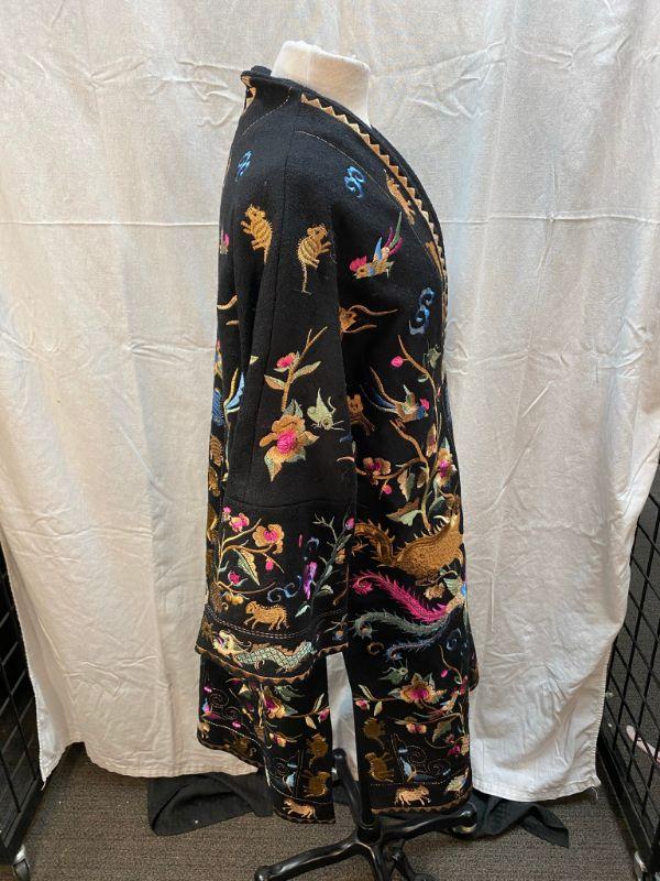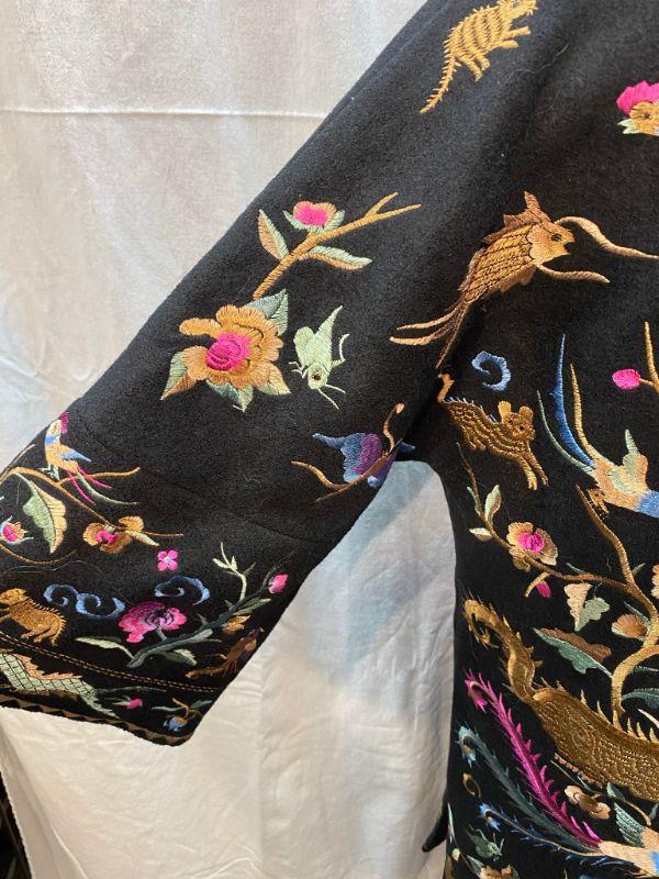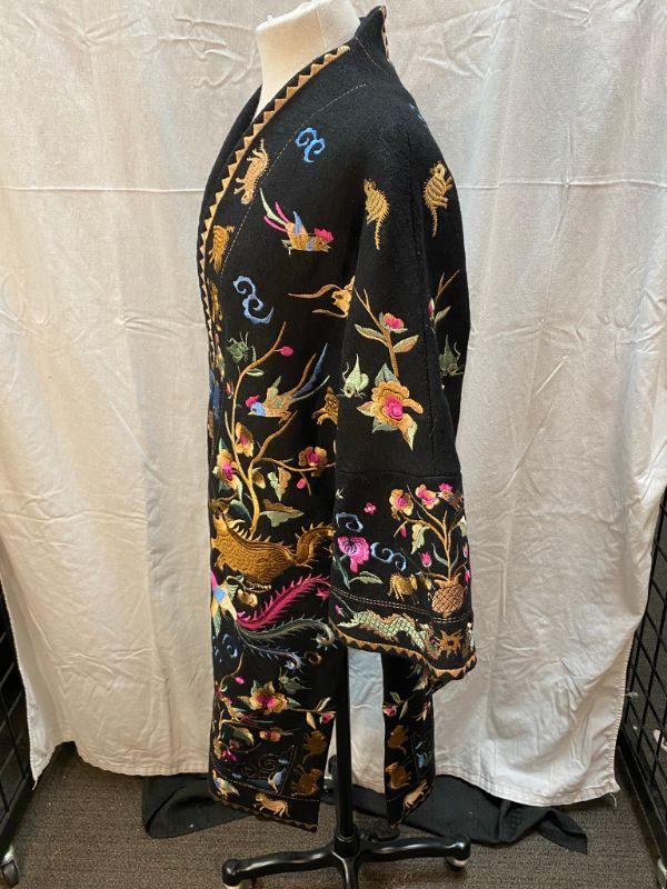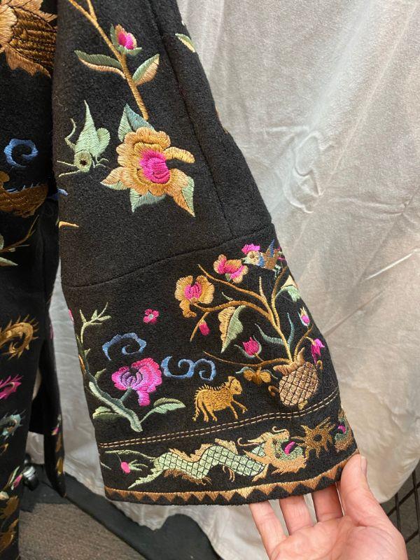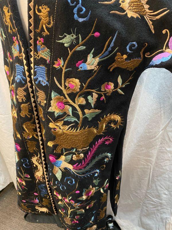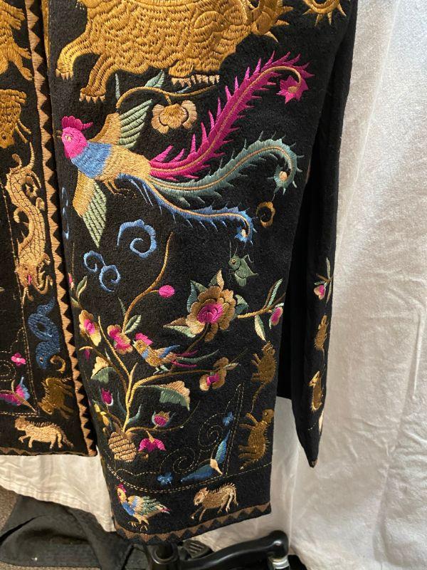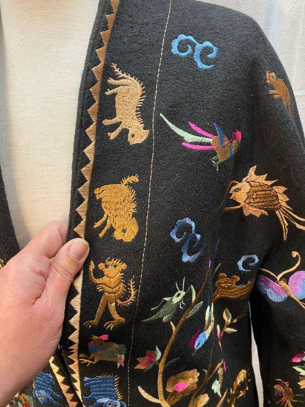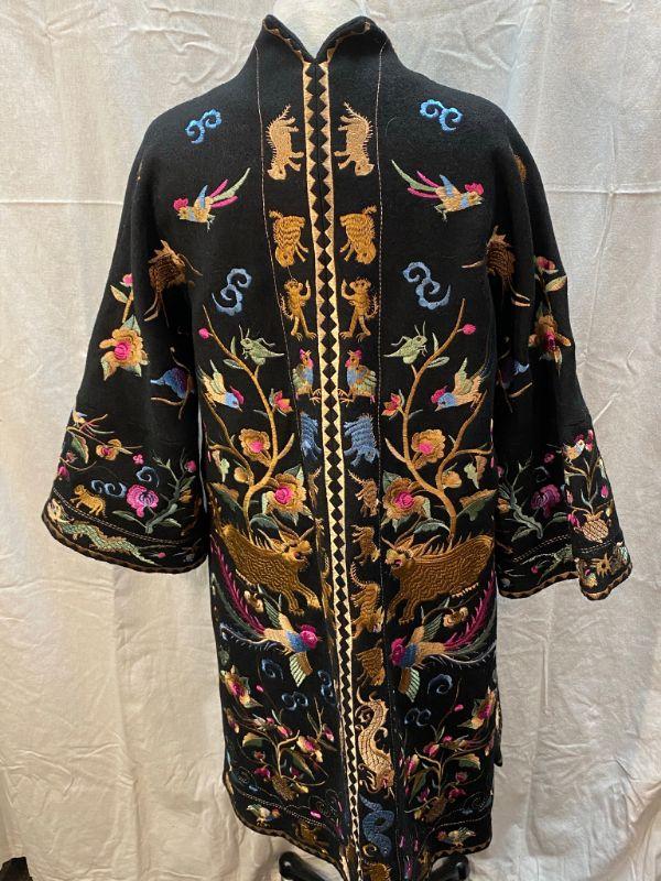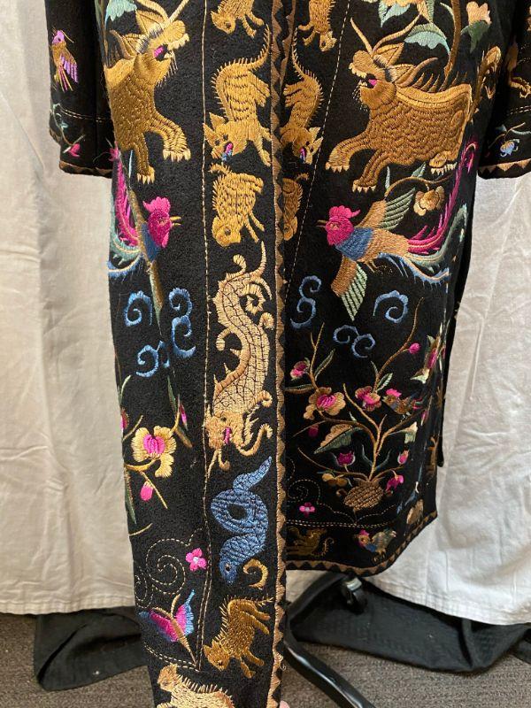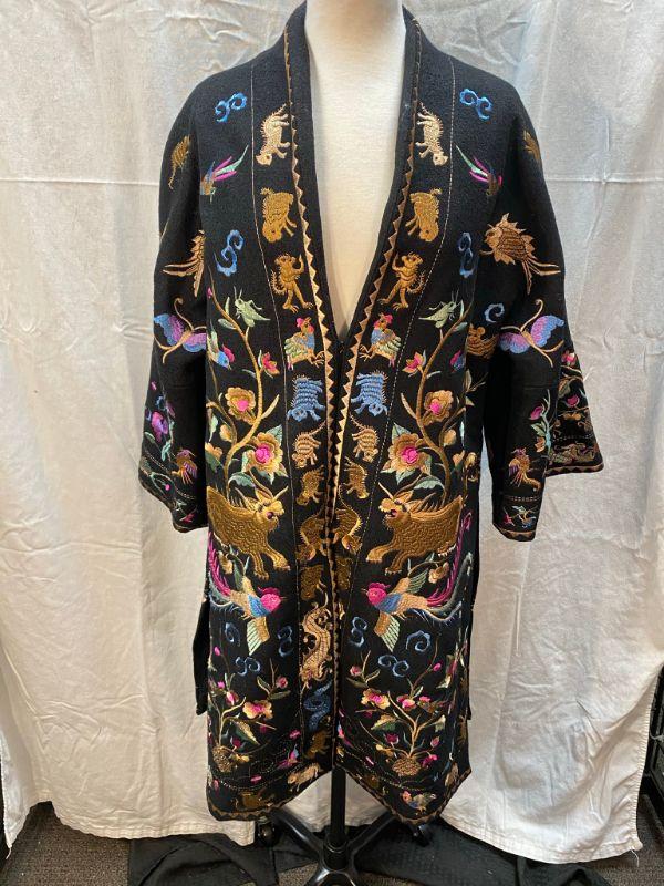 Beautiful animal & flower embroidered kimono jacket. Highly detailed almost fully covered in embroidery work. Hook and eye closure. Tag says it is an XXL but it is not true to size, looks more like a medium. In great condition. Knee length.