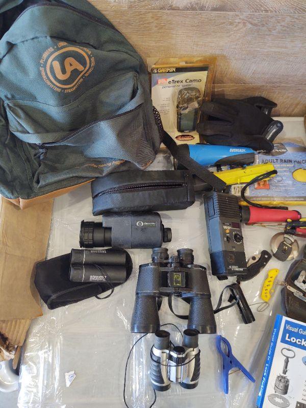 lot 231 - Green backpack, binoculars, flashlights, pancho, night vision scope, gloves, pocket knives, lock picking book/set, etc.
