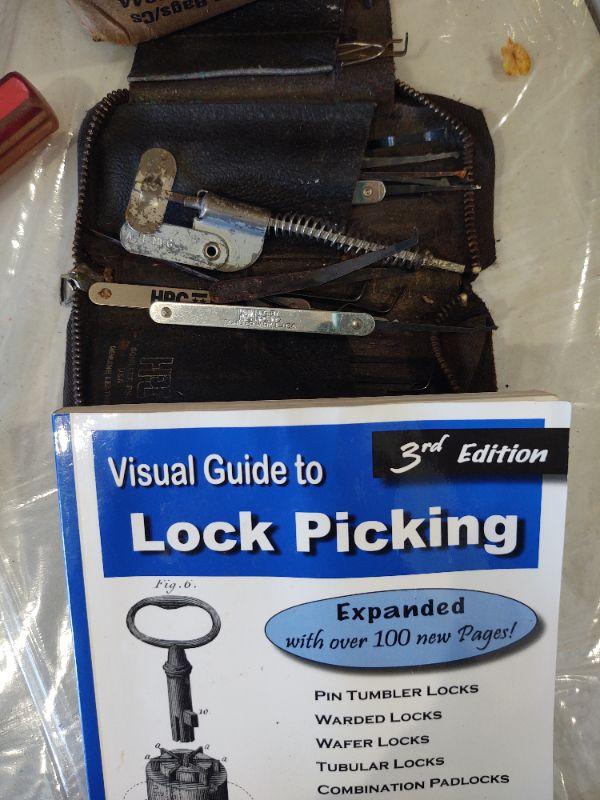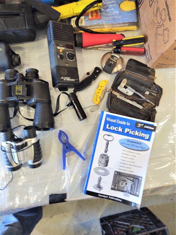 Green backpack, binoculars, flashlights, pancho, night vision scope, gloves, pocket knives, lock picking book/set, etc.