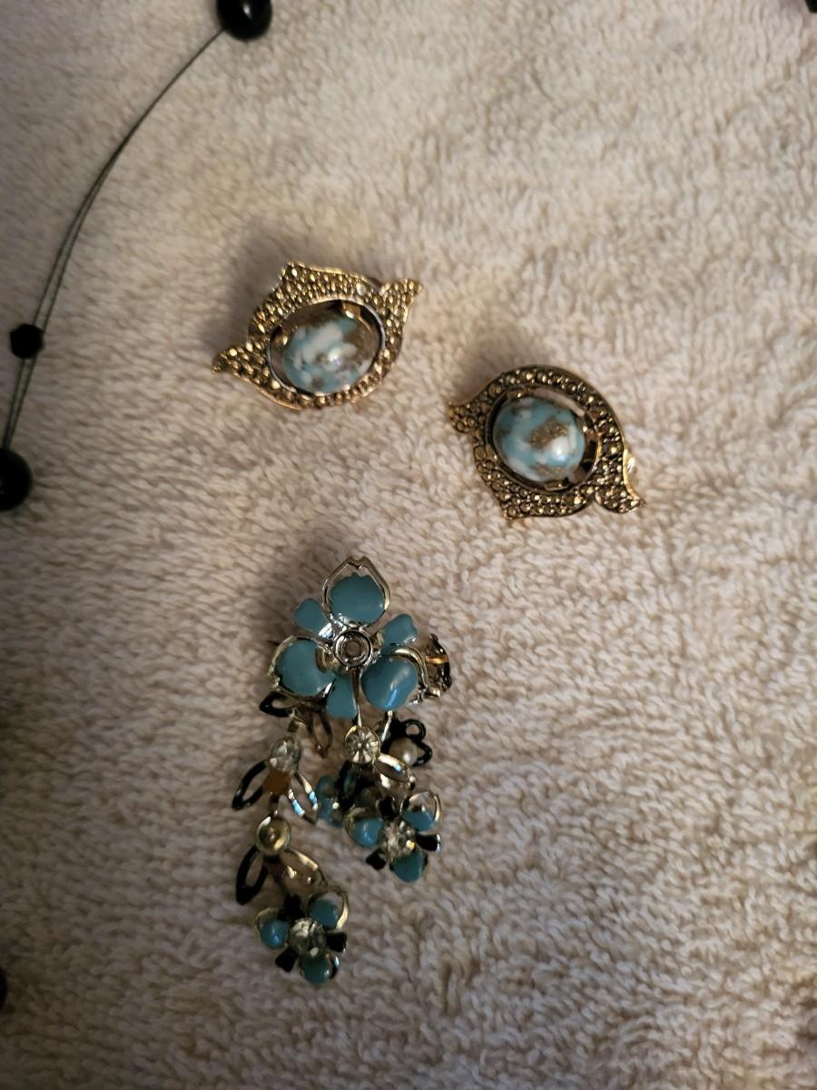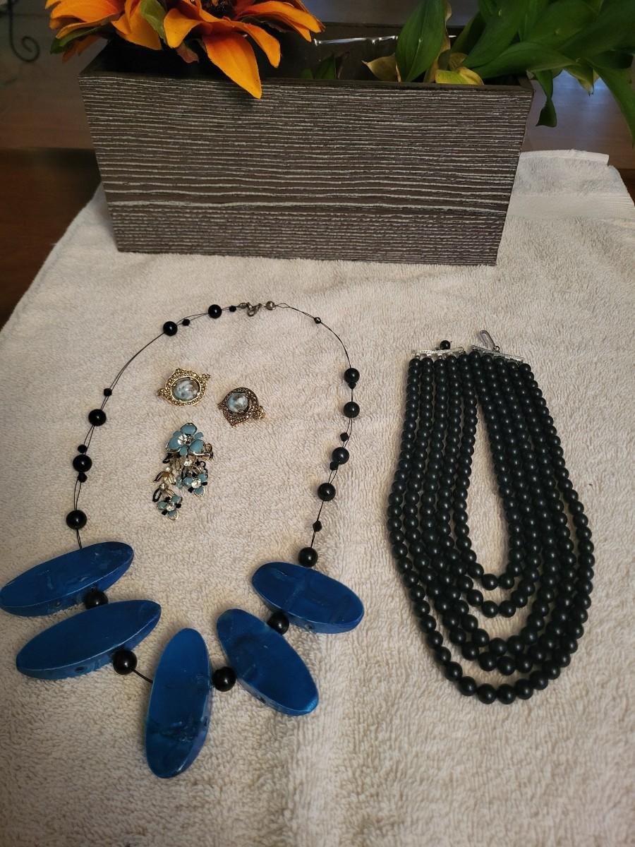 BLACK BEADED NECKLACE, BROOCH, EARRINGS AND NECKLACE