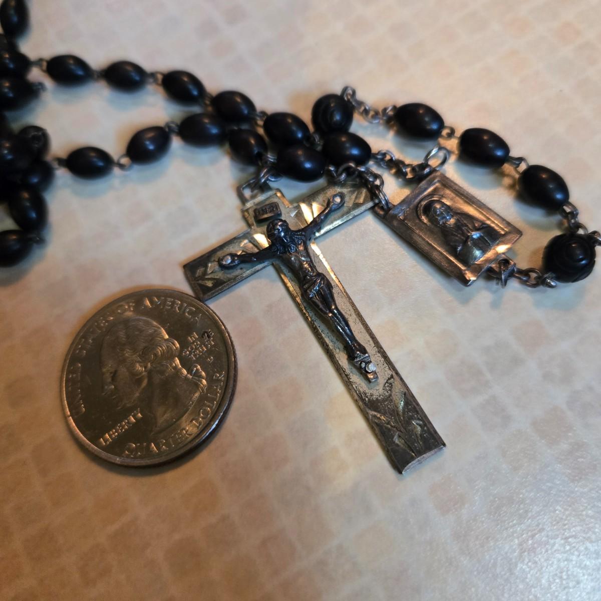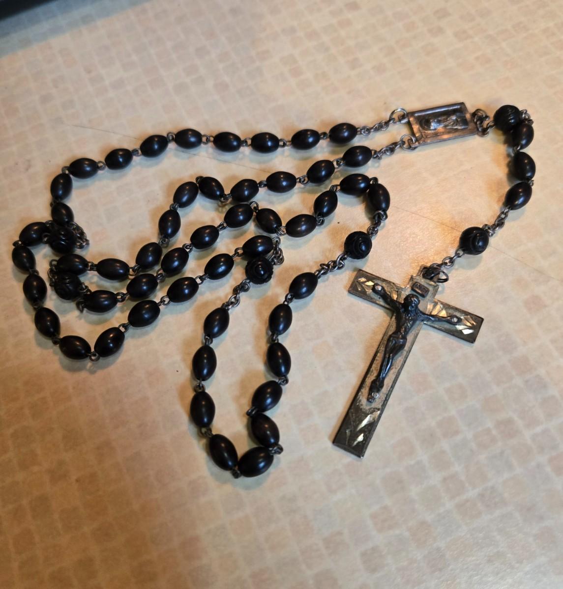 This auction lot is for a Black Beaded Rosary. This is a very nice Black Beaded Rosary.. It has Rome etched on the back of the cross, This most likely was used for a young man's First Communion. It is in very good condition.