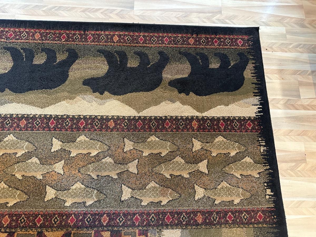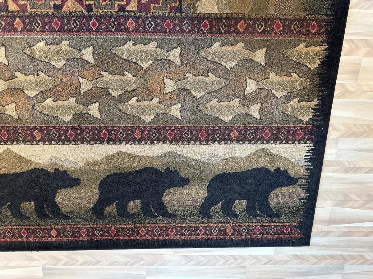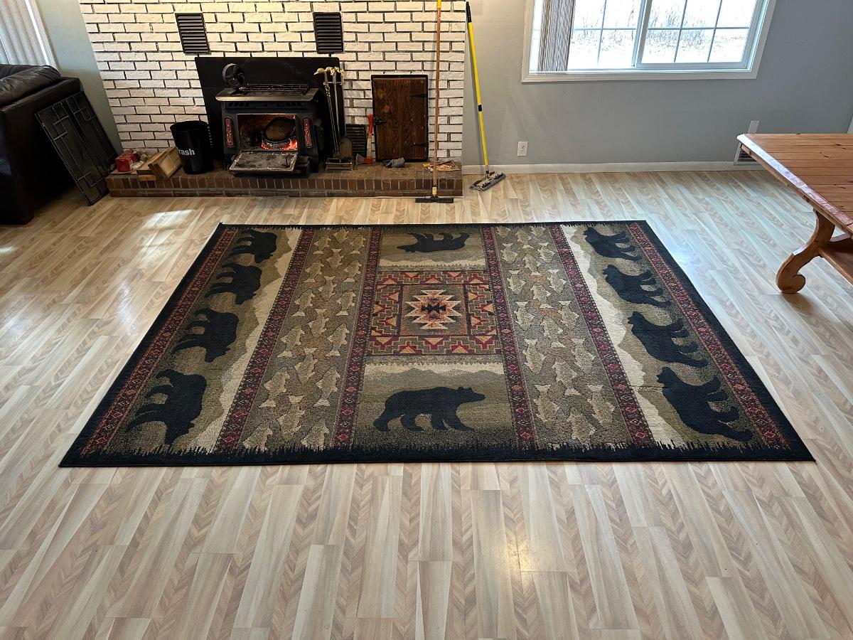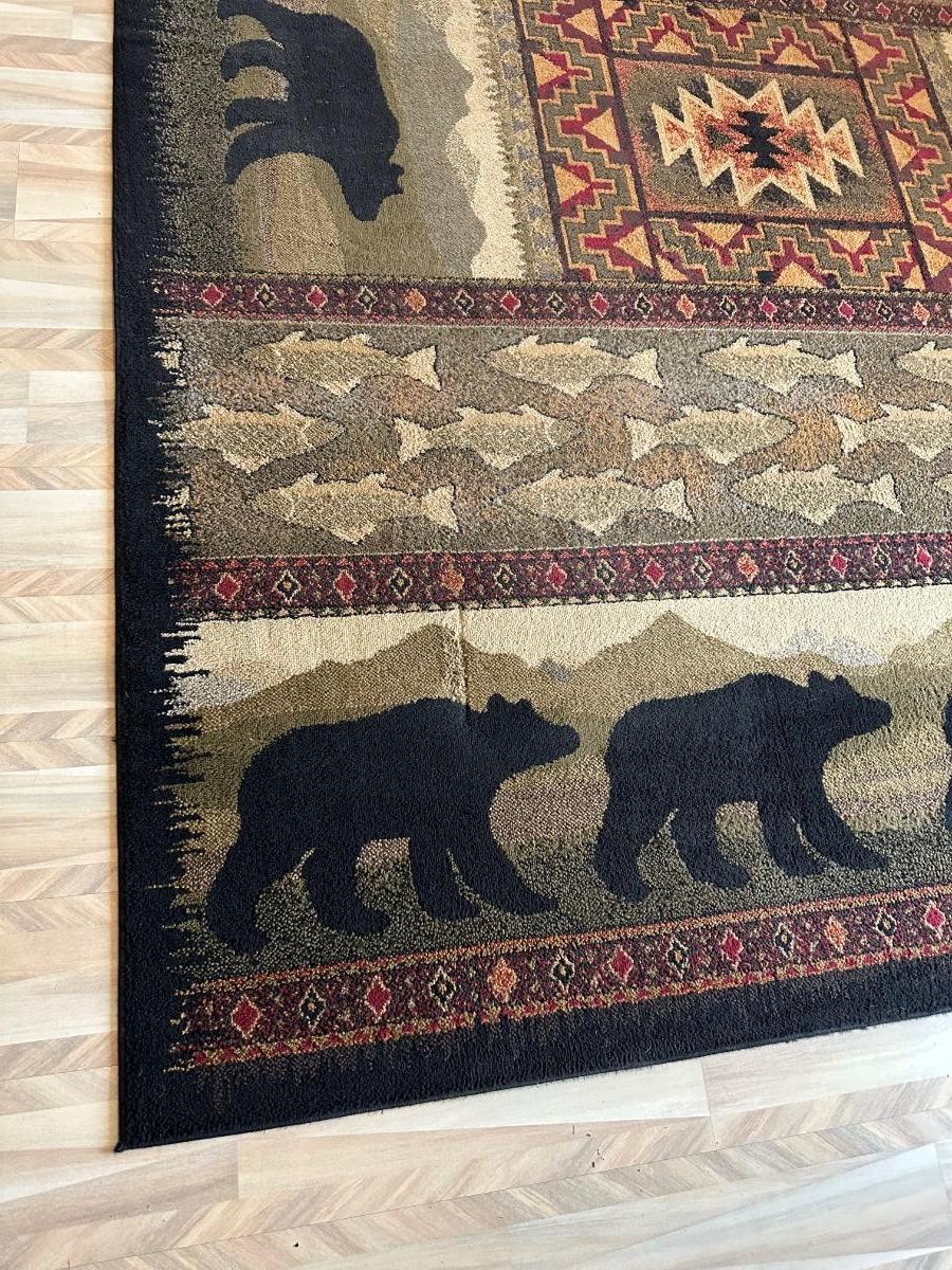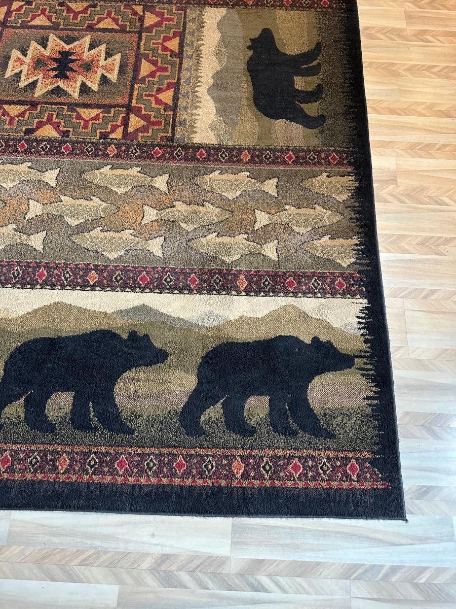 Black bears oversized area rug. Did see a burn mark, see picture. All details and size are in the pictures.