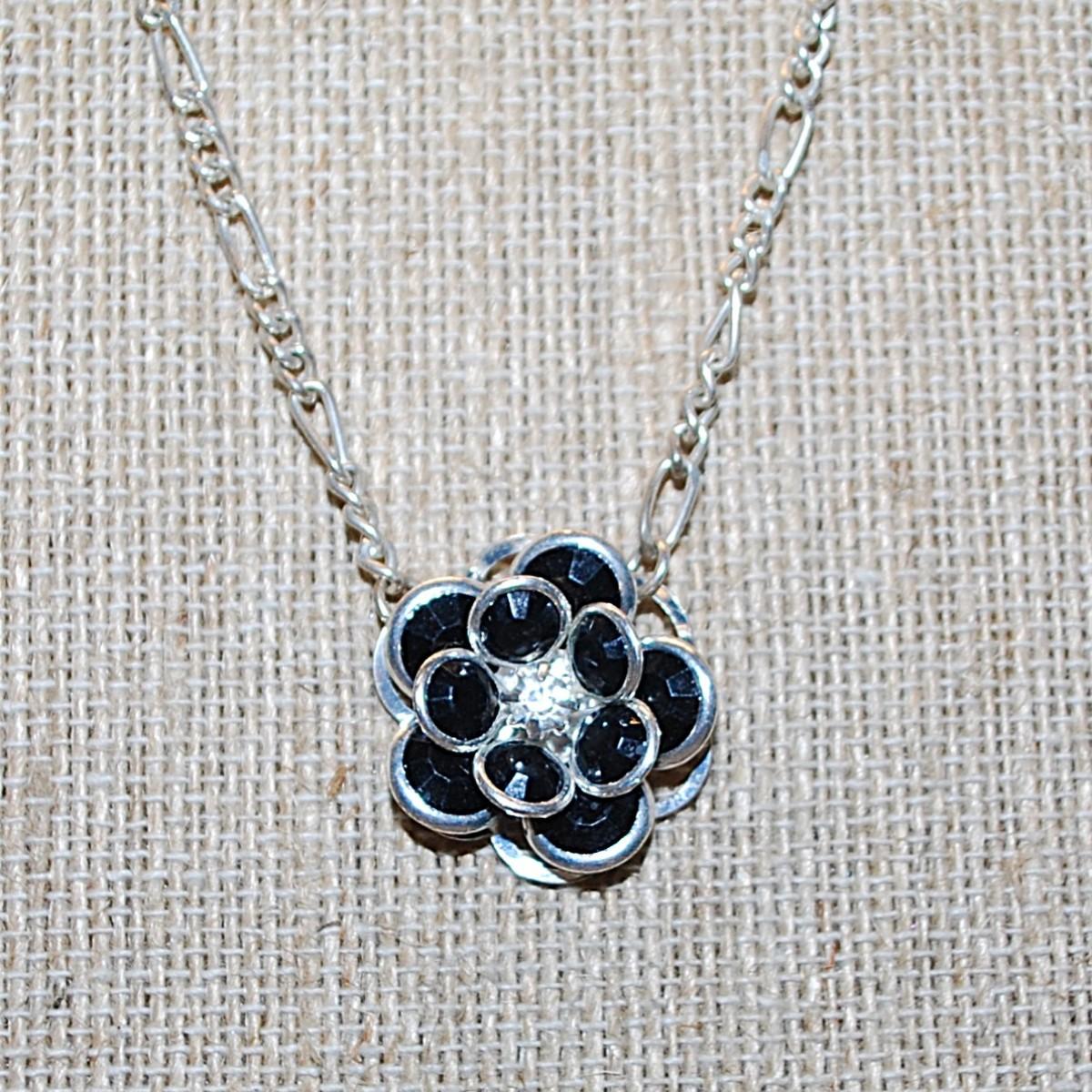 Black Beveled Beaded FLOWER NECKLACE with Silver Tone Edges on a Silver Tone Necklace Chain and Lobster Clasp 17" L