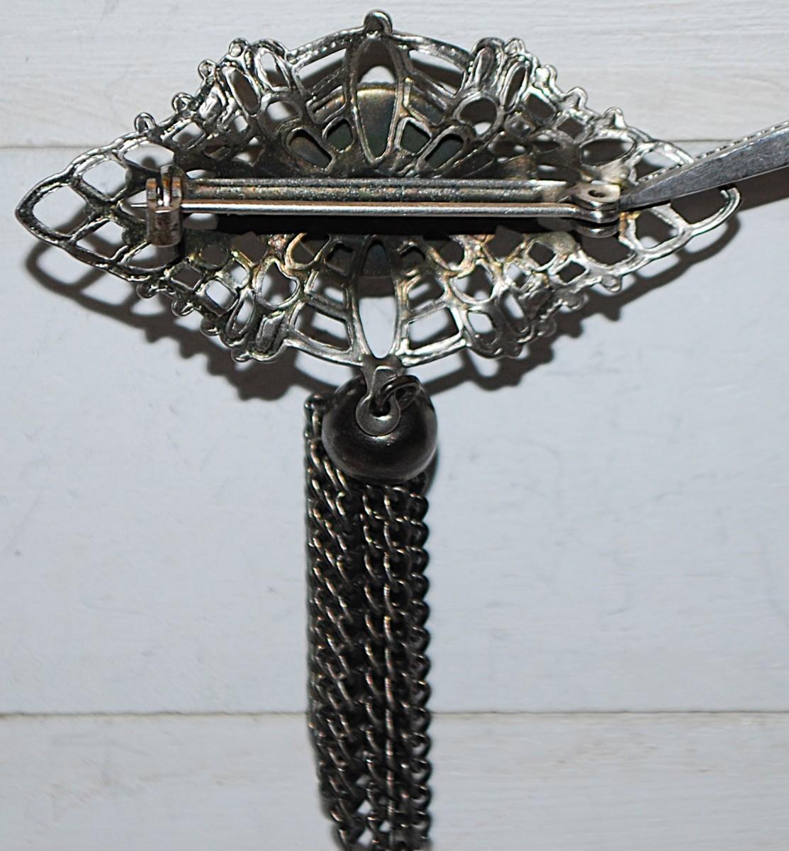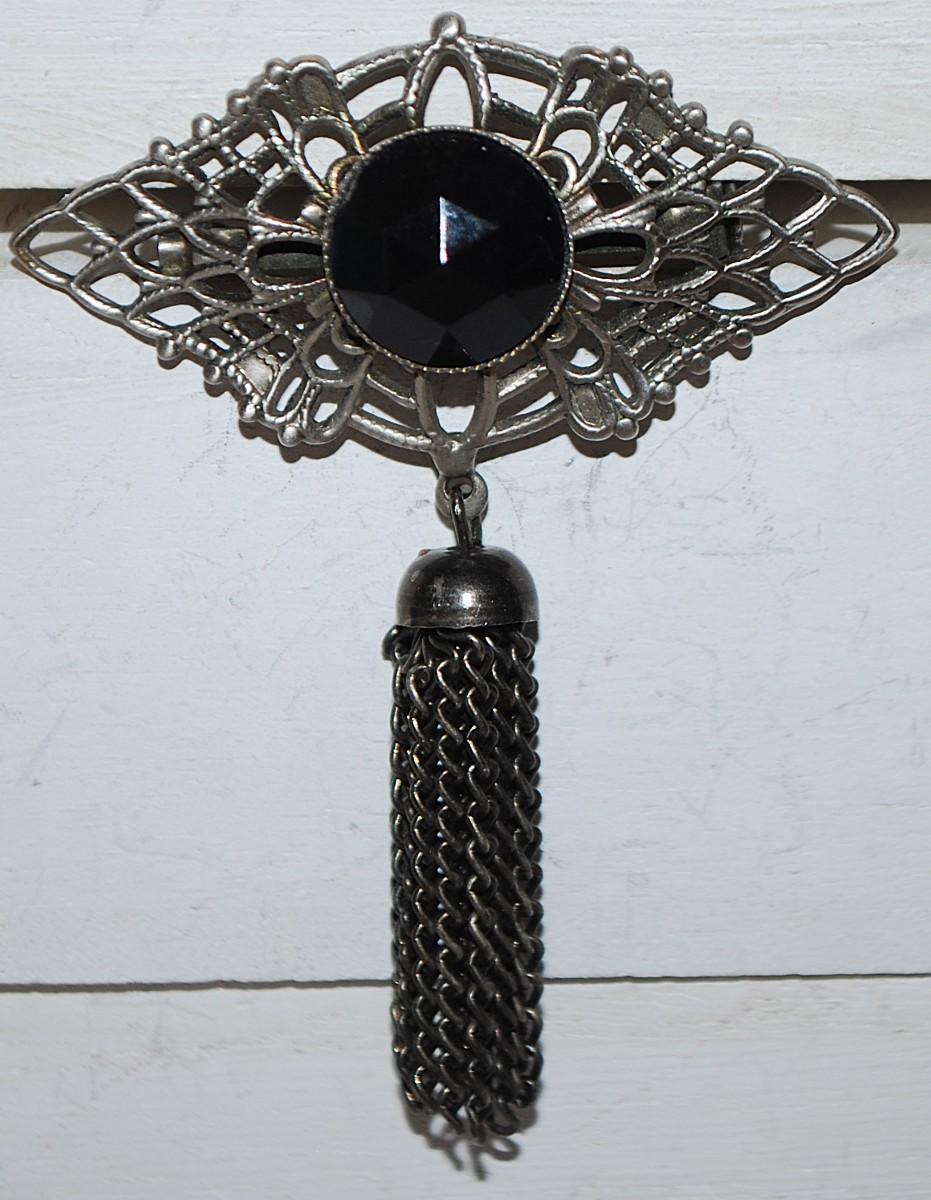 Black Beveled Round Stone BROOCH (2½" x 2") with Dark Chain Dangles & Grill Silver Tone Setting
