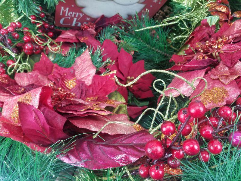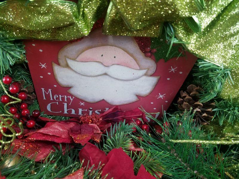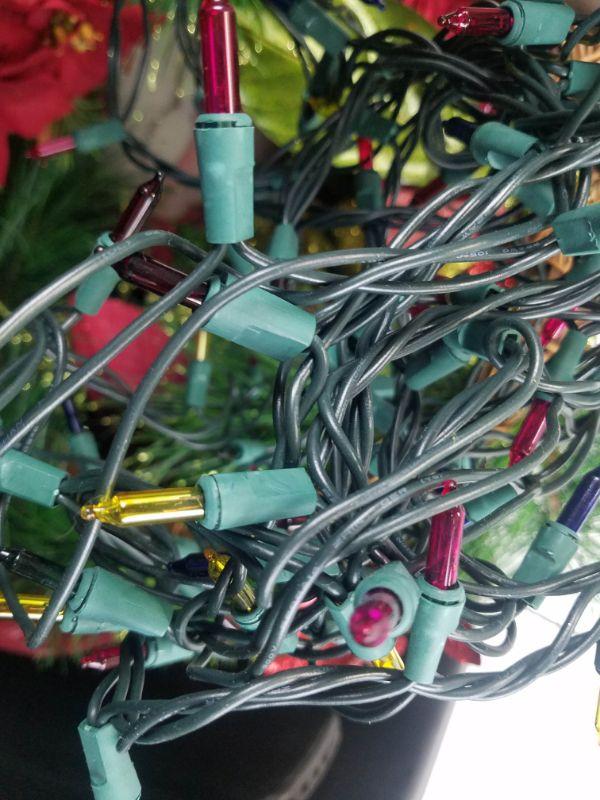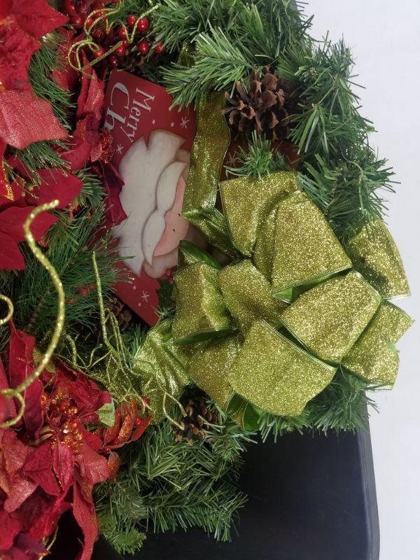 Black Bin of Christmas Decor: 2 wreaths, 1 centerpiece, lights, etc.