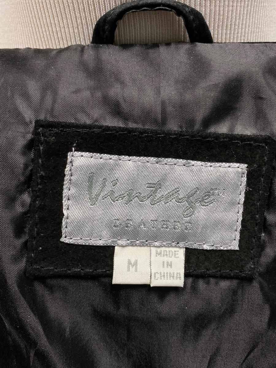 Black with blue details leather motorcycle jacket. Zip front, flat collar, zipper pockets. Made by Vintage Leather, size medium. In good worn condition.