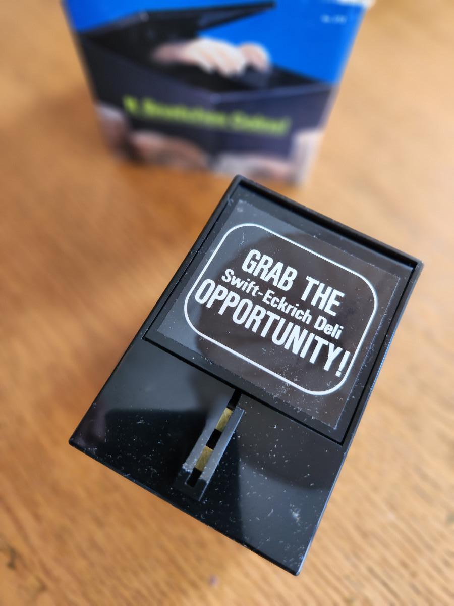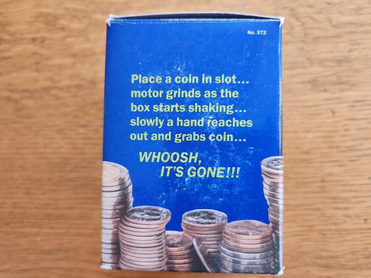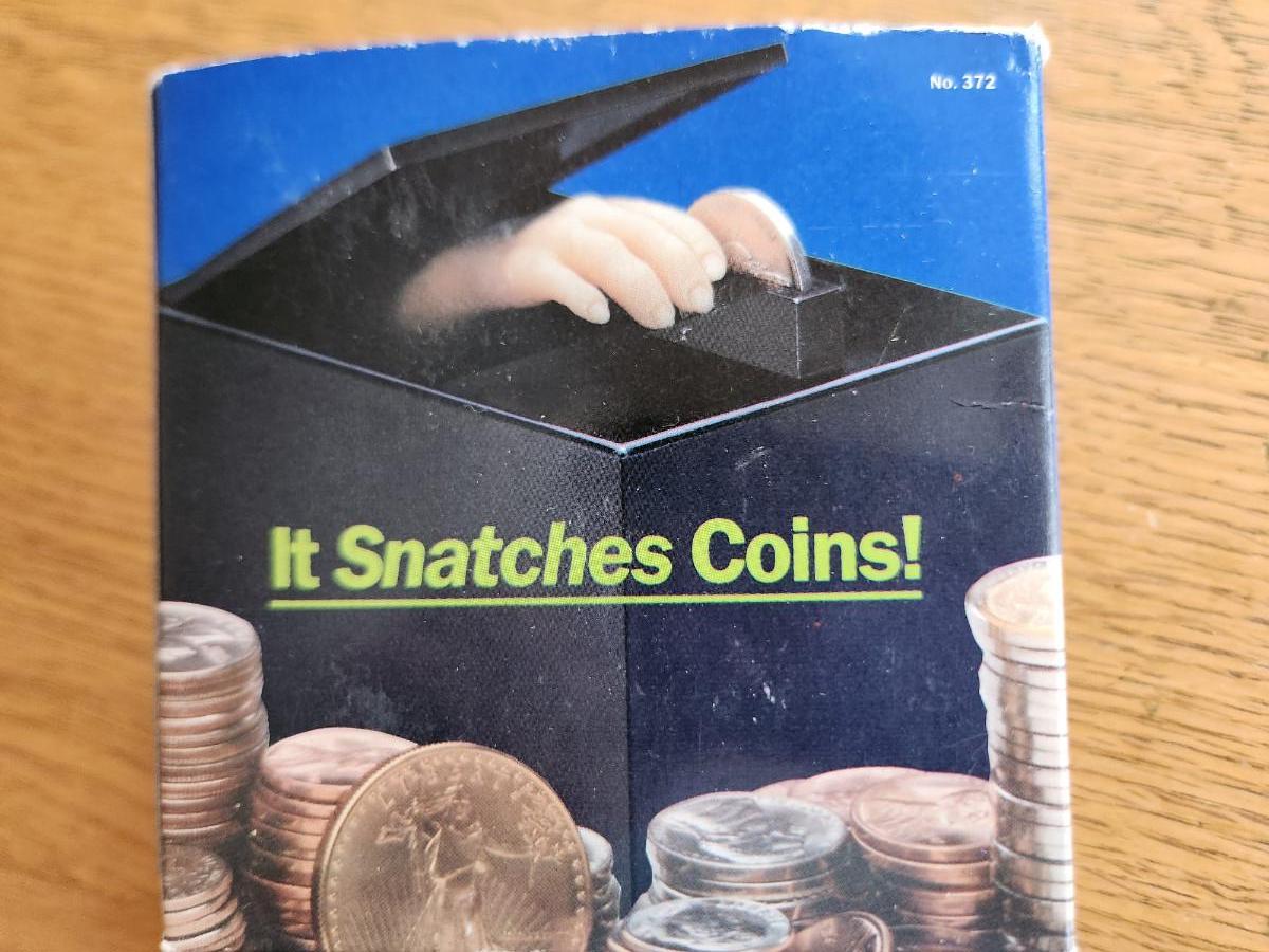 This auction lot is for a Black Box Money Trap, This unique bank literally snatches whatever coin you put in the slot of saving. Takes a battery to work. Has at least one coin inside. We didn't test but appears in good shape in the original box.