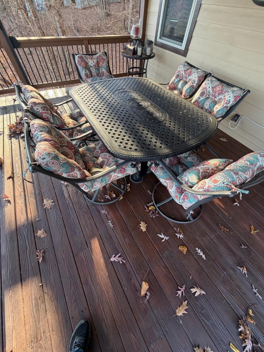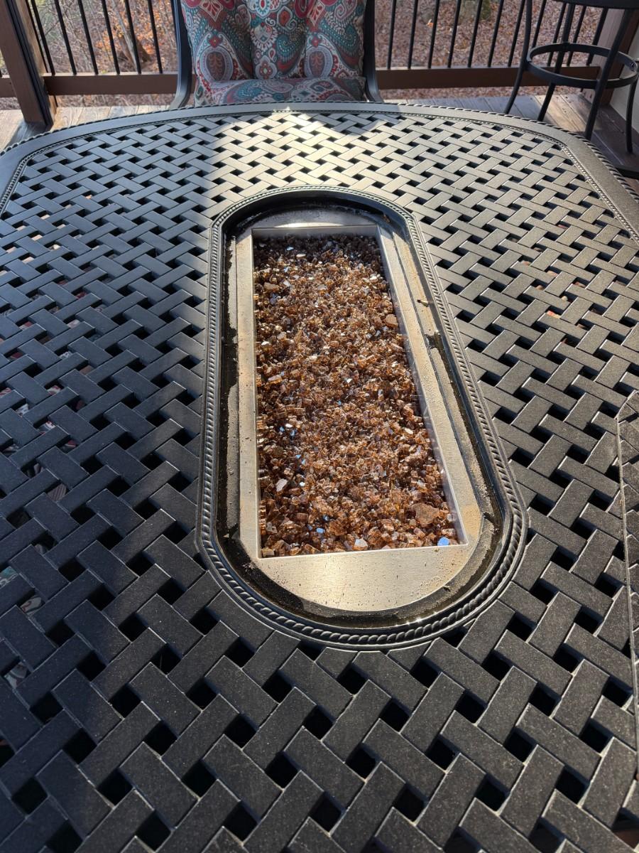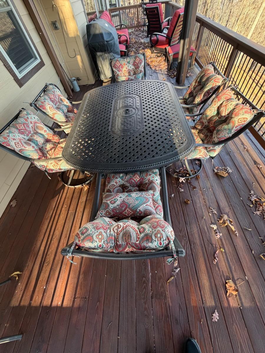 Black Cast Aluminum Outdoor Dining Table with Center Fire Pit, Six Swivel Chairs and cushions