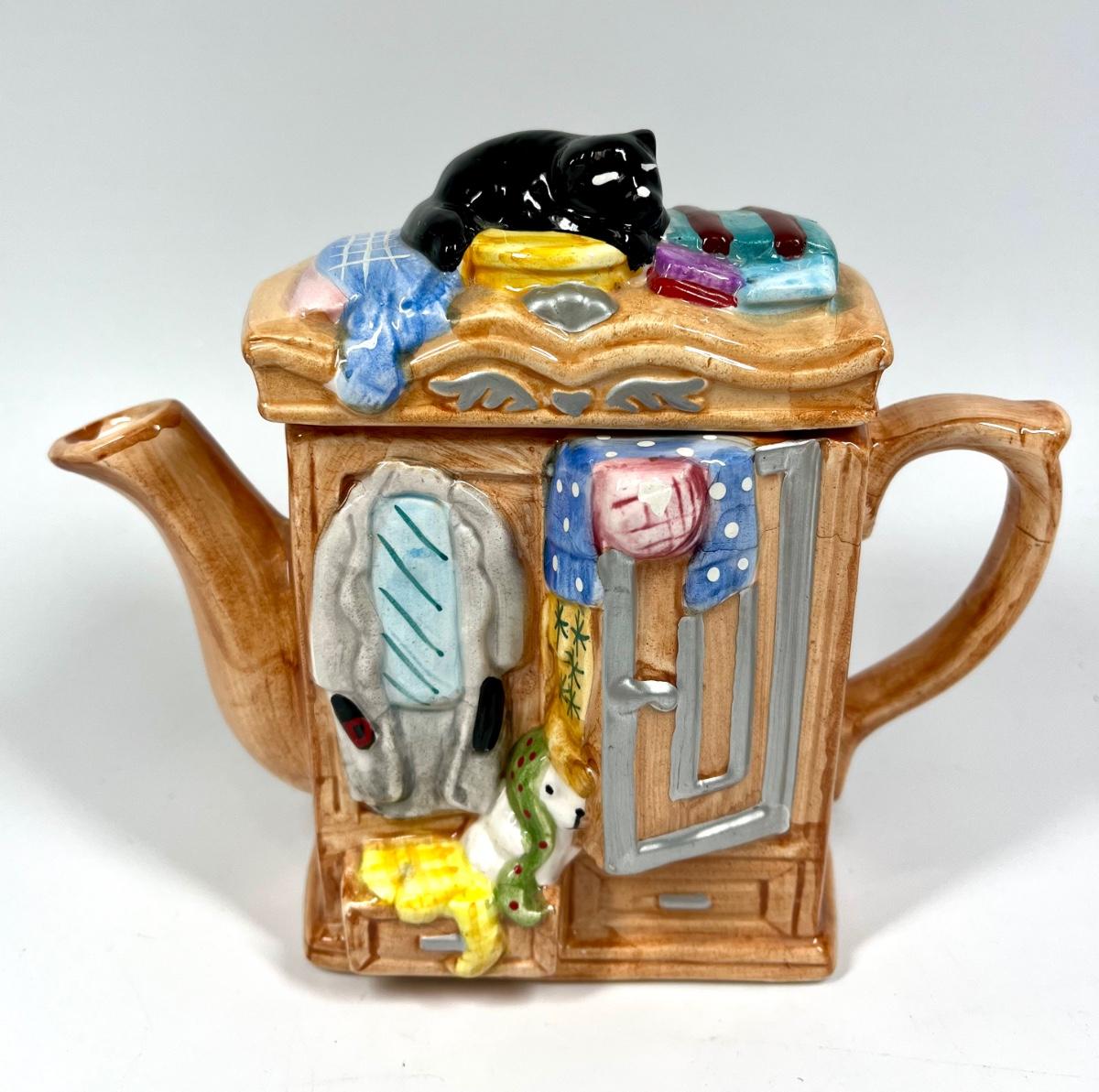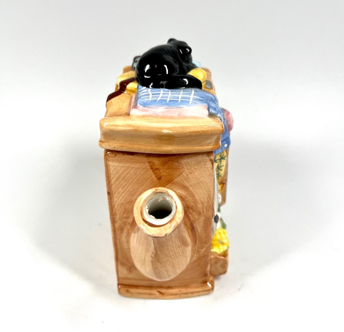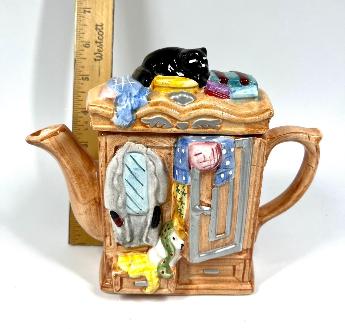 Hand Painted Black Cat on Dresser Novelty Ceramic Teapot. Good condition.