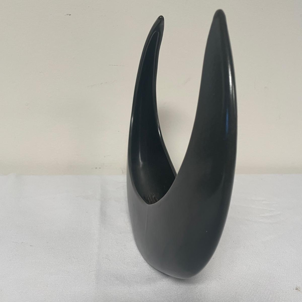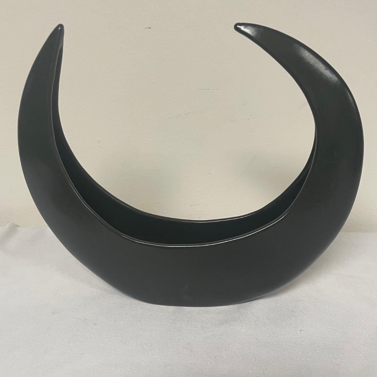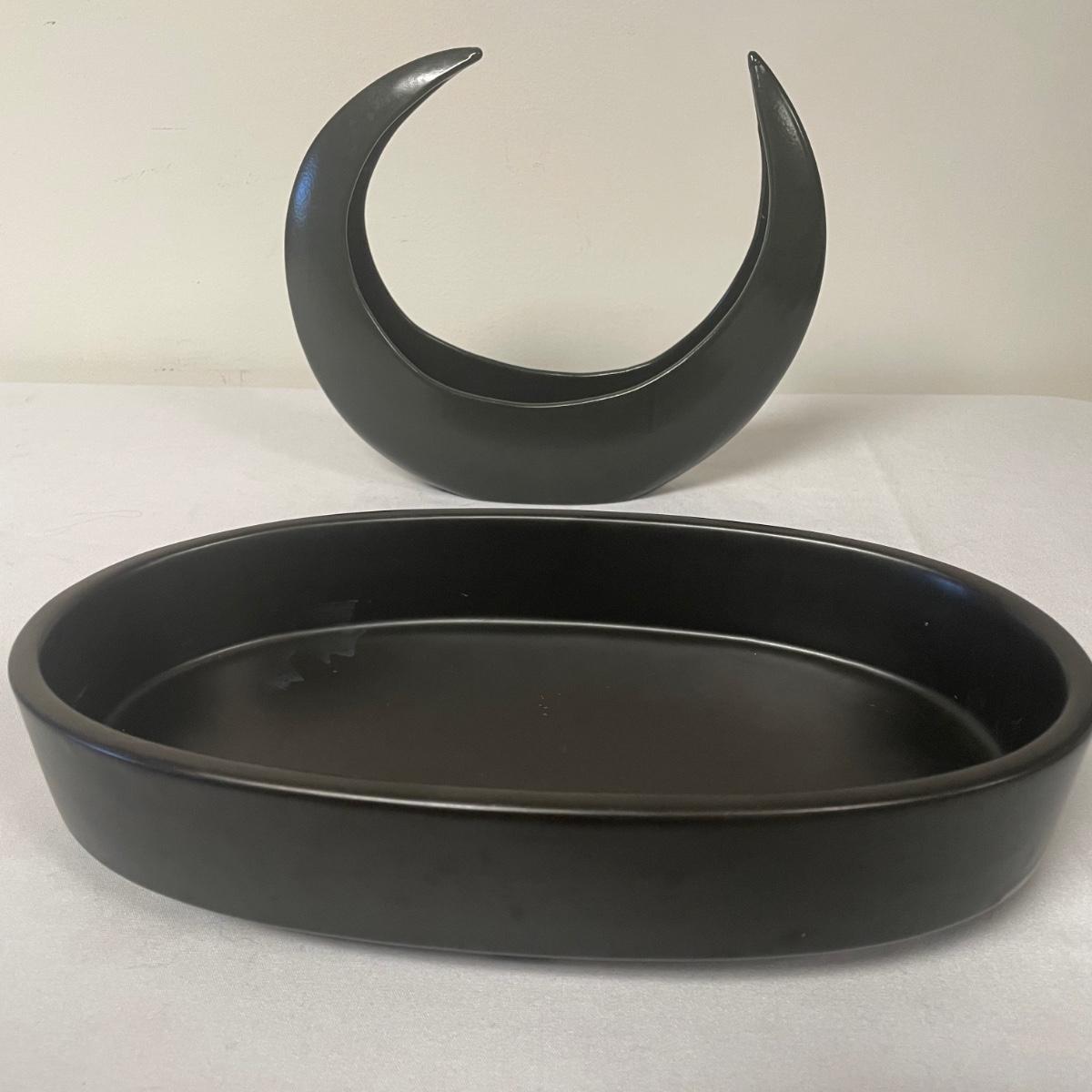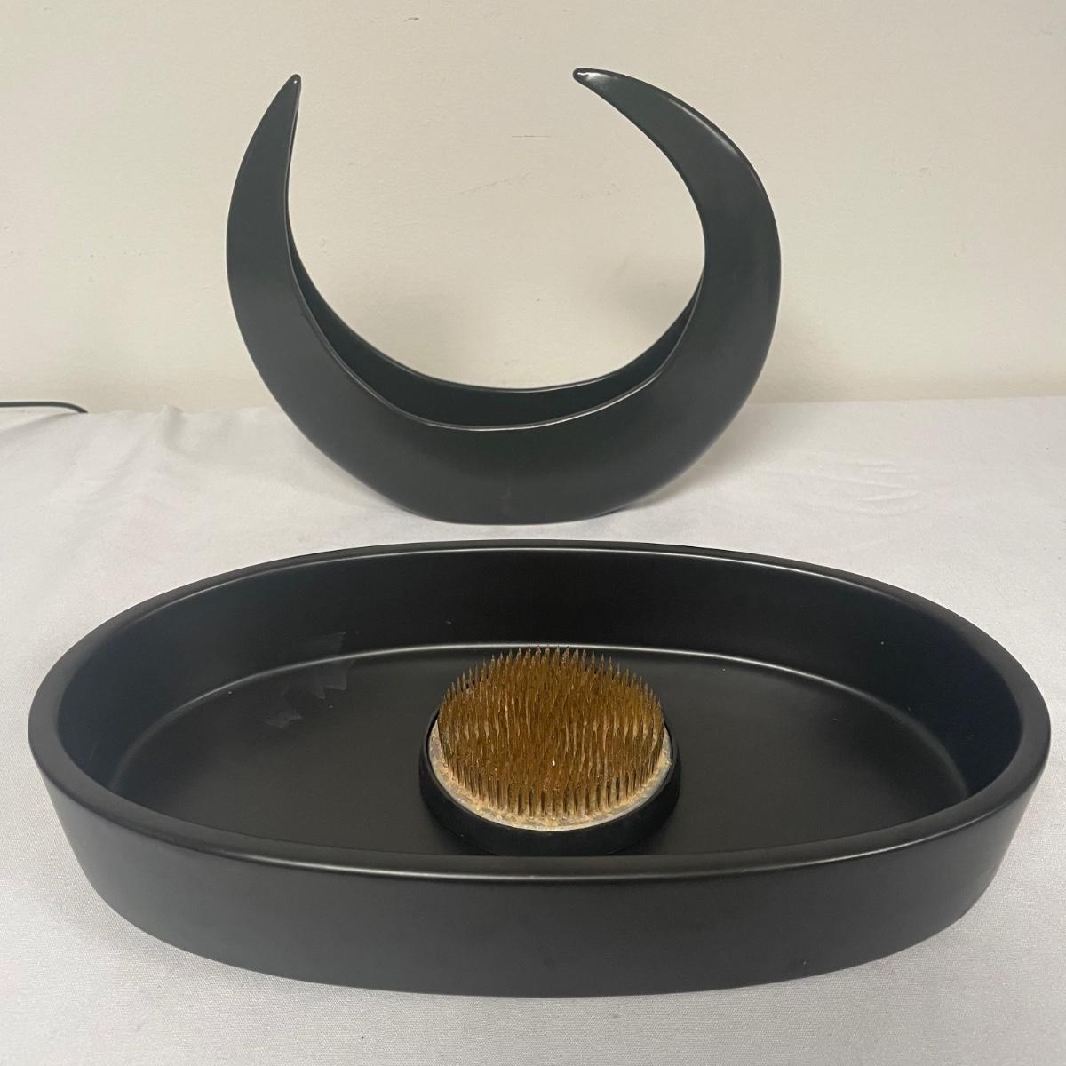 This ceramic duo have a black matte glaze and both have removable metal flower holders that fit in the vase. The moon shaped piece has its label intact (other sticker is partially worn off) that state North America Trading Company, Made in Japan. The flatter piece has two small areas where the glaze went slightly cloudy, see images.