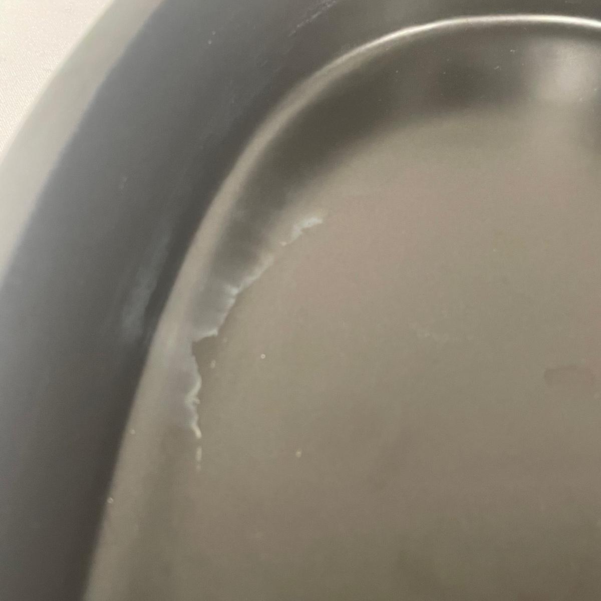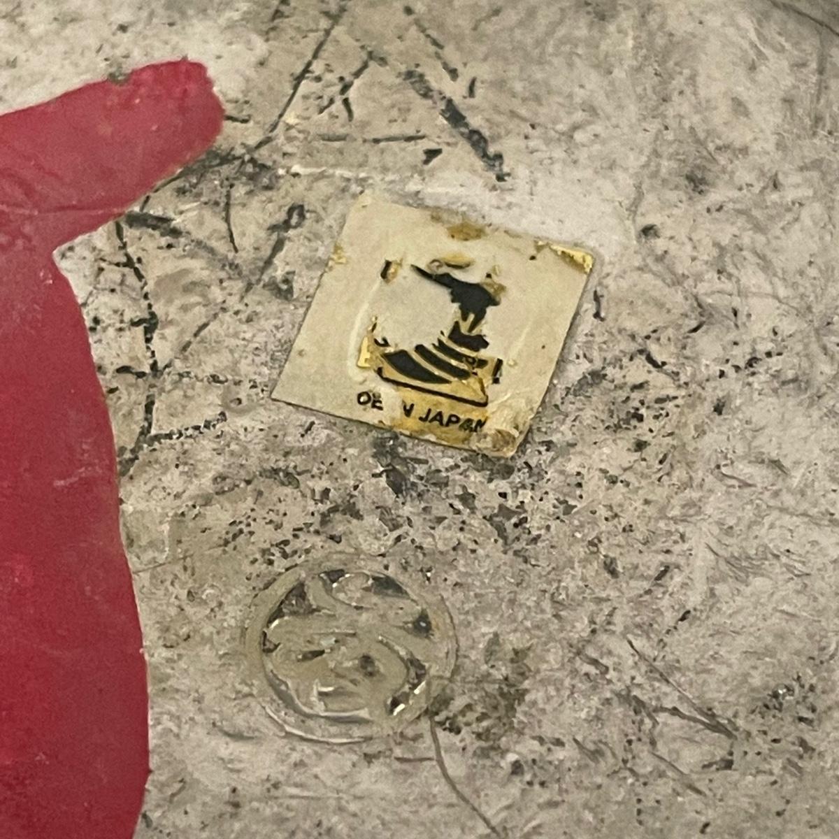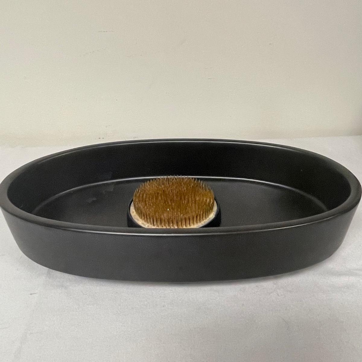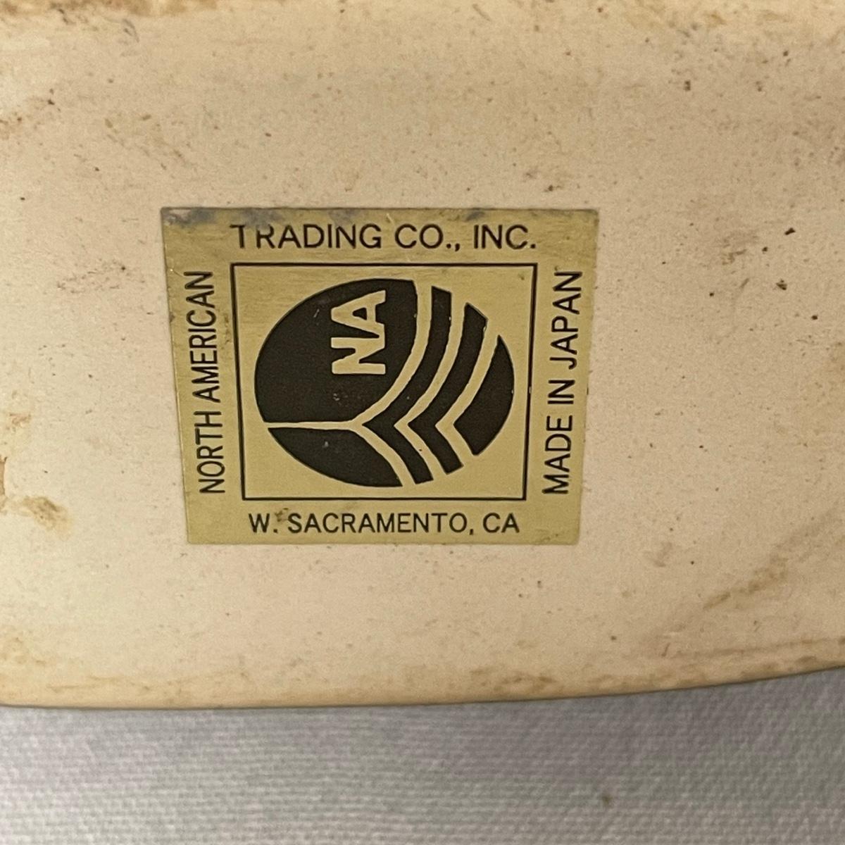 This ceramic duo have a black matte glaze and both have removable metal flower holders that fit in the vase. The moon shaped piece has its label intact (other sticker is partially worn off) that state North America Trading Company, Made in Japan. The flatter piece has two small areas where the glaze went slightly cloudy, see images.