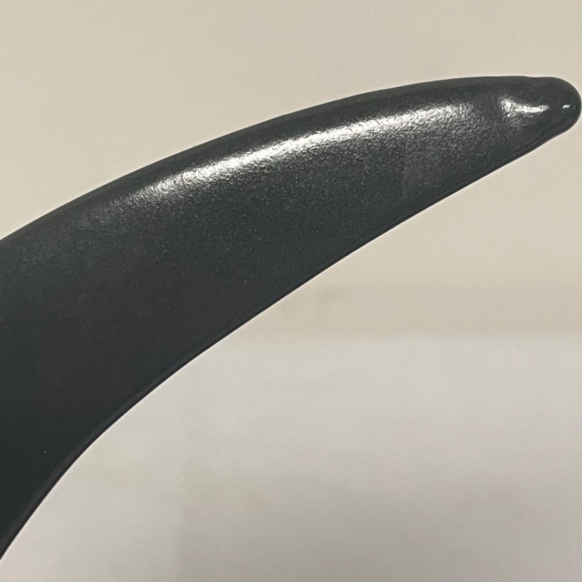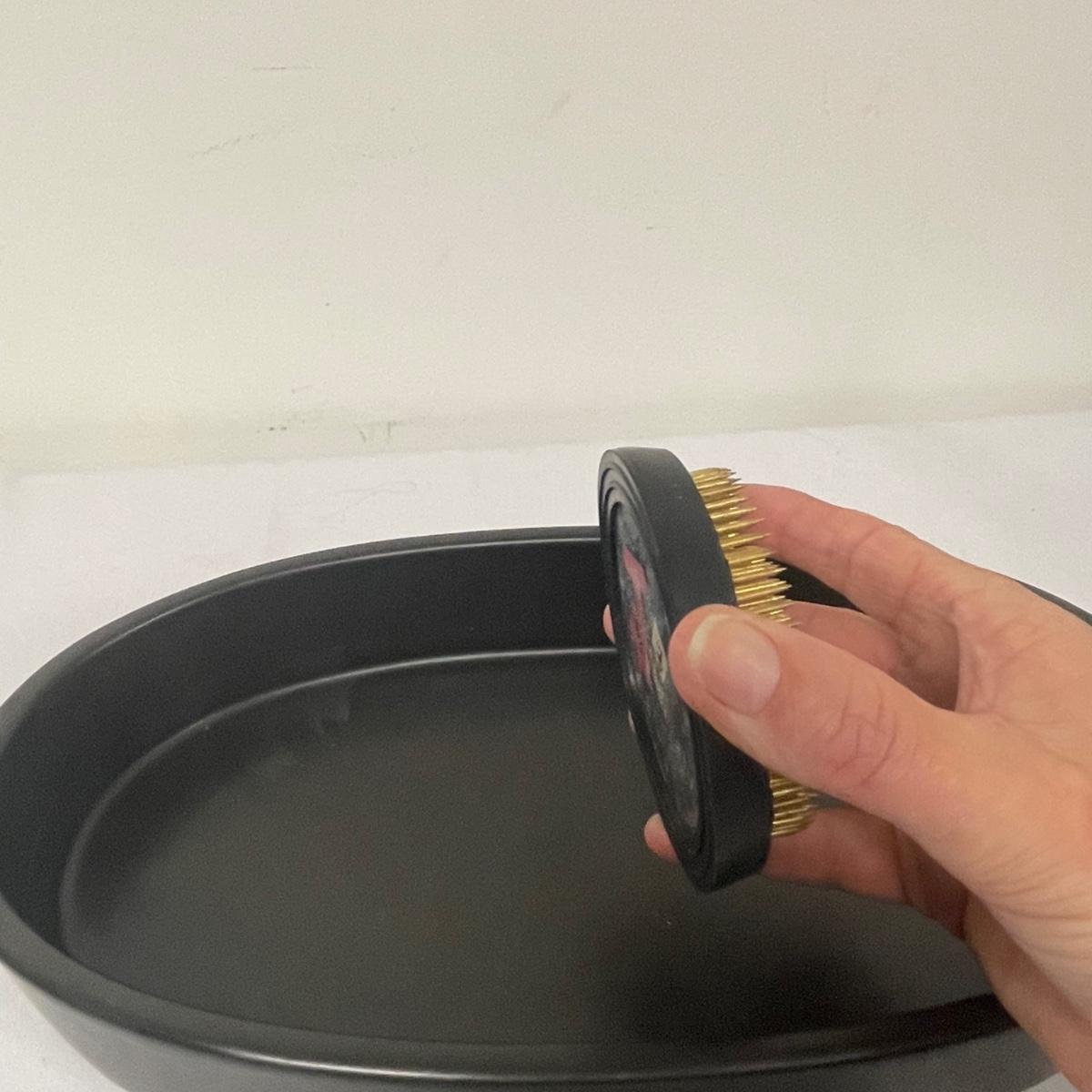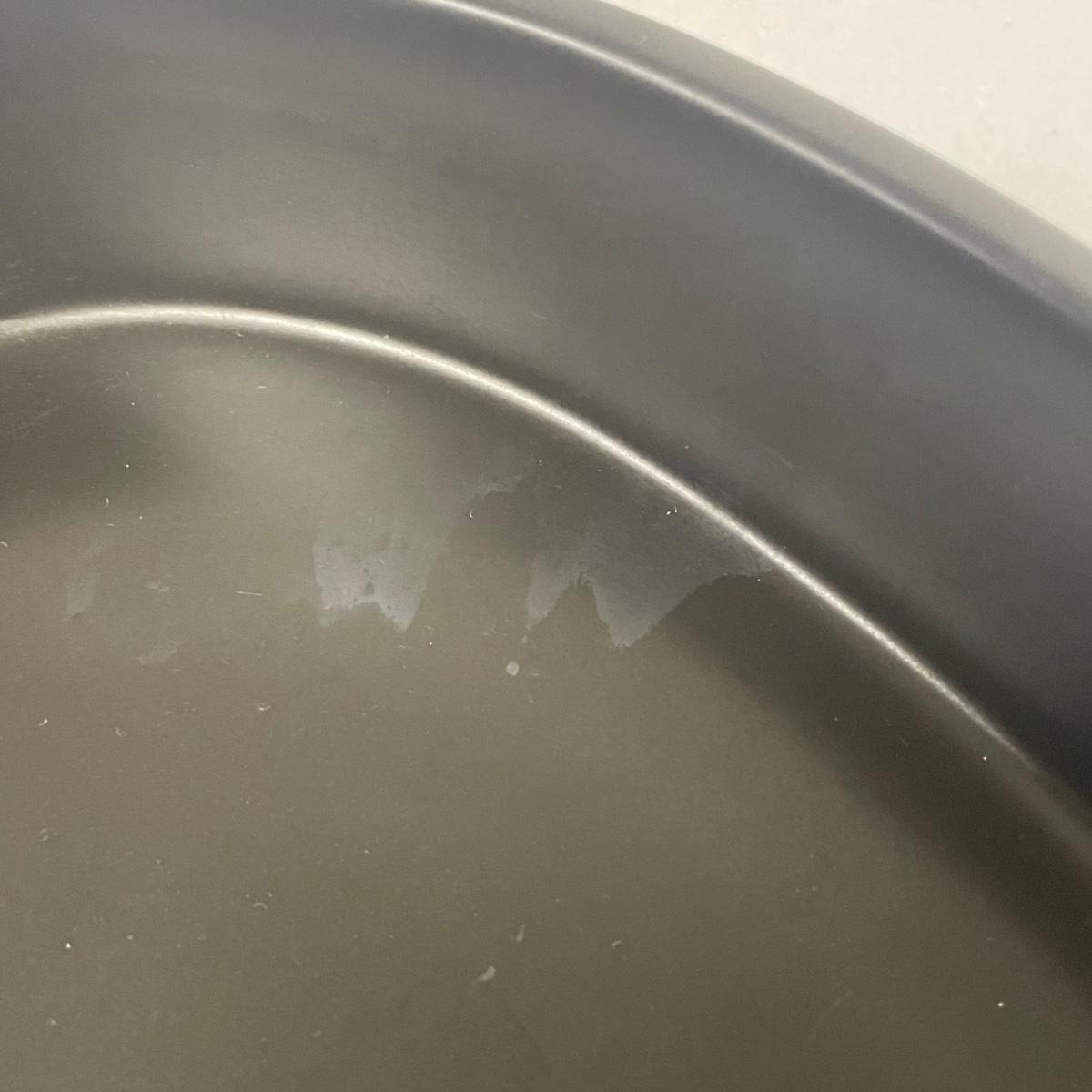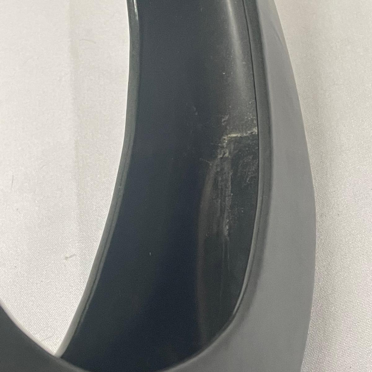 This ceramic duo have a black matte glaze and both have removable metal flower holders that fit in the vase. The moon shaped piece has its label intact (other sticker is partially worn off) that state North America Trading Company, Made in Japan. The flatter piece has two small areas where the glaze went slightly cloudy, see images.