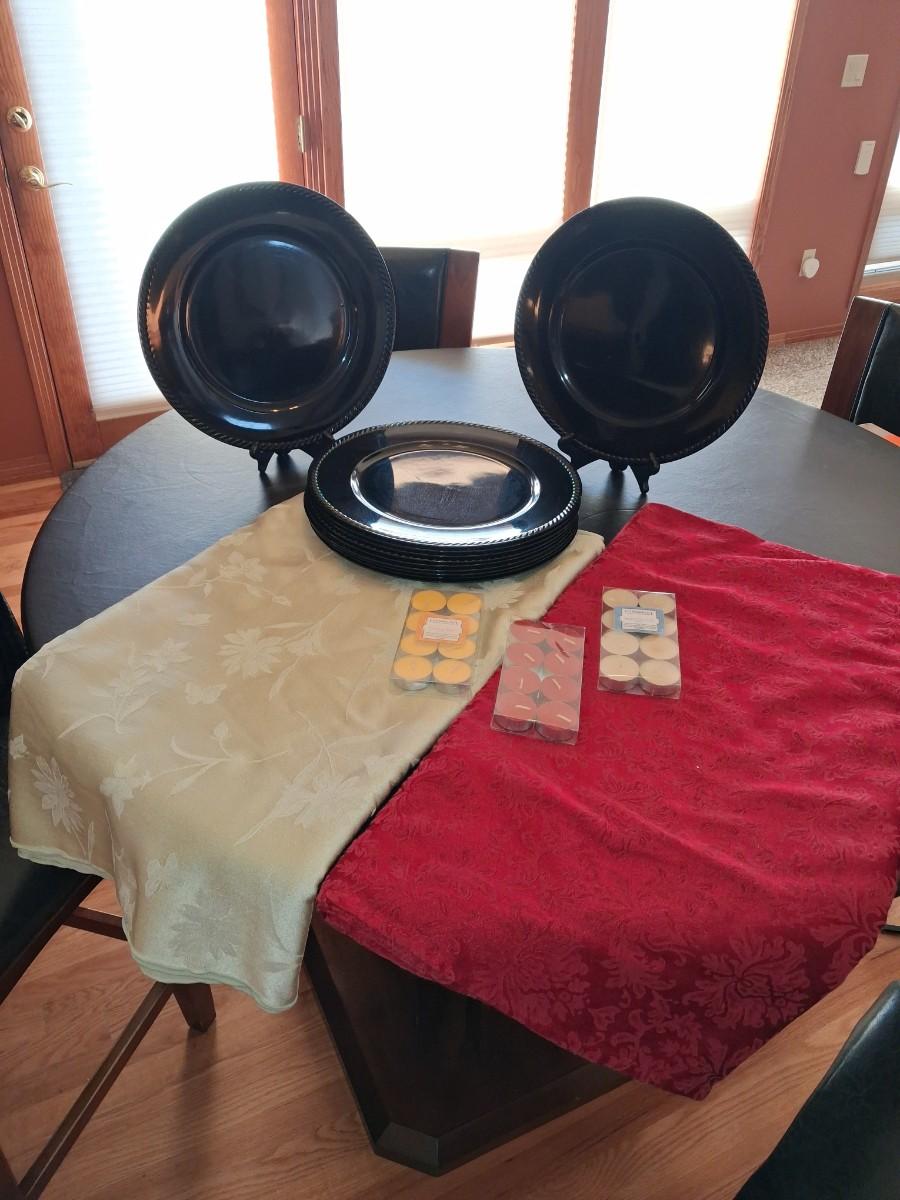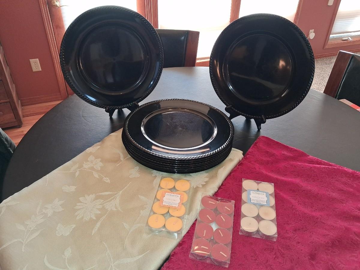 BLACK CHARGERS, 2 LINEN TABLECLOTHS AND VOTIVE CANDLES
