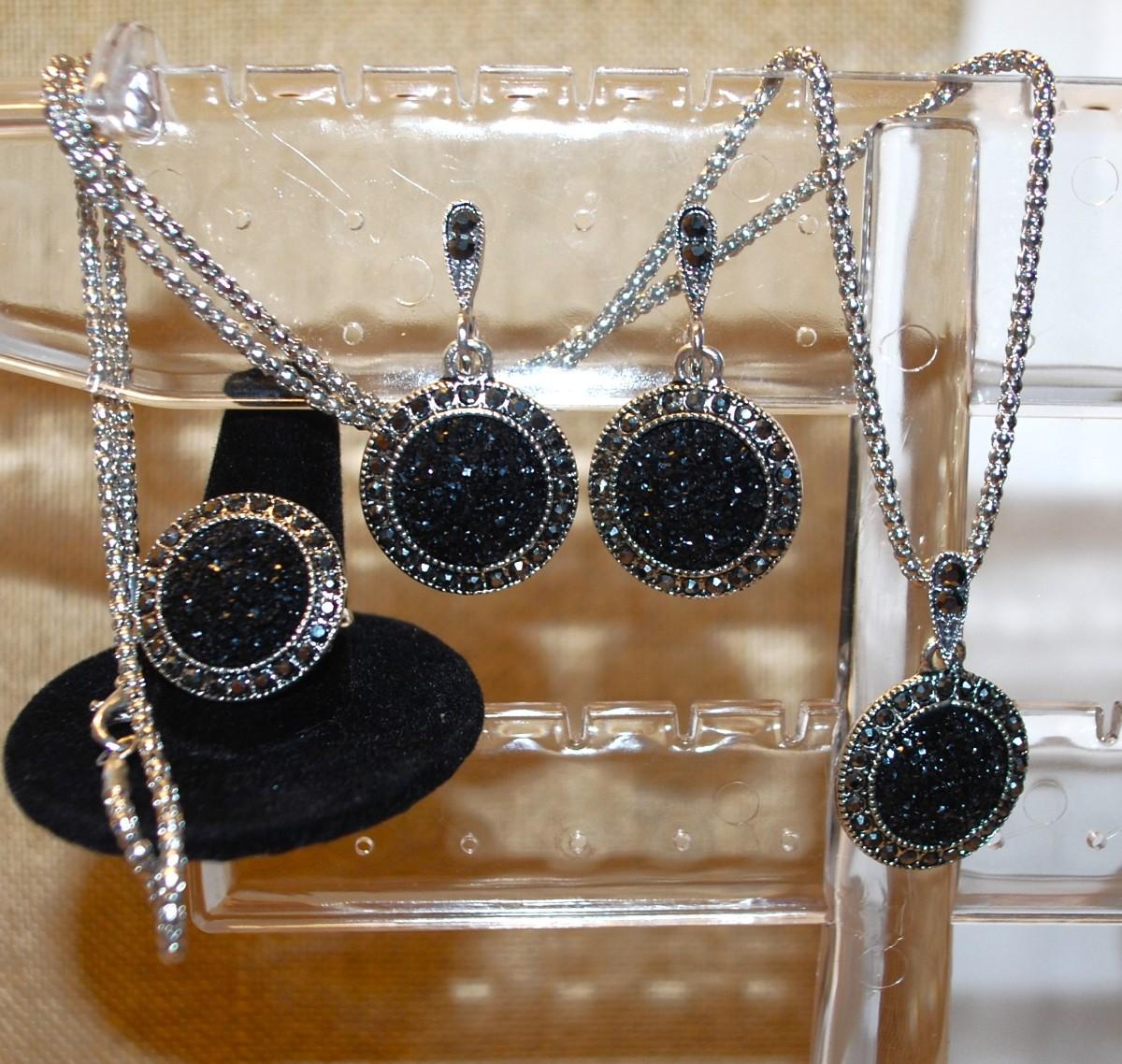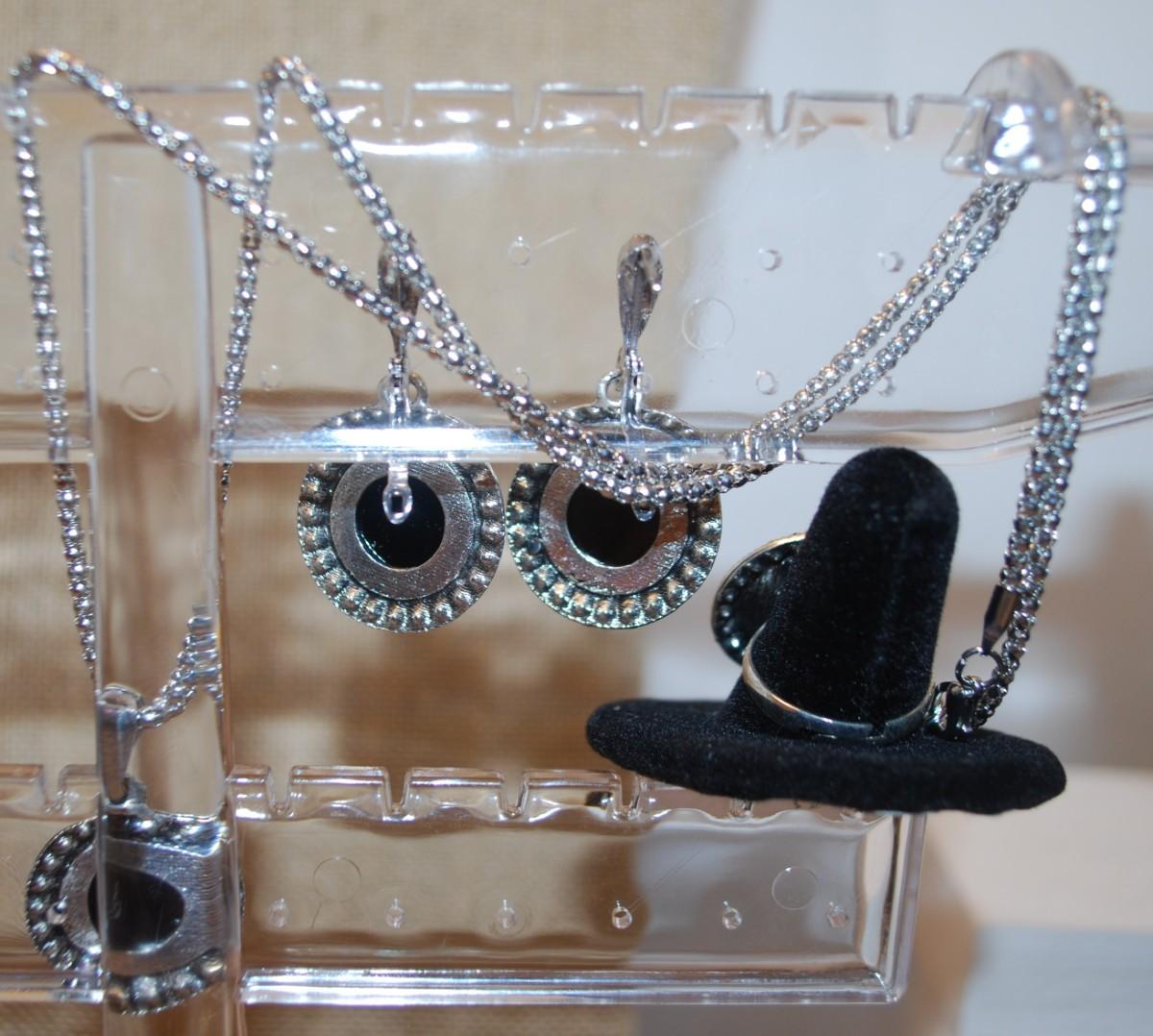 Black Circles JEWELRY SET Includes Earrings (1" Circ.) with English Lock; ADJUSTABLE Size 8 Ring & PENDANT (1" Circ.) on a Silver Tone Necklace Chain 24" L