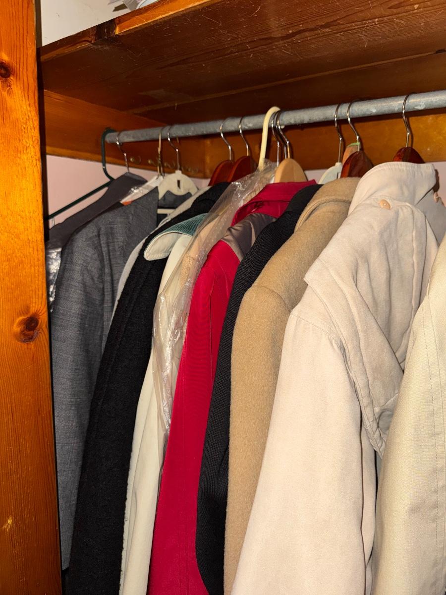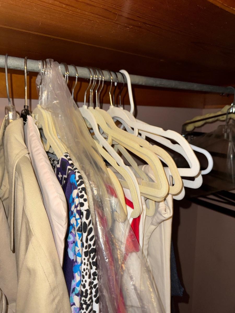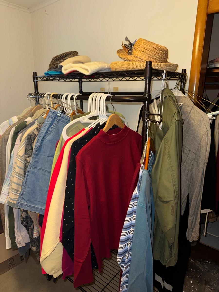 BLACK CLOTHING RACK, CONTENTS, CLOSET