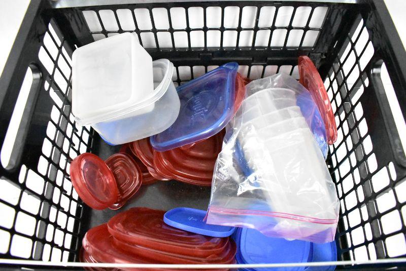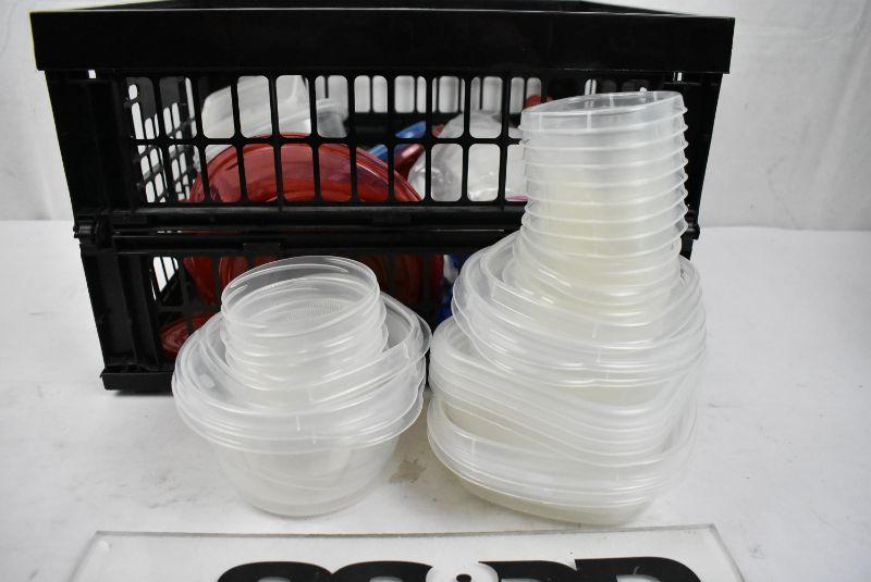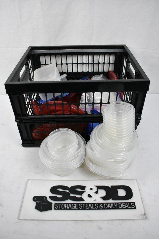Black Crate of Misc Food Containers and Lids