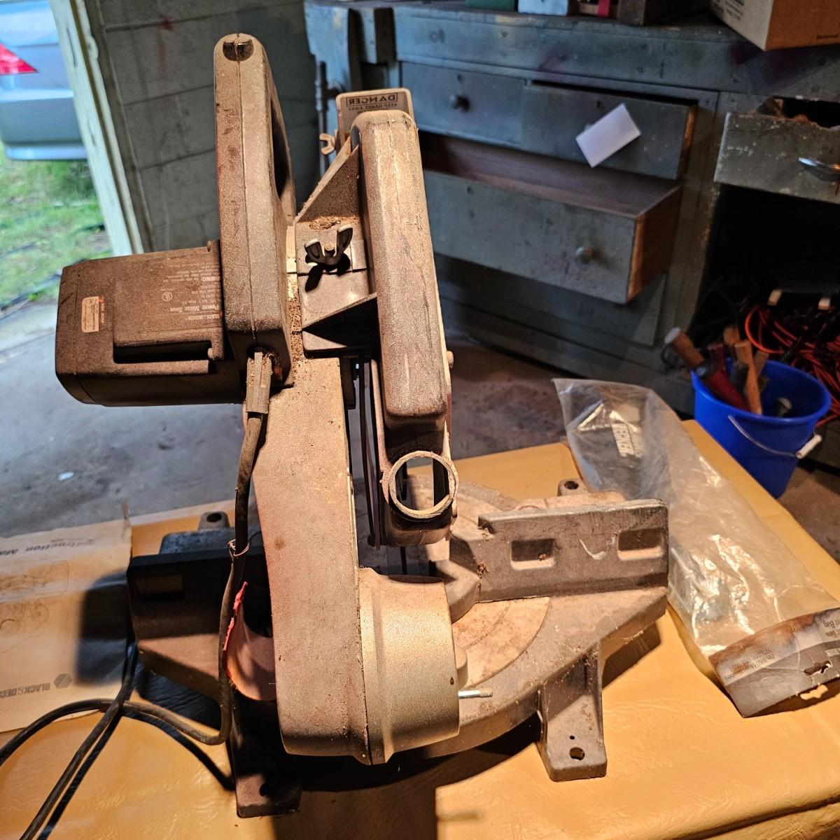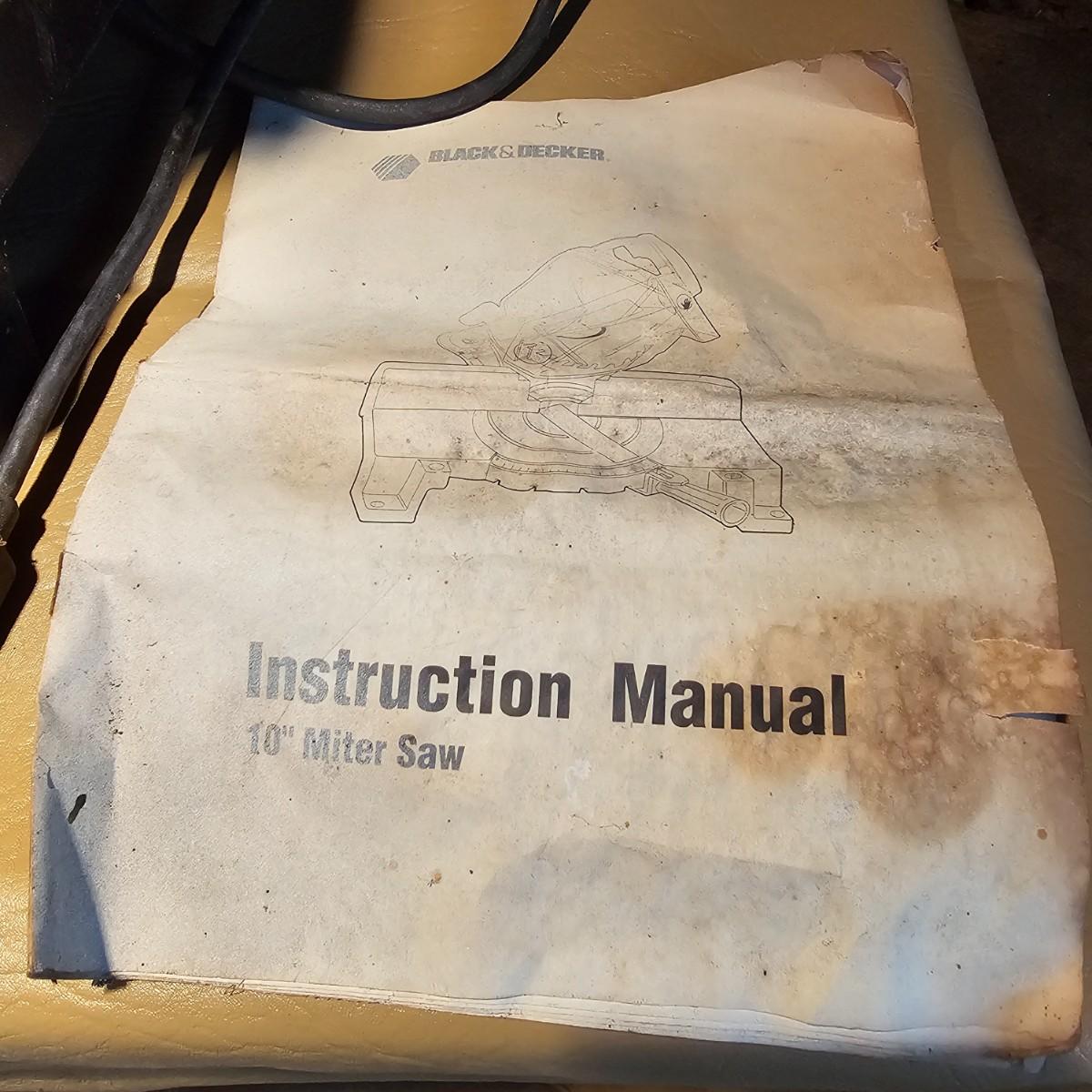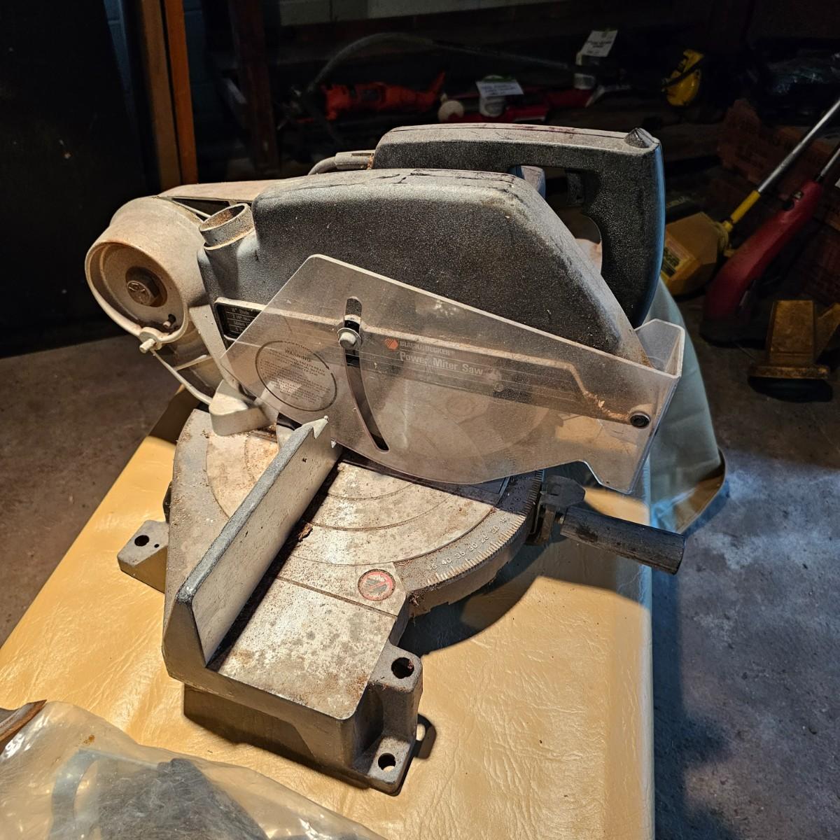 A 10" miter saw by Black & Decker. Adjustable miter up to 45°, blade guard, dust bag. Includes instruction manual. Item powered on when plugged in. See photos for details. Local pickup only.