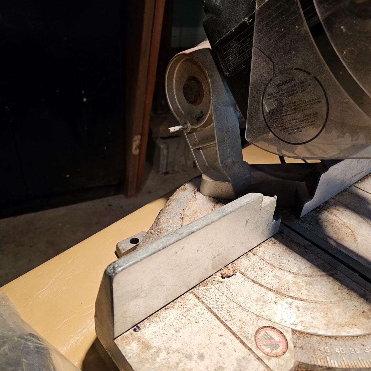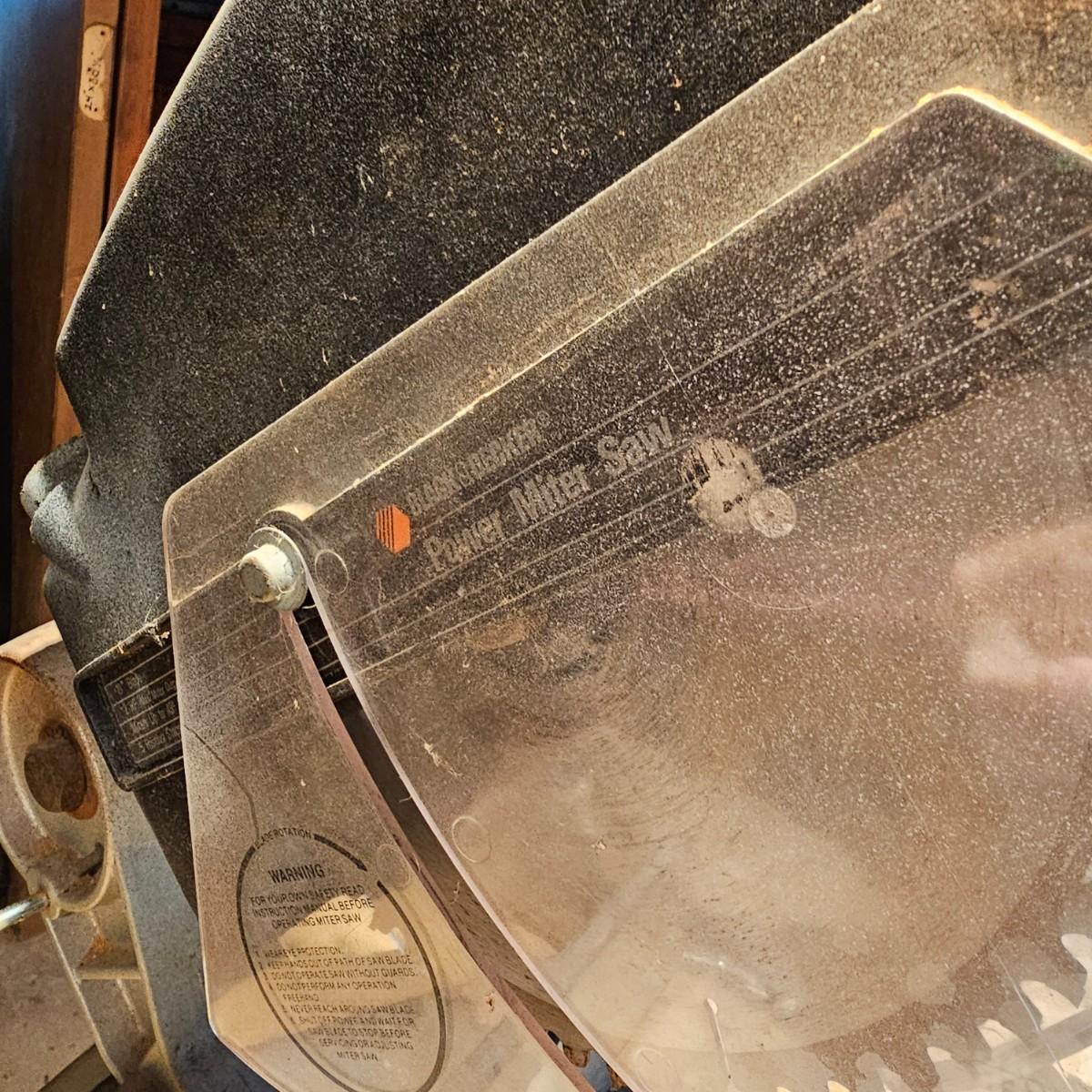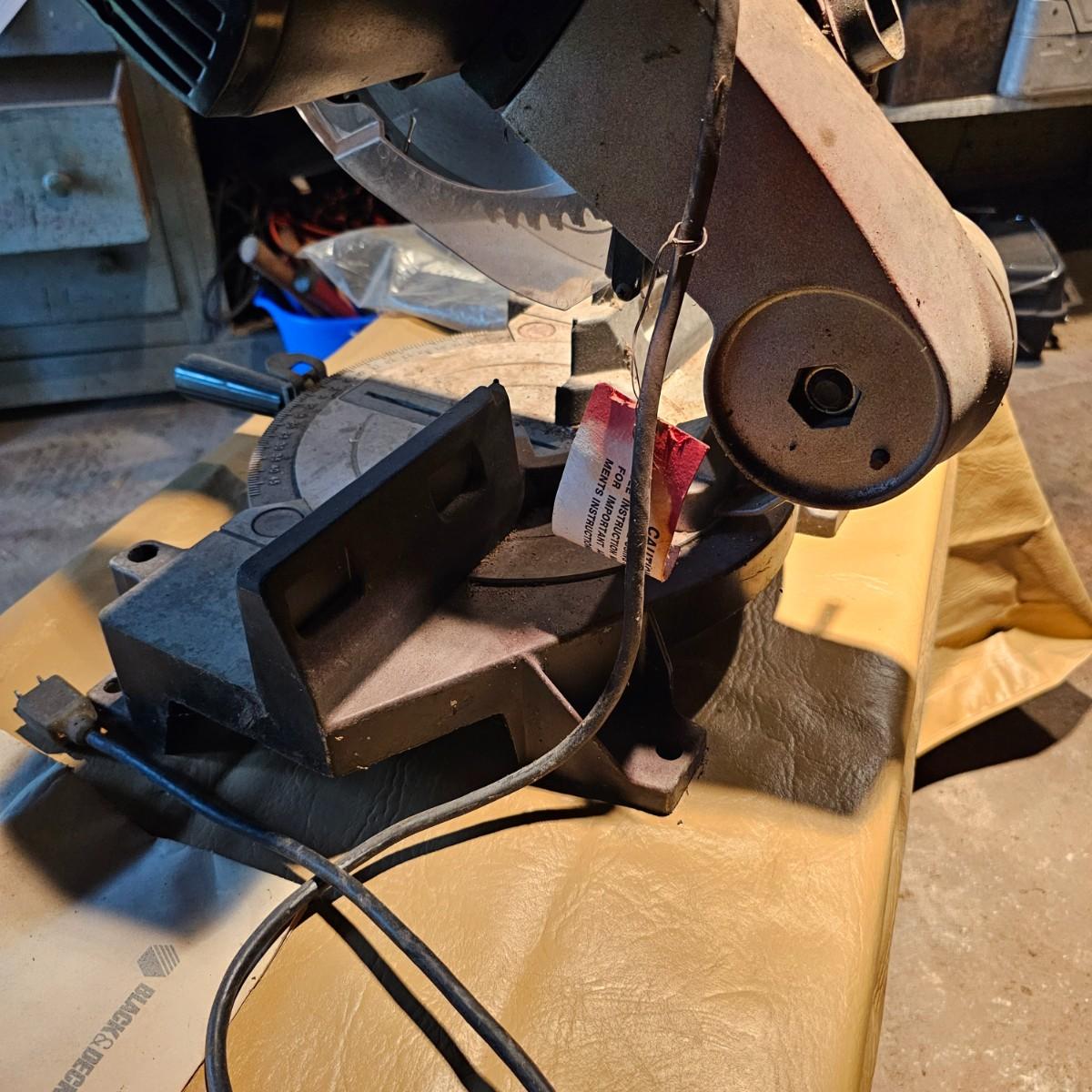 A 10" miter saw by Black & Decker. Adjustable miter up to 45°, blade guard, dust bag. Includes instruction manual. Item powered on when plugged in. See photos for details. Local pickup only.