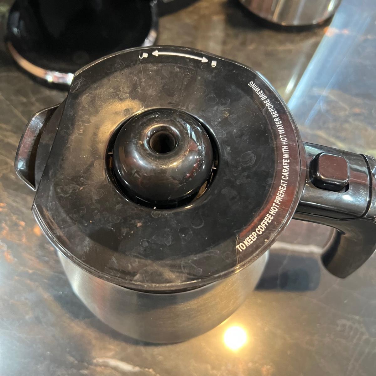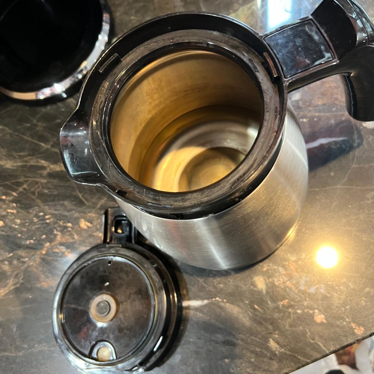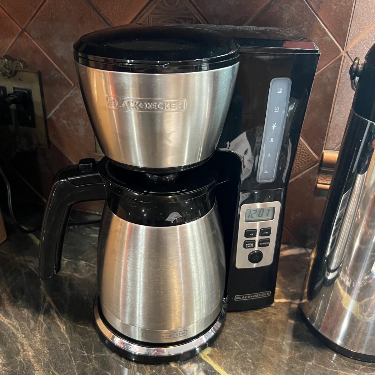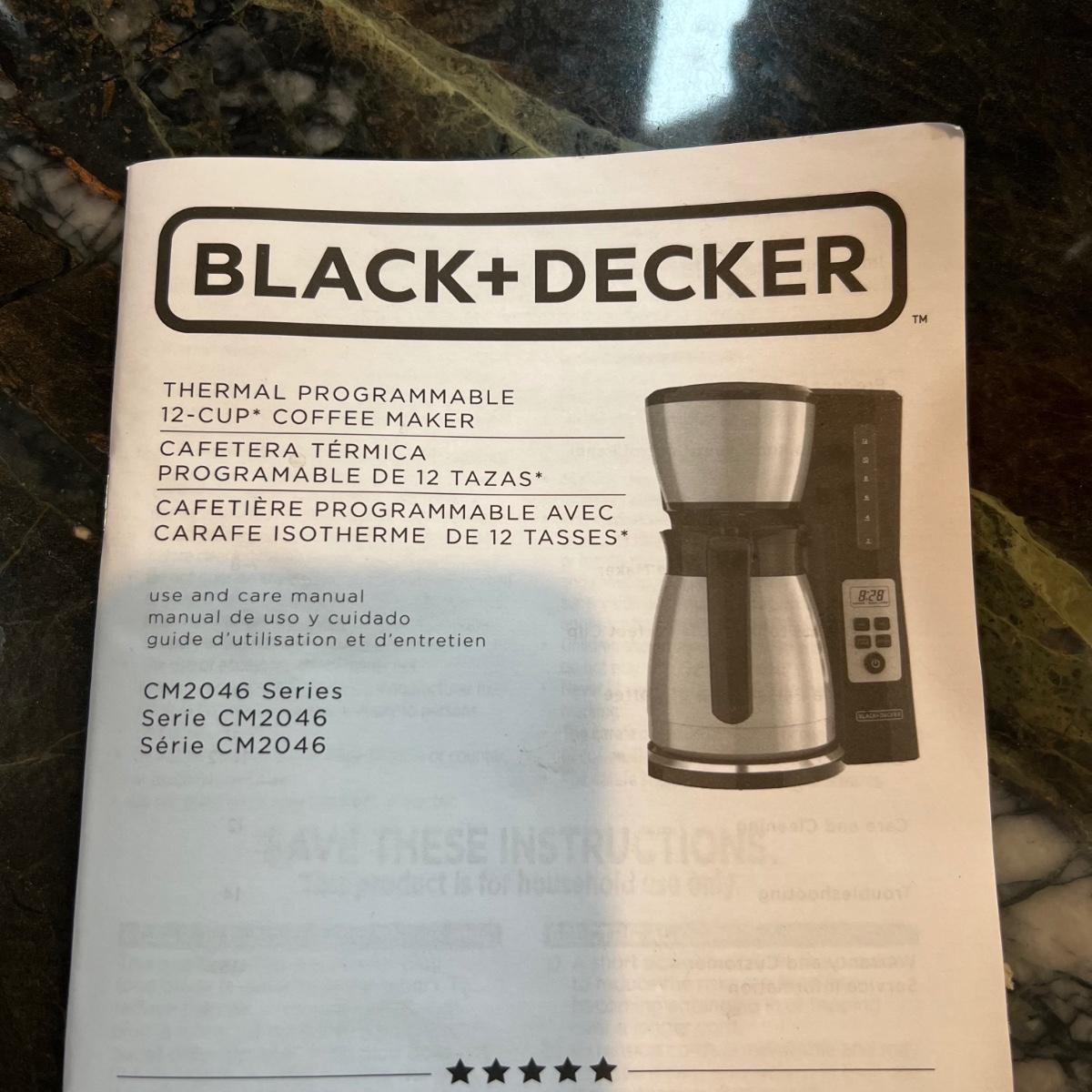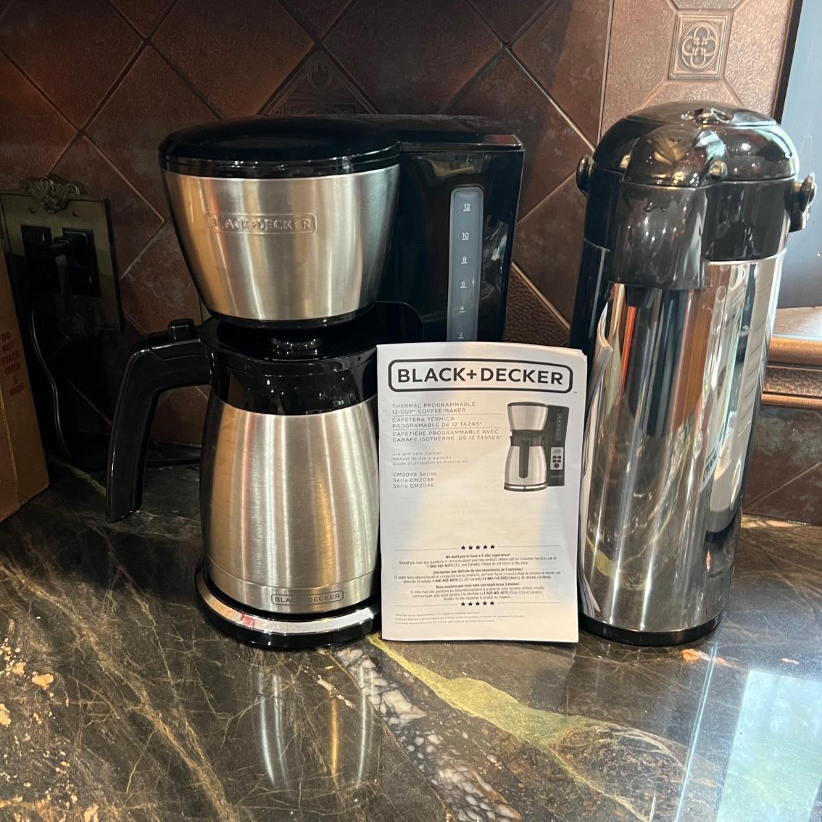 This Black + Decker 12 cup programmable thermal coffee maker powered on when plugged in and comes with manual. It’s been paired with a thermos pump pot.