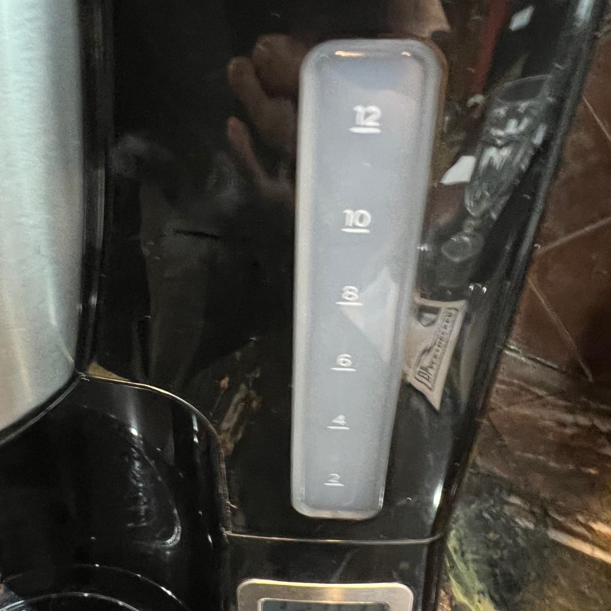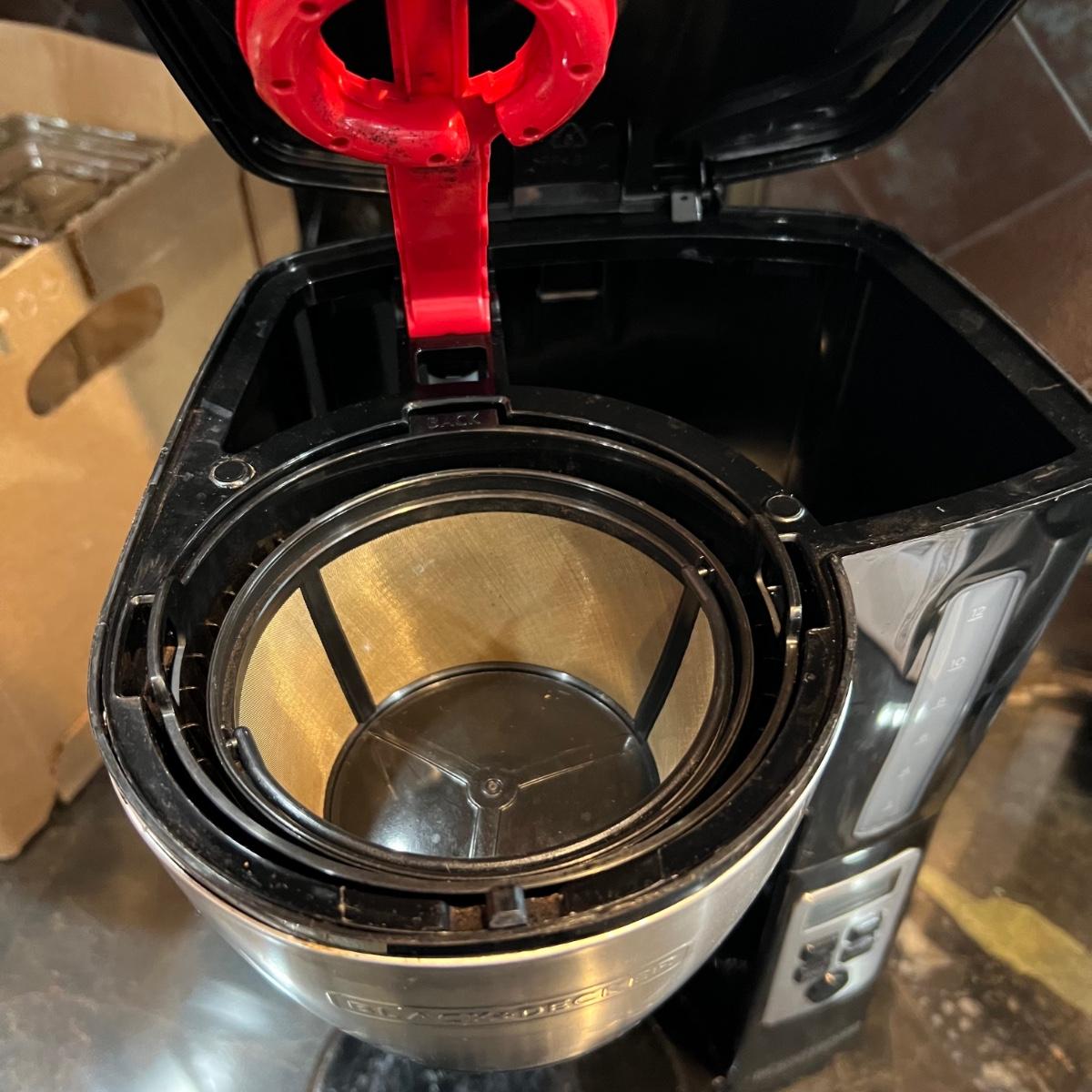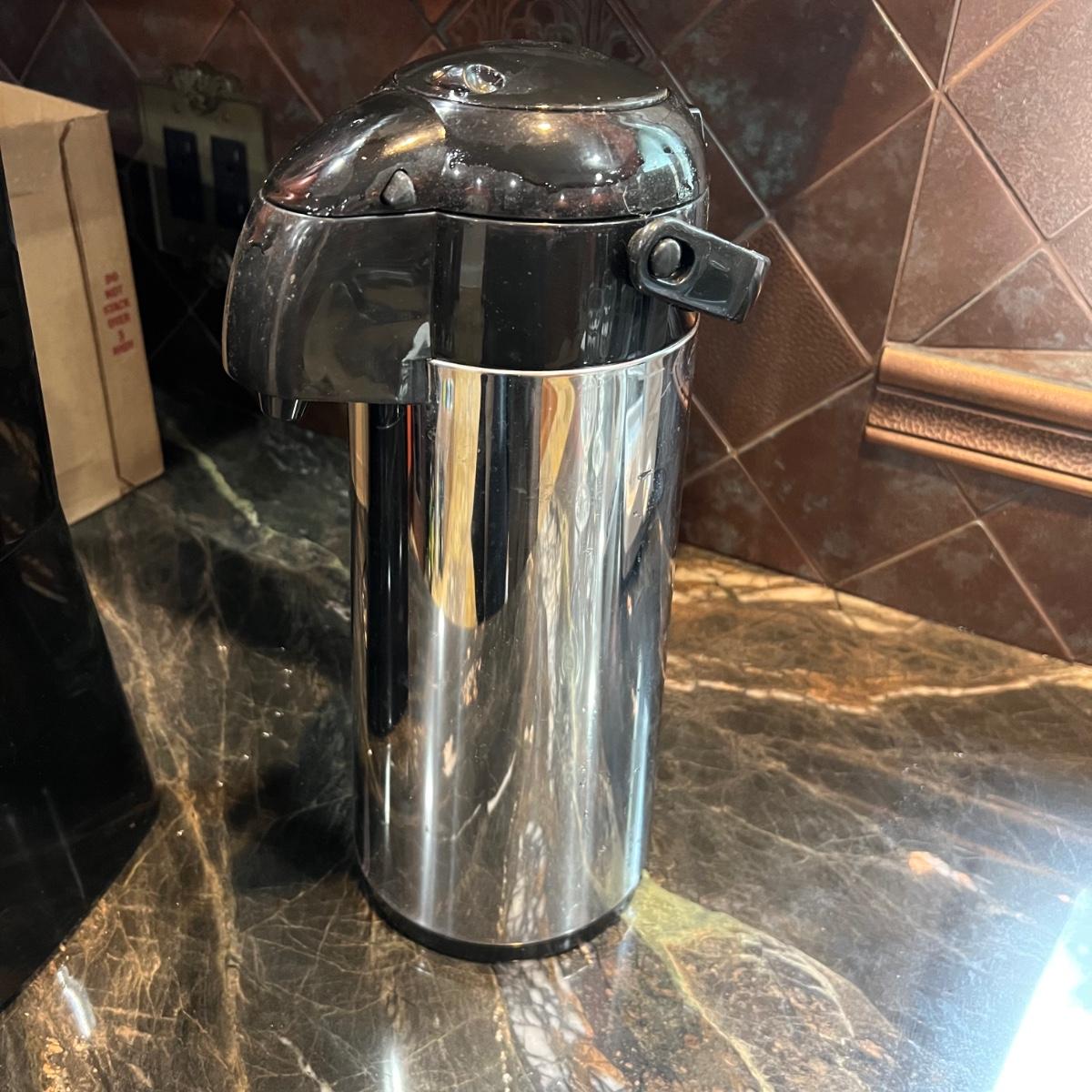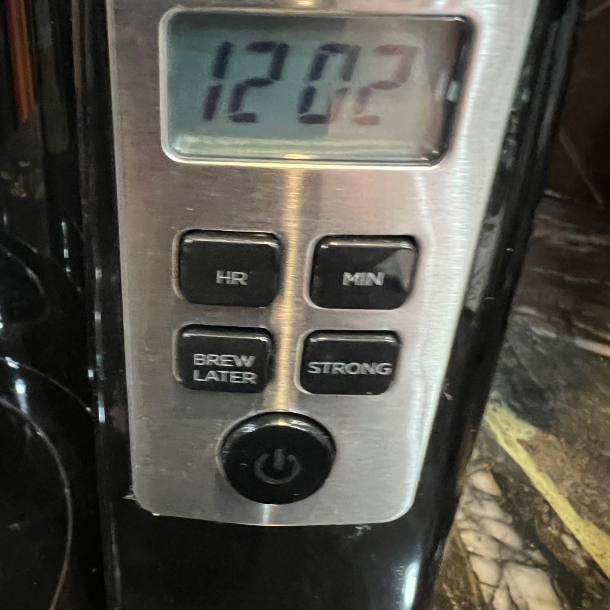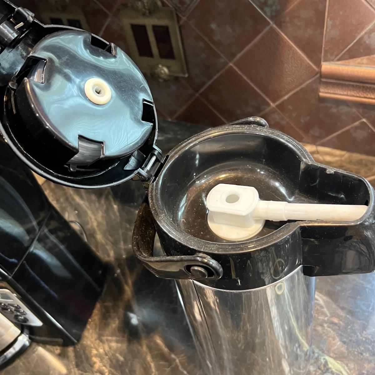This Black + Decker 12 cup programmable thermal coffee maker powered on when plugged in and comes with manual. It’s been paired with a thermos pump pot.