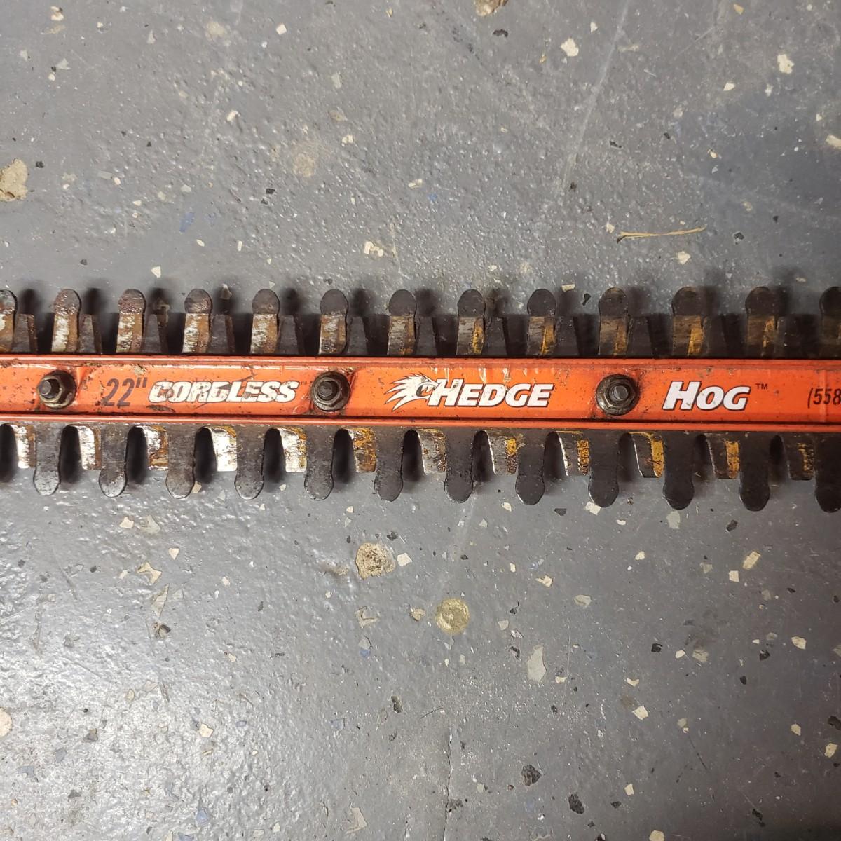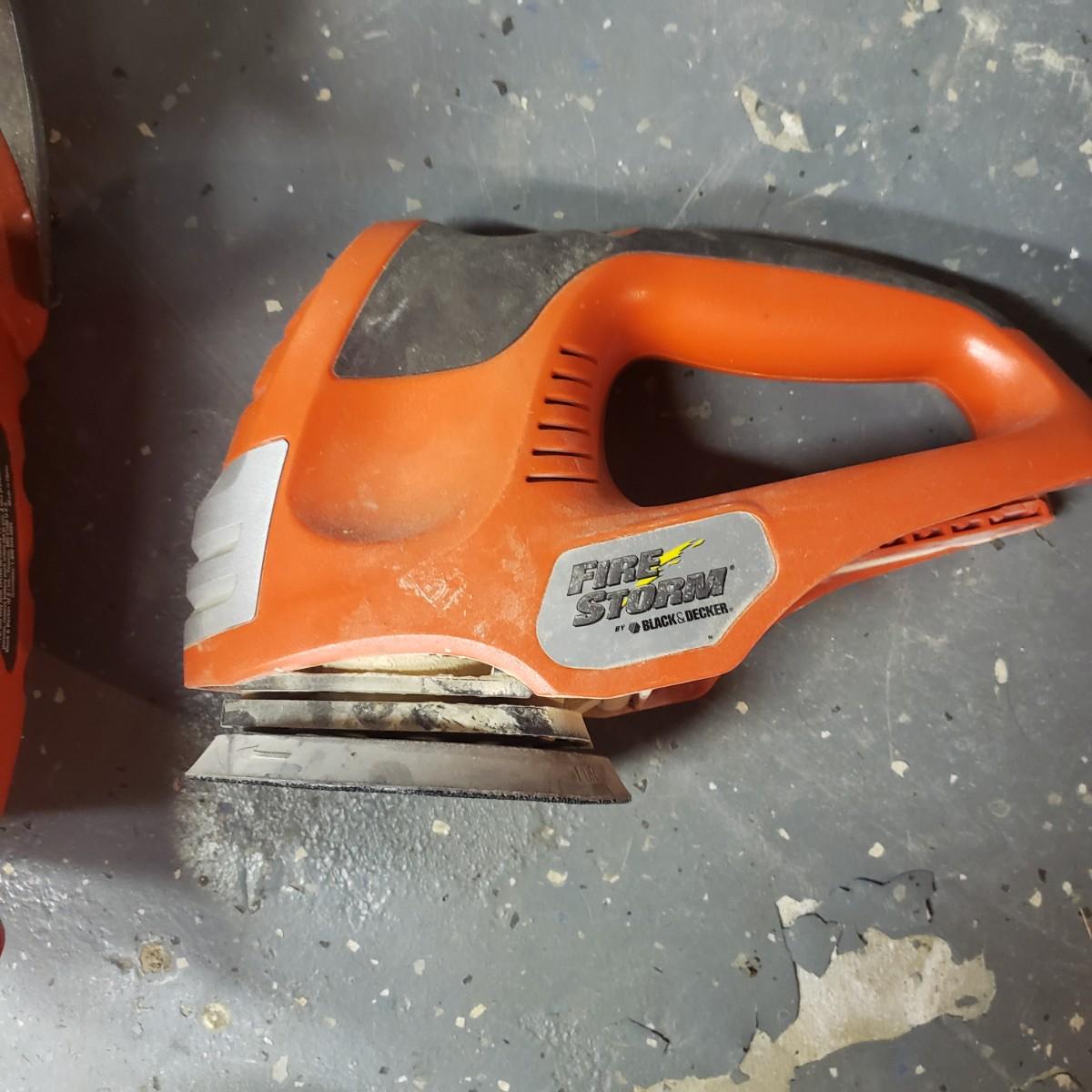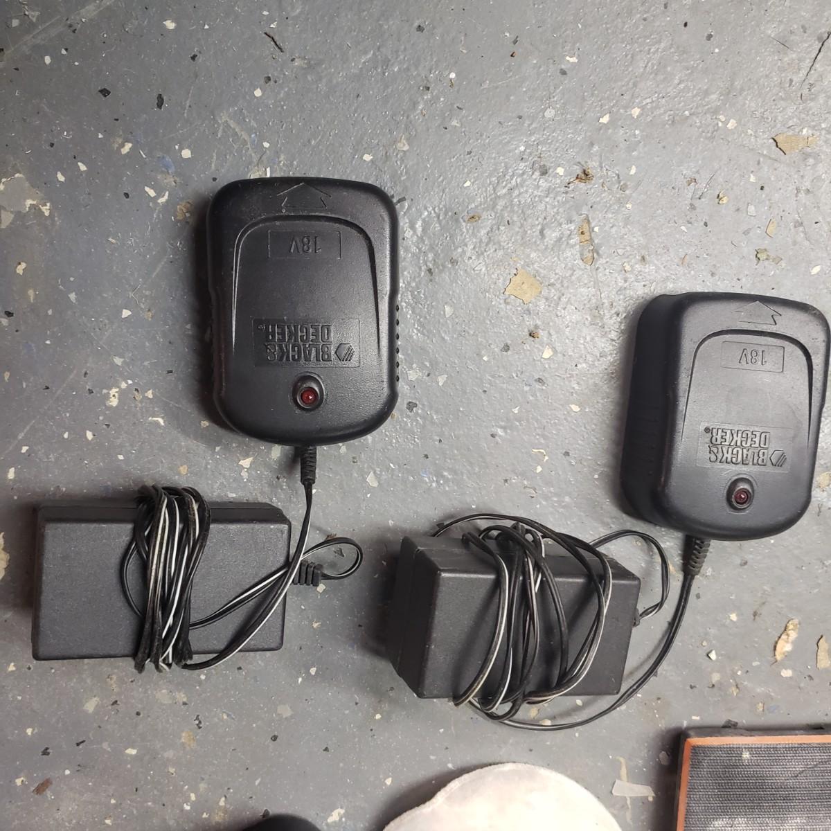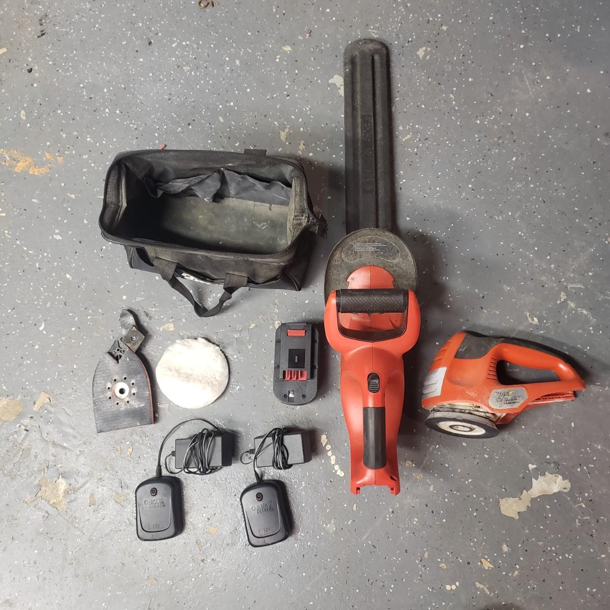 This Black & Decker battery operated lot features a hedge trimmer and sander. Lot comes with one battery and two charging plug ins. The sander comes with a removable plate for circular or iron shaped piece. The sander fits in a bag with chargers and battery. Both machines power on with battery installed.