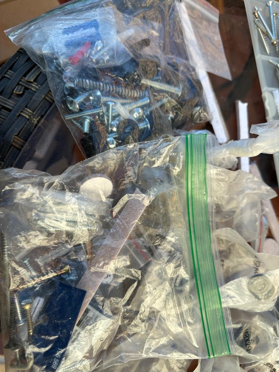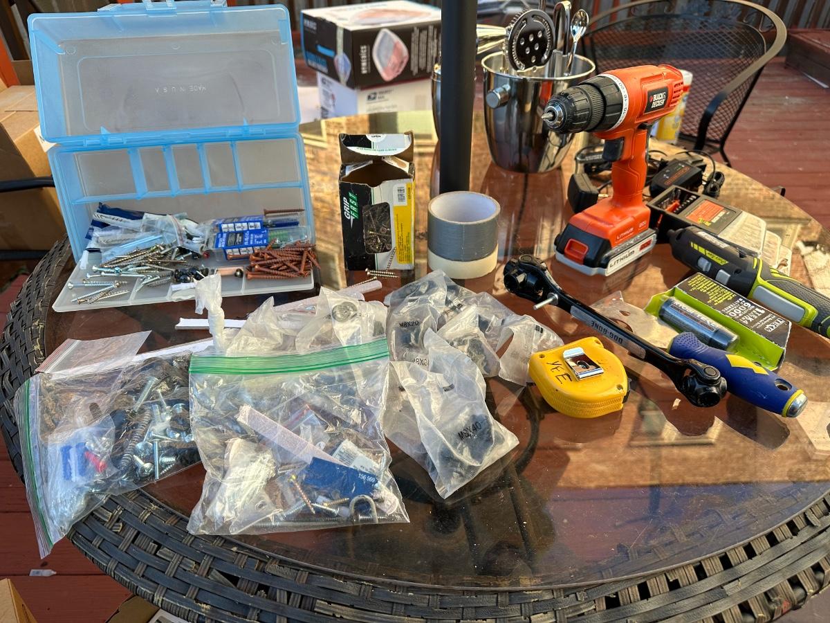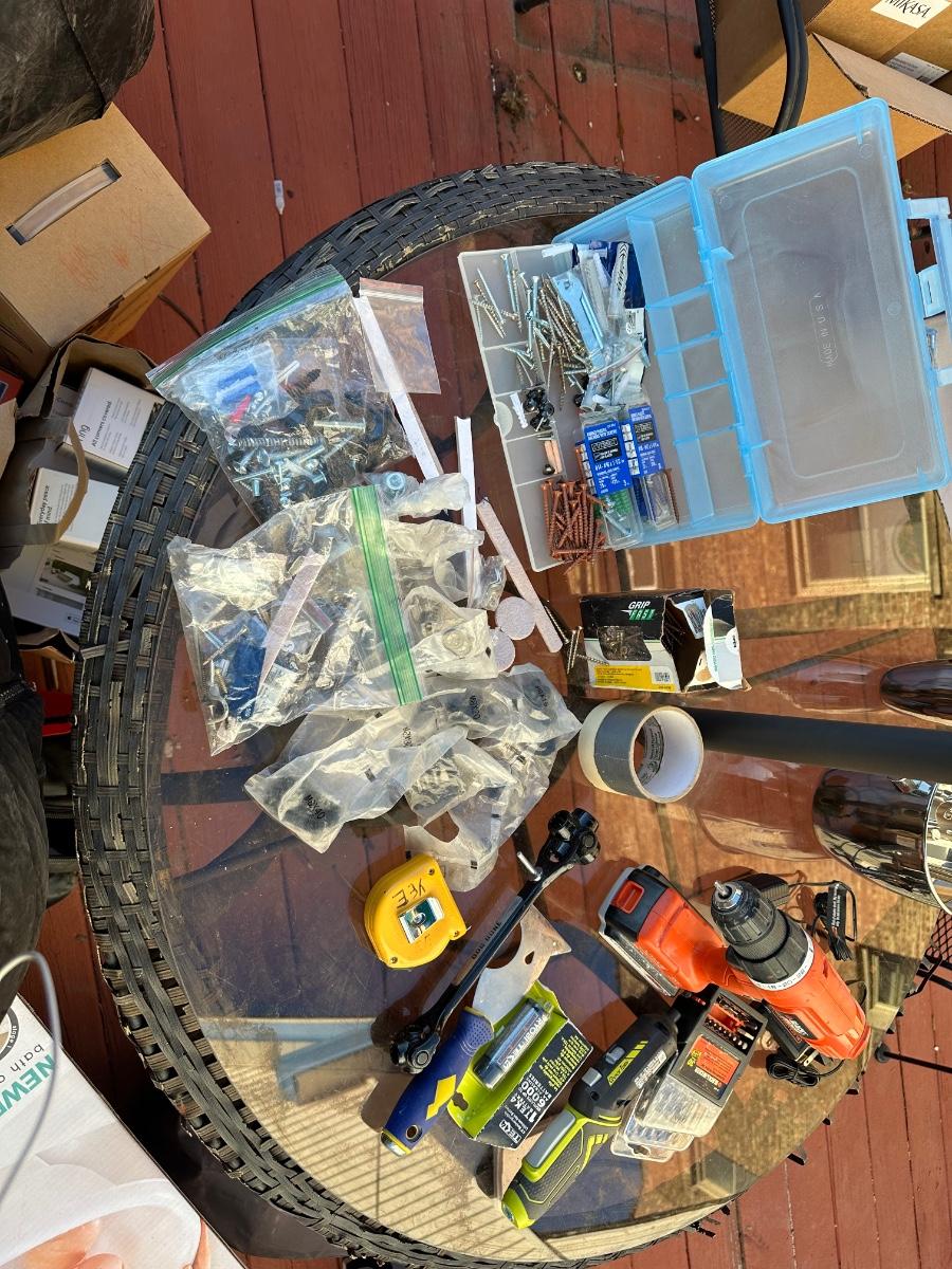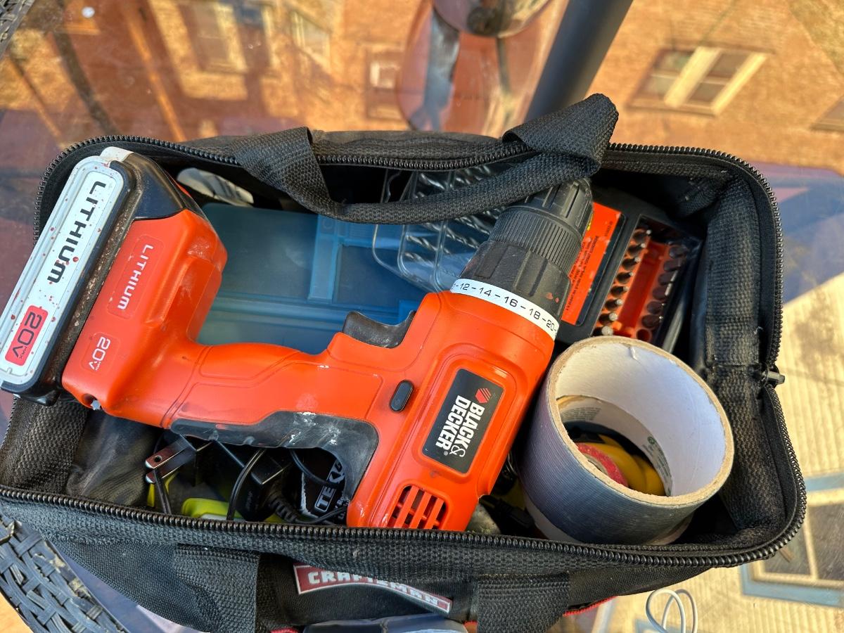 Cordless drill with bag and tons of accessories and screws for all needs.