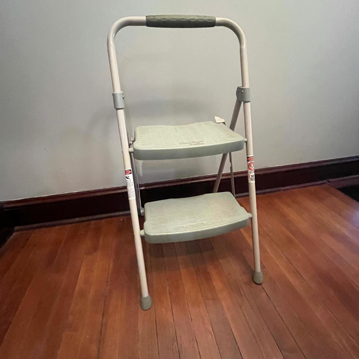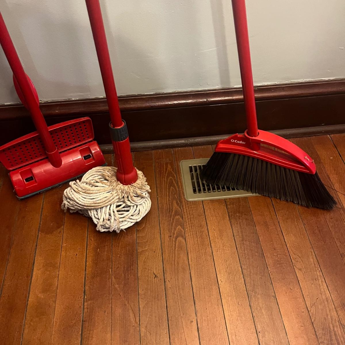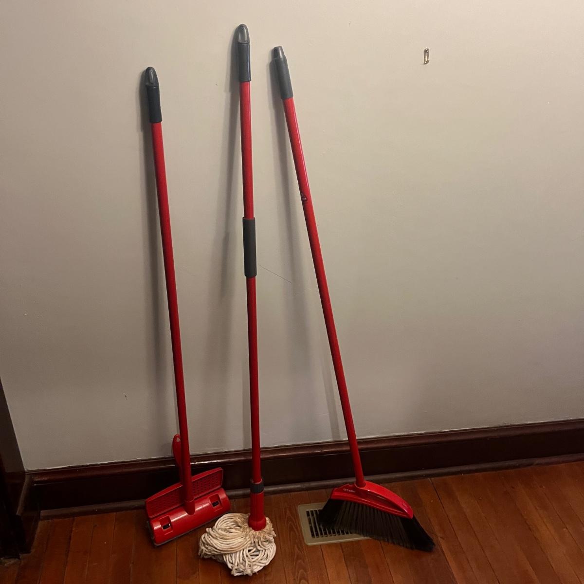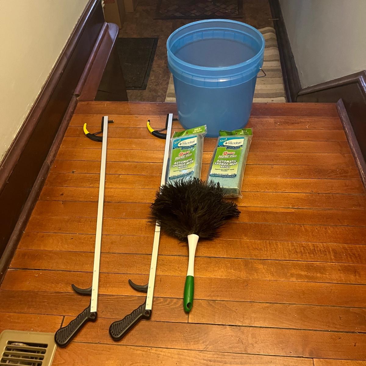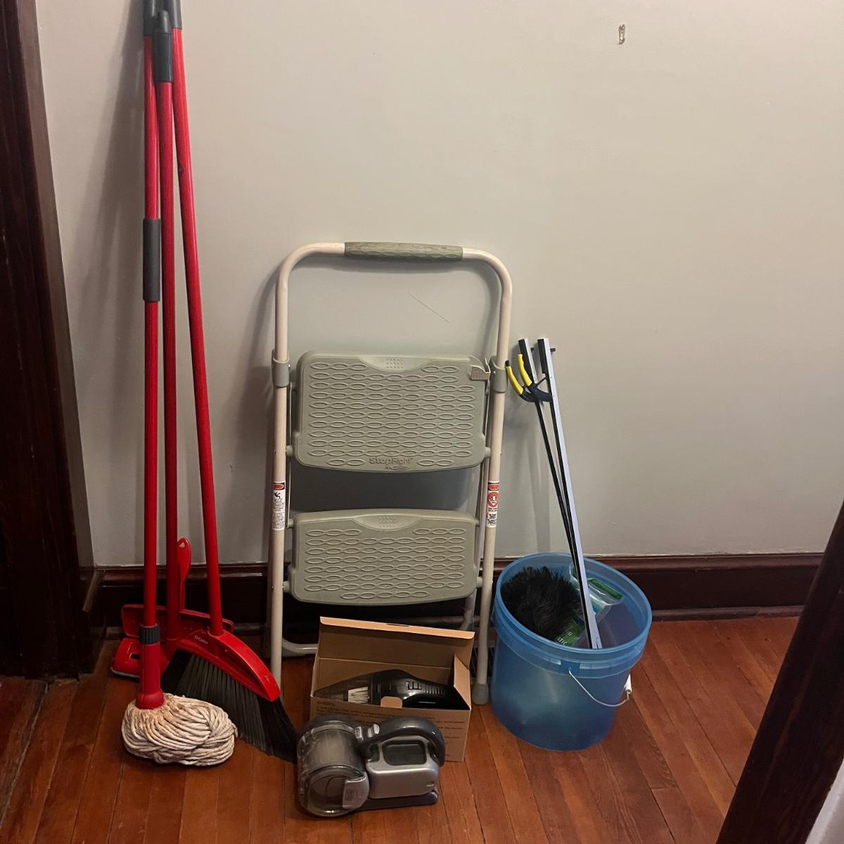 Lot includes a Black & Decker Cordless vacuum, unbranded cordless vacuum, two grabbers, plastic bucket, duster, two mop heads, Werner step ladder, O’Cedar broom and two O’Cedar mops. The twist mop head is worn/used and will need to be replaced.
