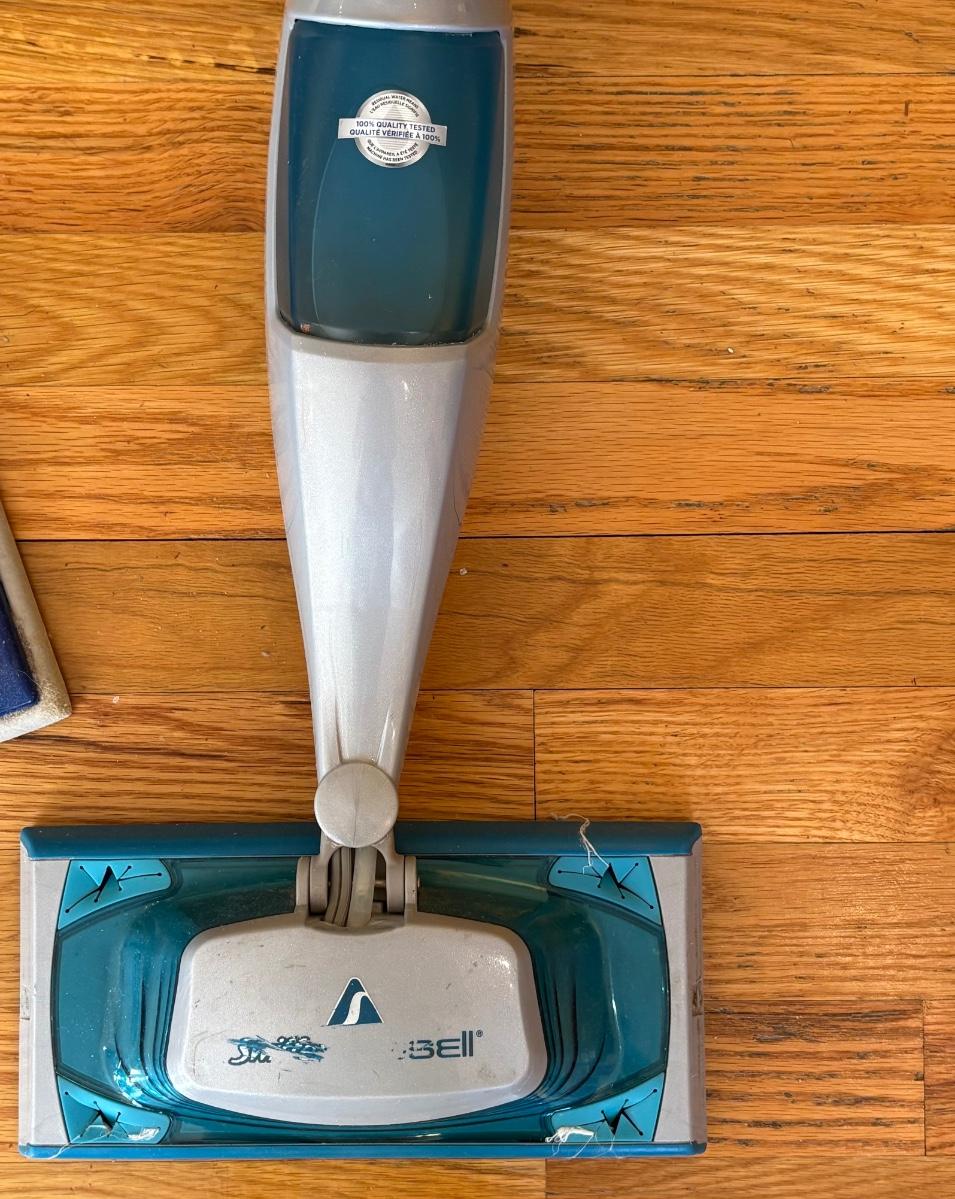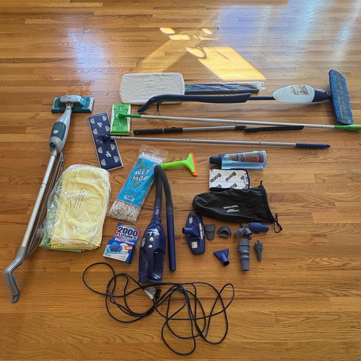 Cleaning supplies for rugs and floors. Bona system for wood floors, Swiffers in two sizes, microfiber cleaning cloths, and more. Carpet cleaner and dirt buster both powered on when plugged in. Local pickup only.